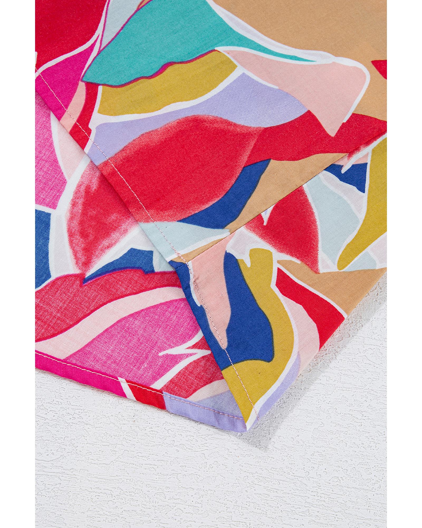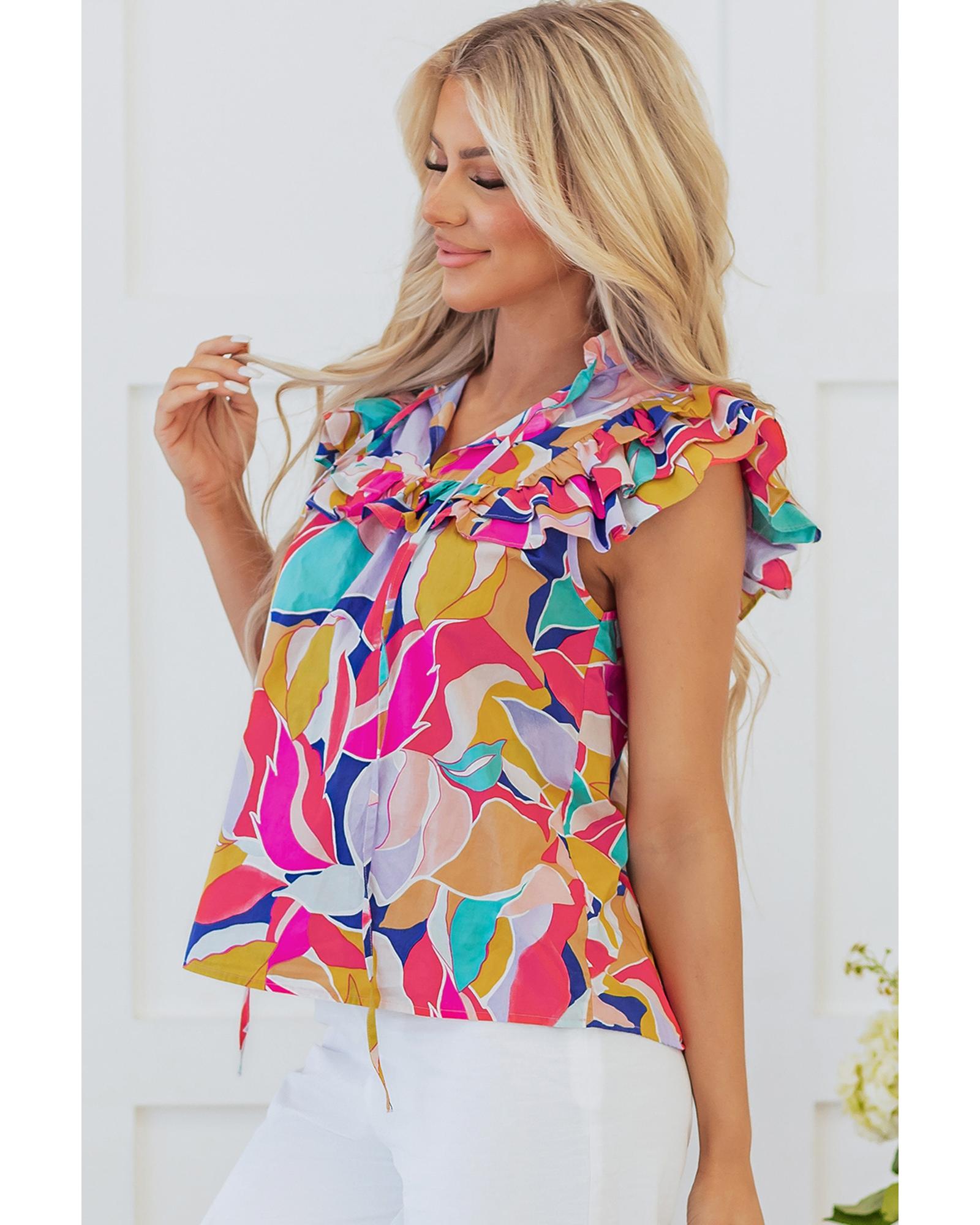 Pink Abstract Printed Ruffled Flutter Sleeve Tied Split V Neck Blouse – S