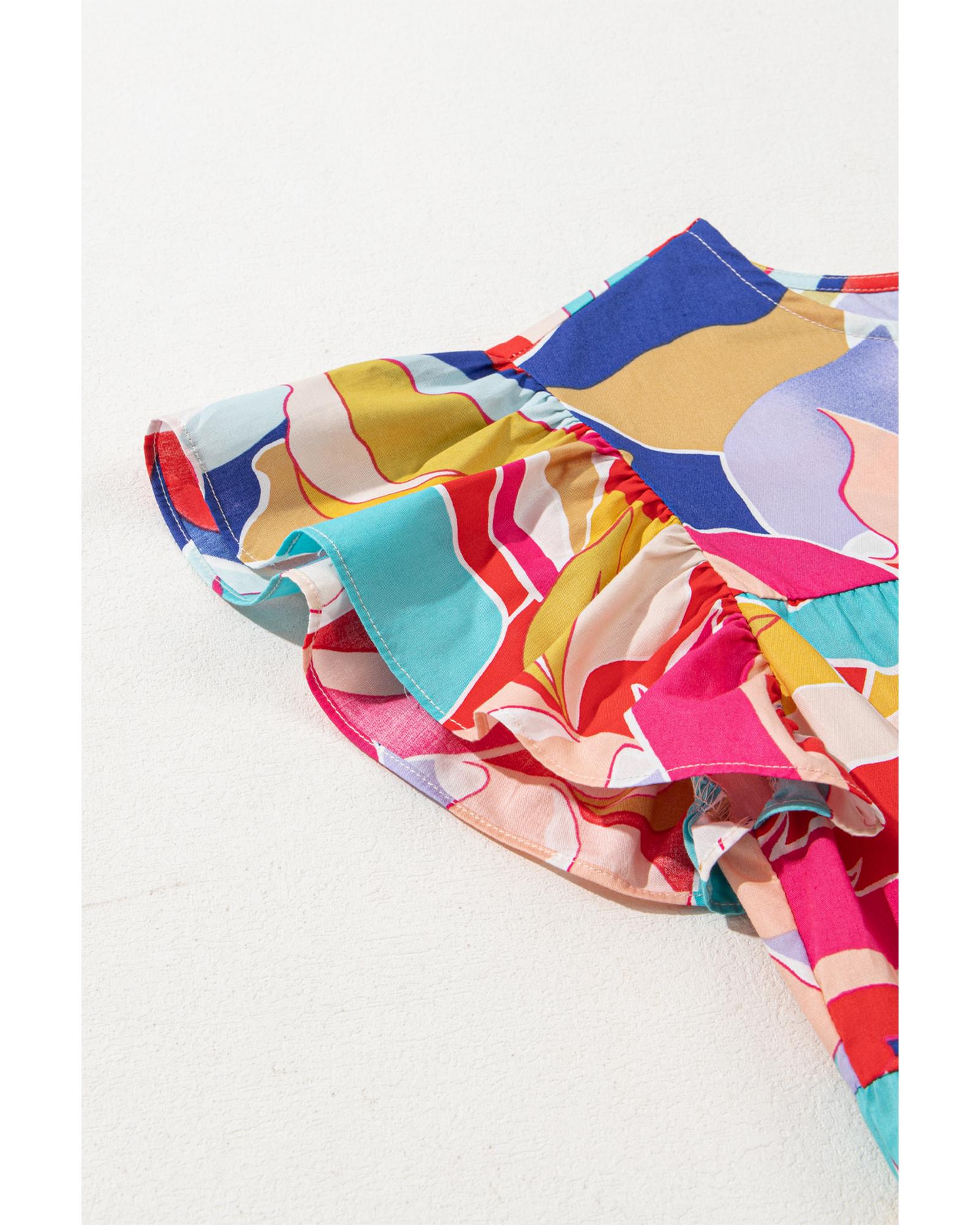 Pink Abstract Printed Ruffled Flutter Sleeve Tiered Mini Dress – S