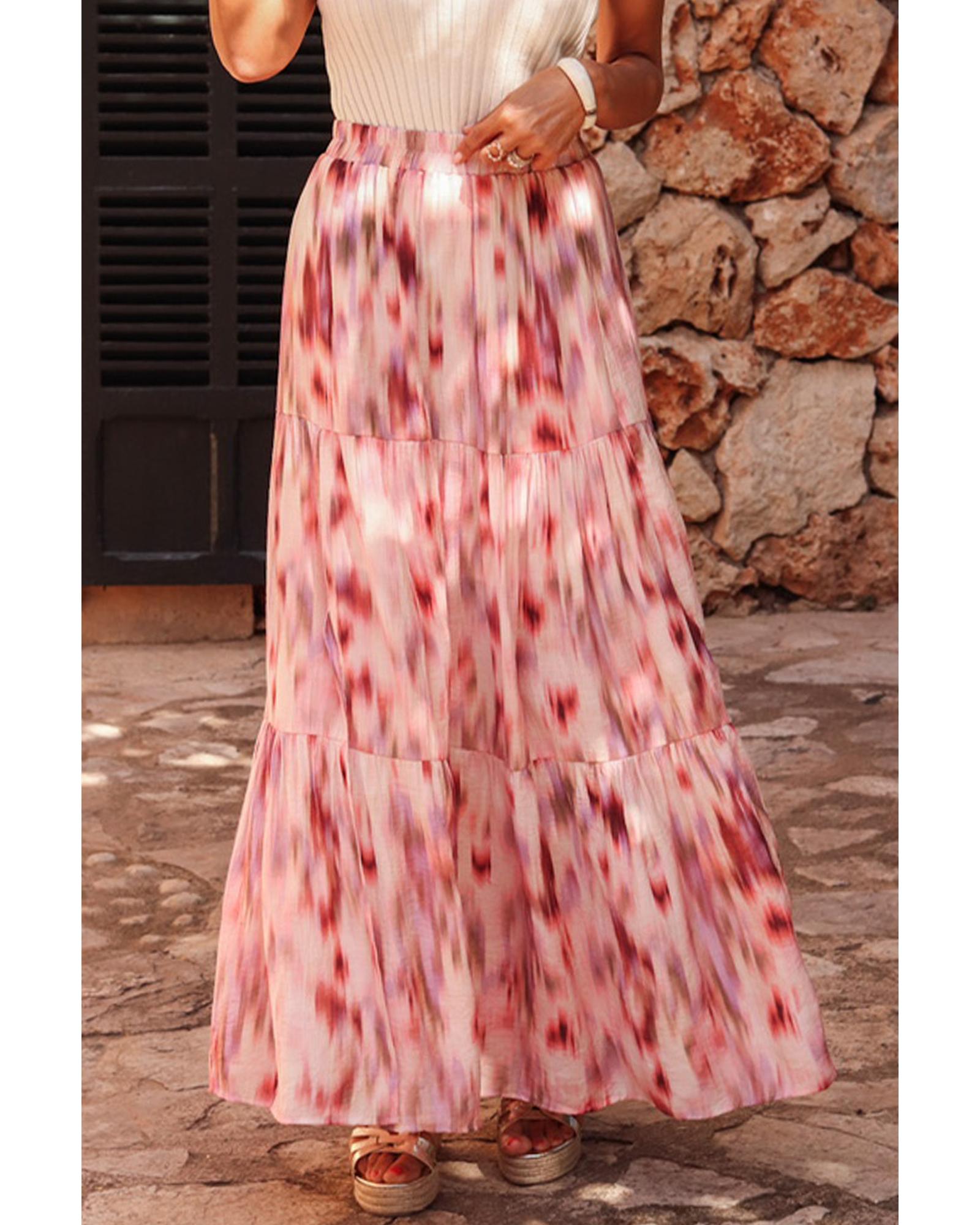 Pink Abstract Watercolor Tie Dye Tiered Maxi Skirt – L