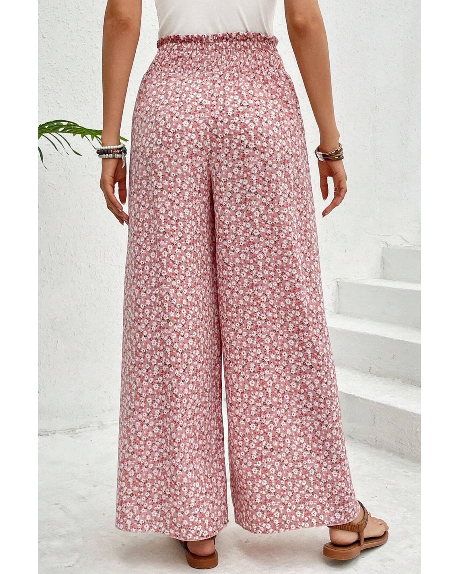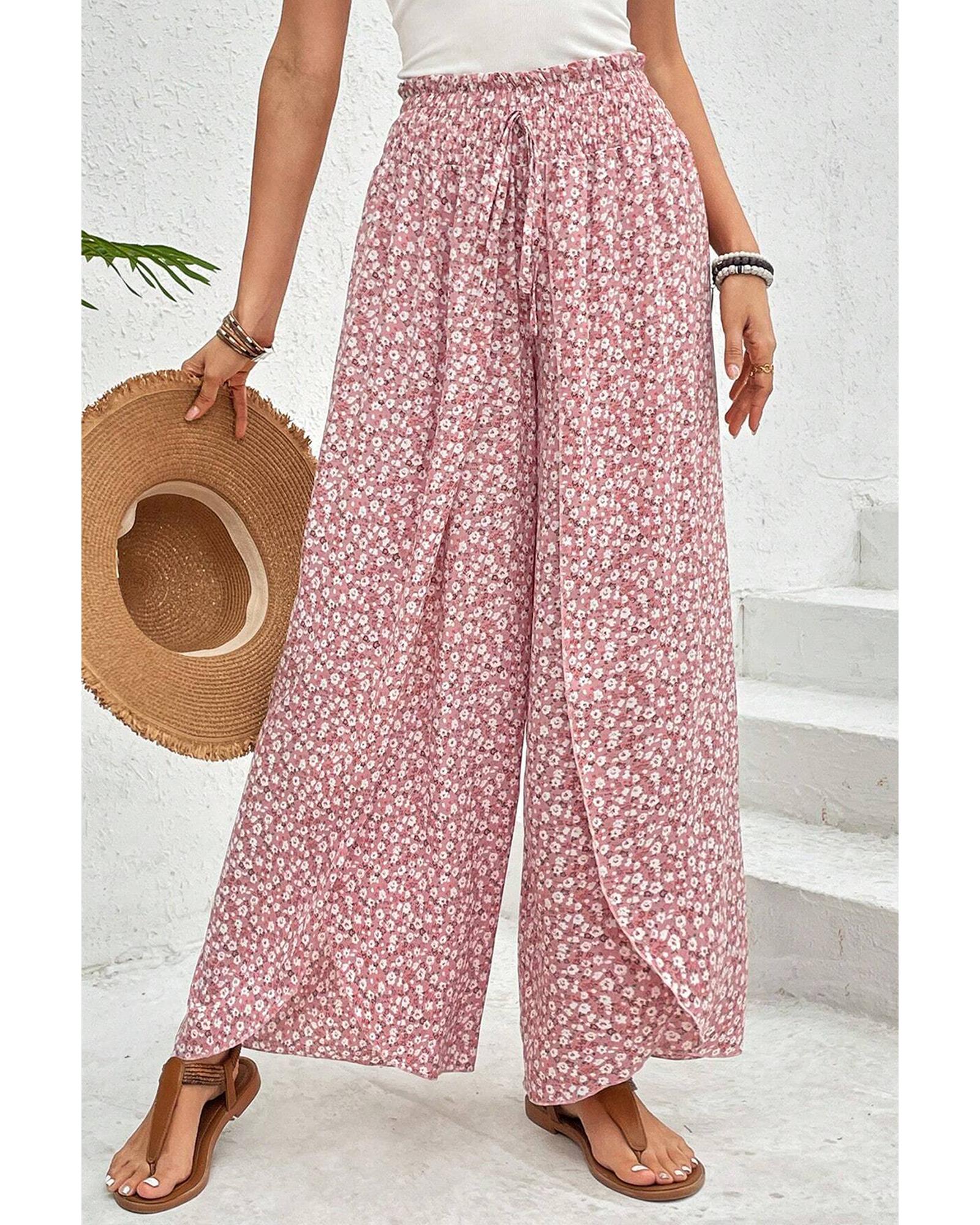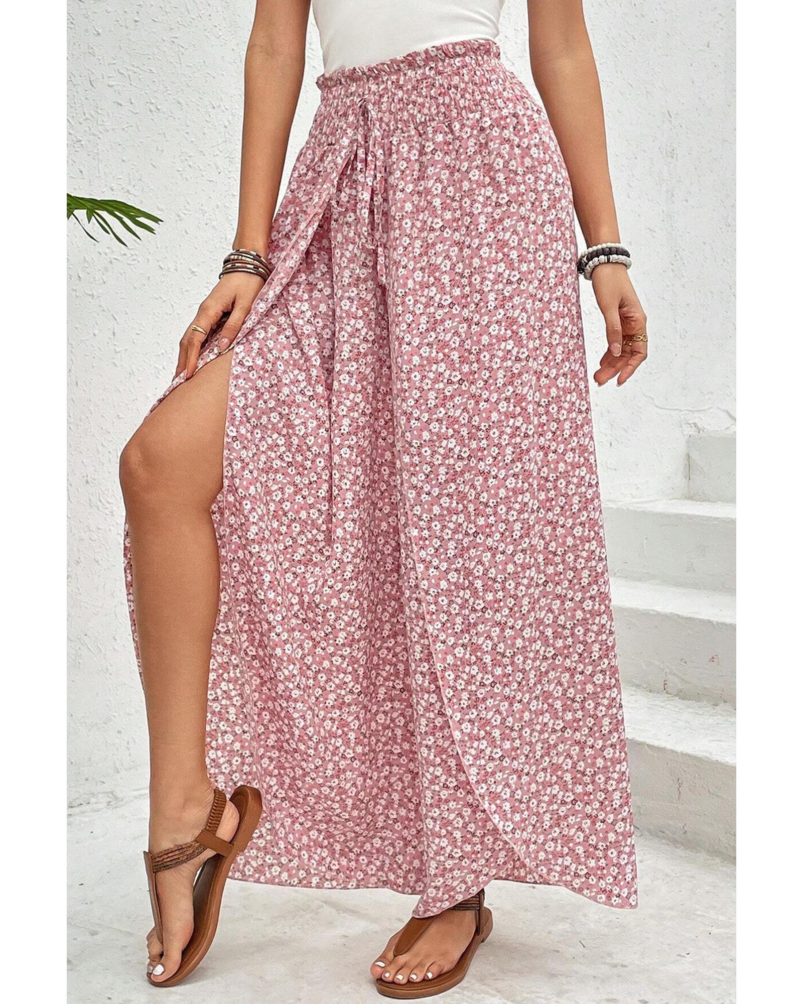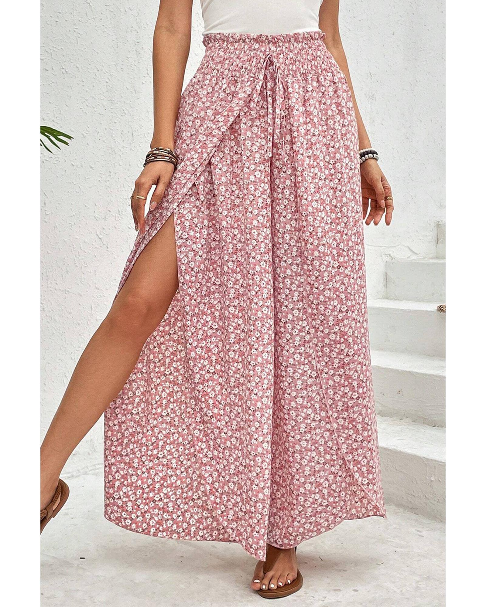 Pink Bohemian Print Slit Wide Leg Smocked High Waist Pants – L