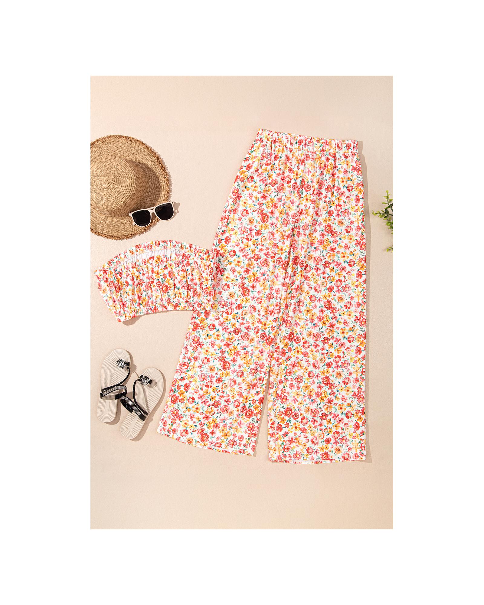 - Pink Boho Floral Bandeau Top and High Waist Wide Leg Pants Set