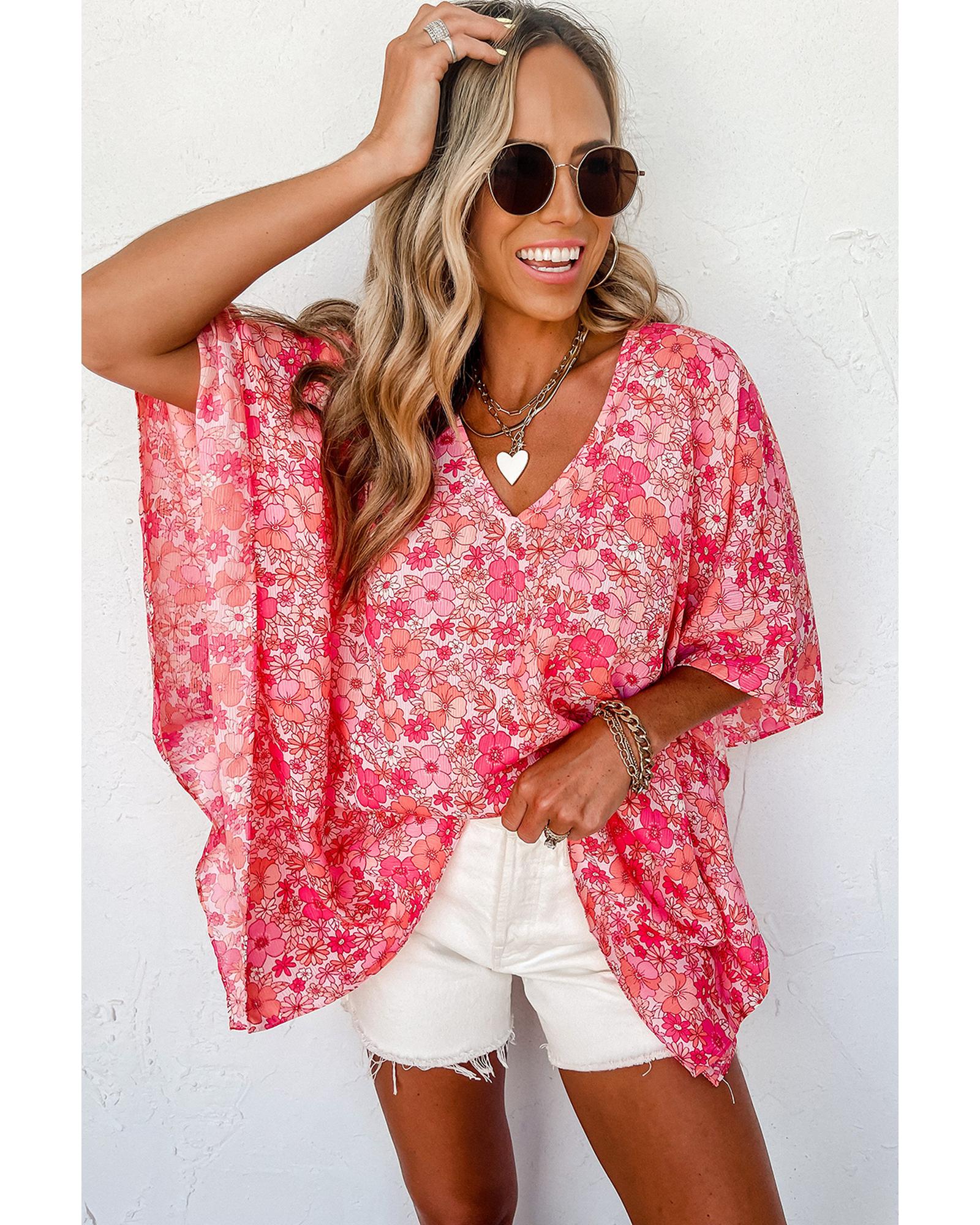 - Oversized Pink Boho Floral V Neck Kimono Style Blouse