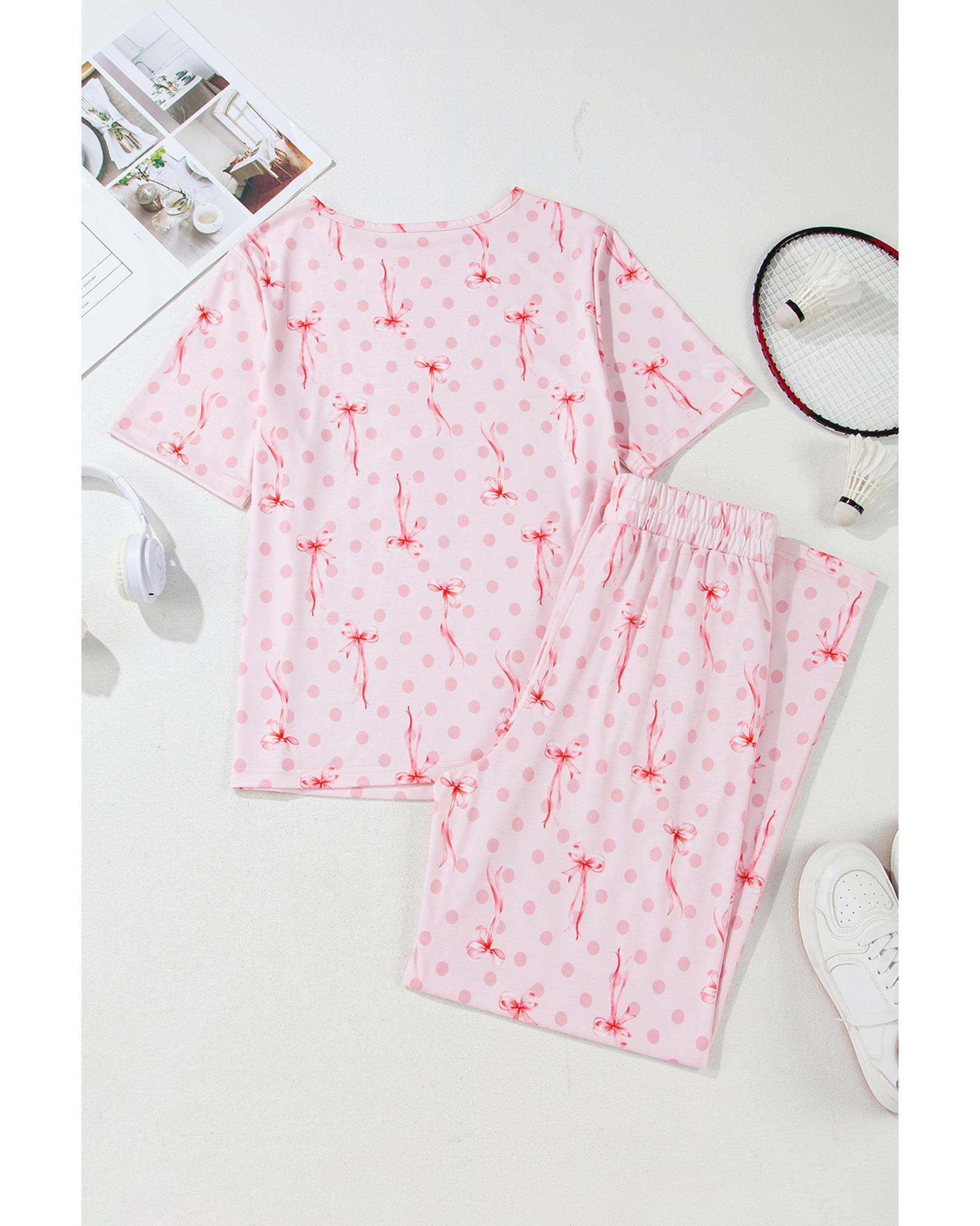 - Pink Bow Knot Polka Dot Print Short Sleeve Top Lounge Set