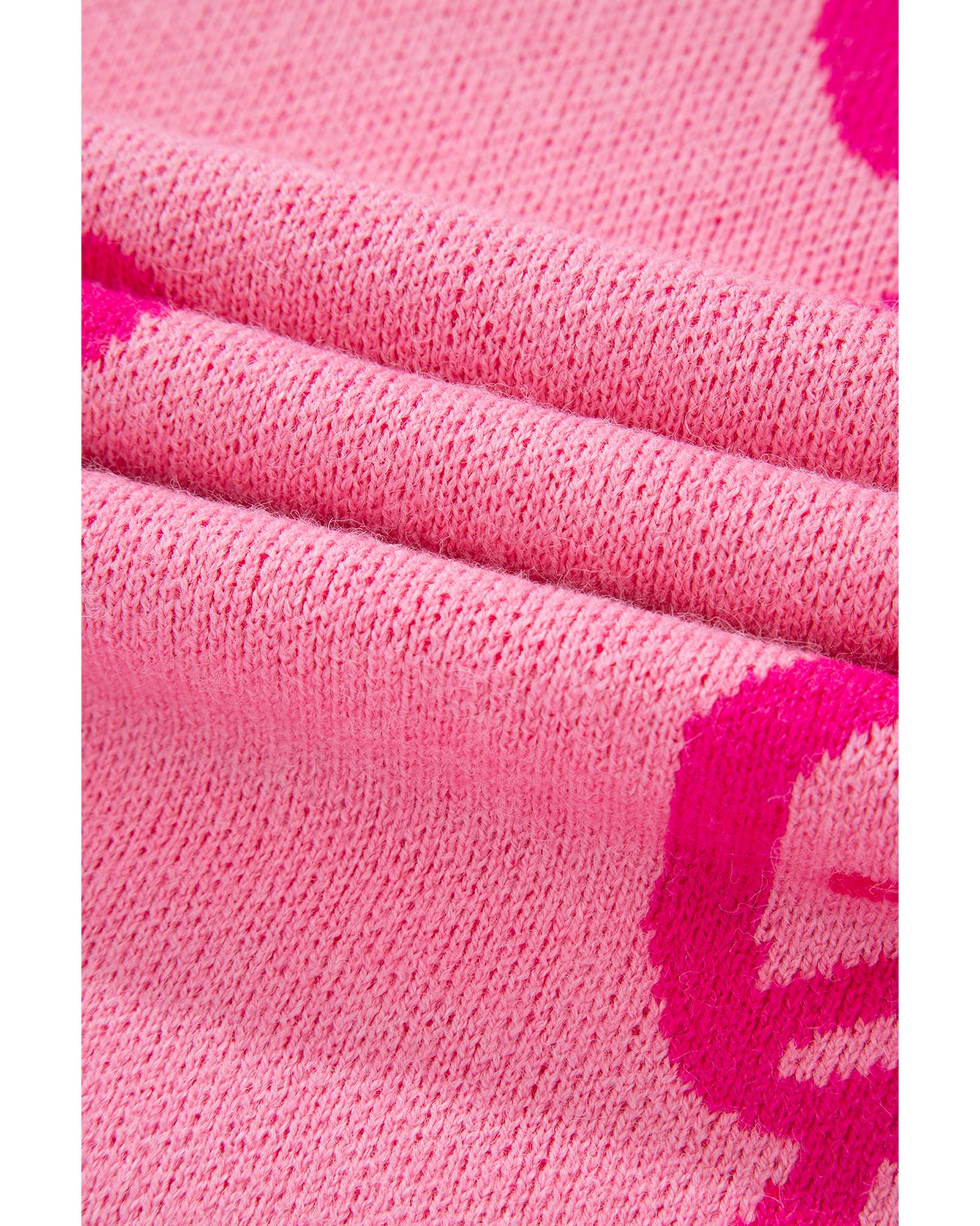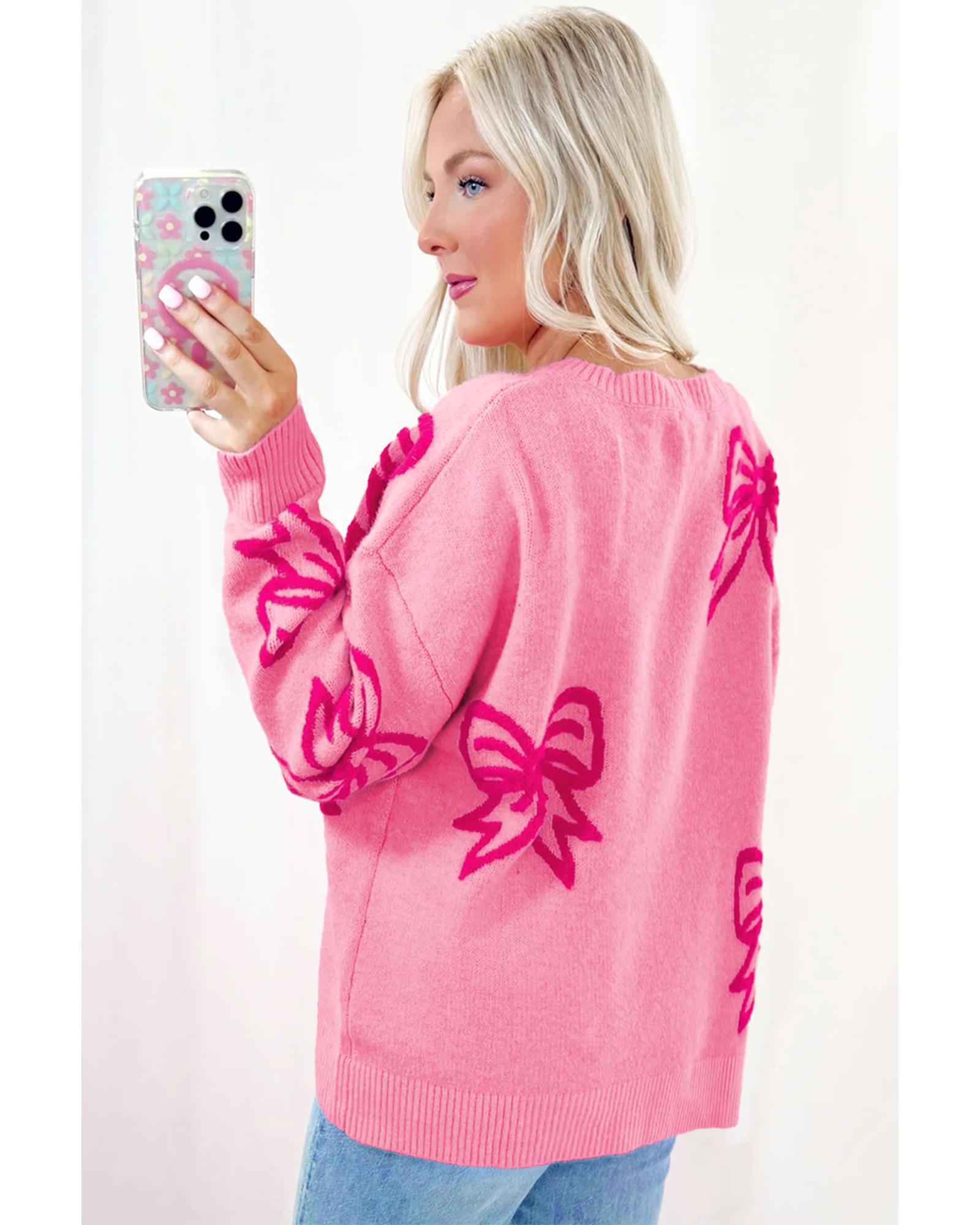 Pink Bow Pattern Drop Shoulder Loose Sweater – M