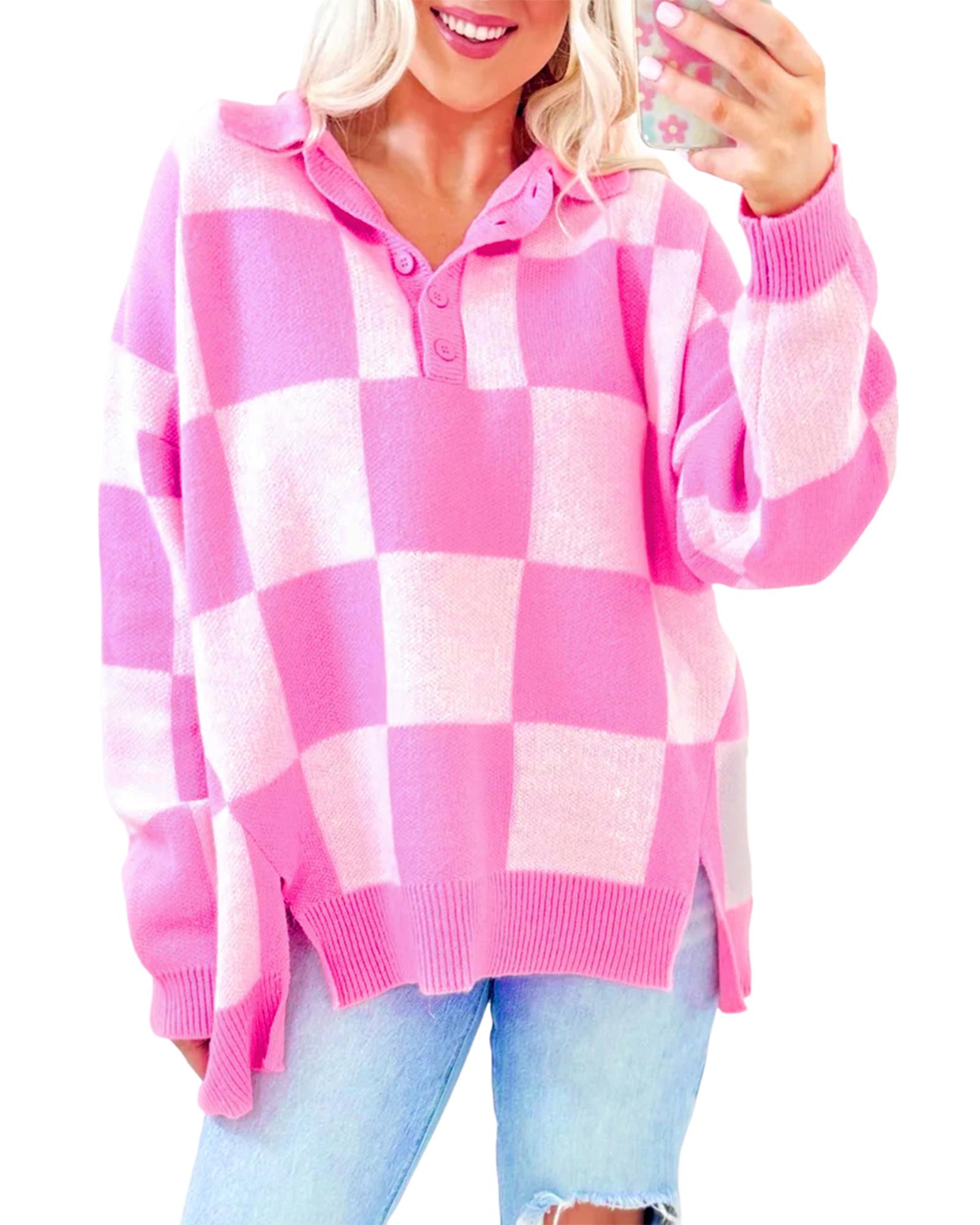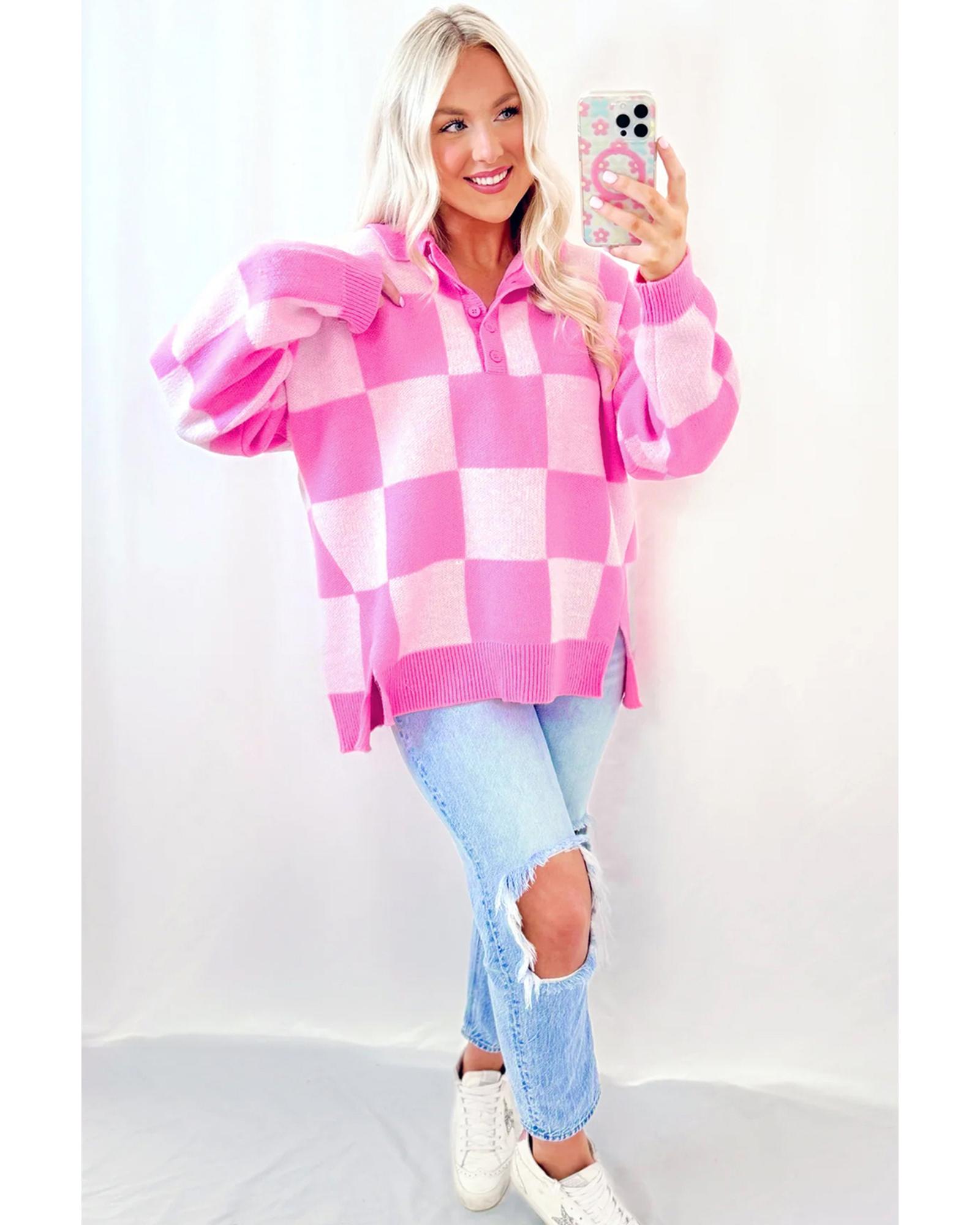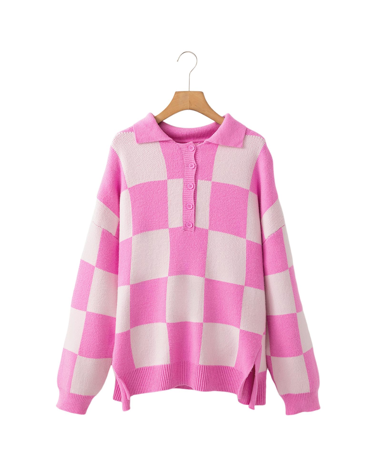 Pink Checkerboard Half Button Collared Drop Shoulder Sweater – S