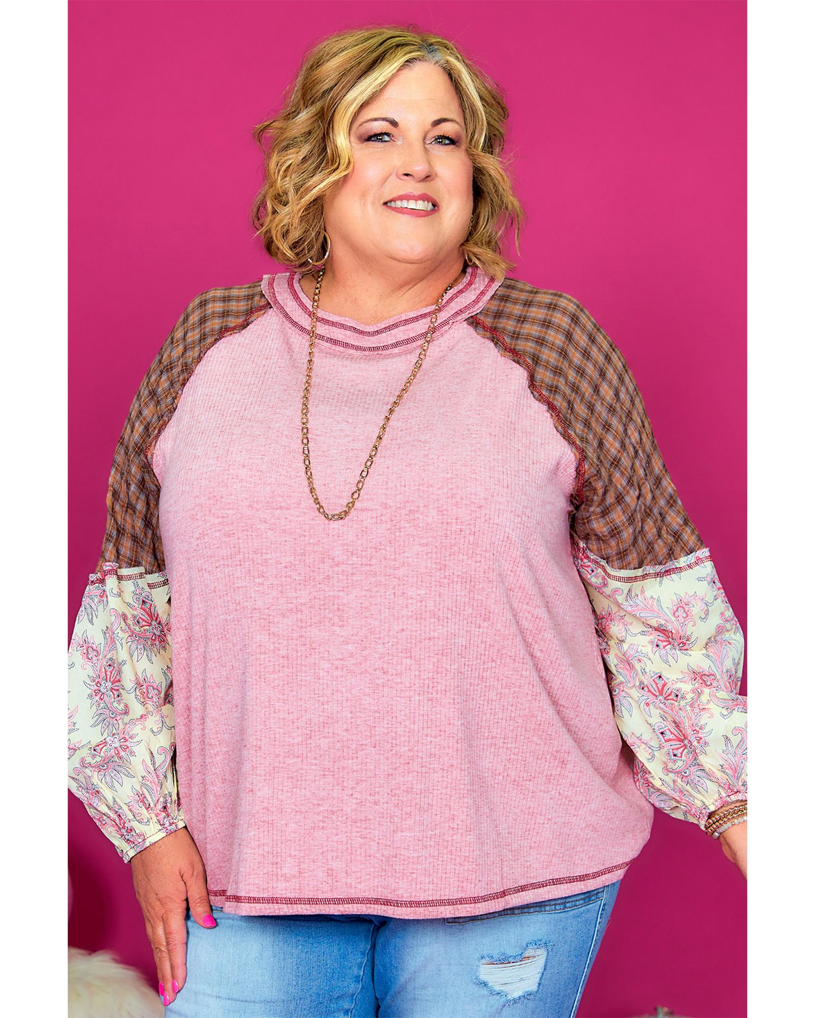 Pink Checkered Paisley Patchwork Raglan Sleeve Seamed Plus Size Top - 2X Original price was: $68.99.Current price is: $36.99.