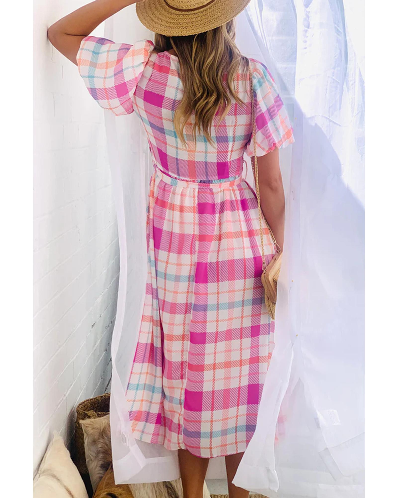 Pink Checkered Puff Sleeve Belted Midi Dress – M