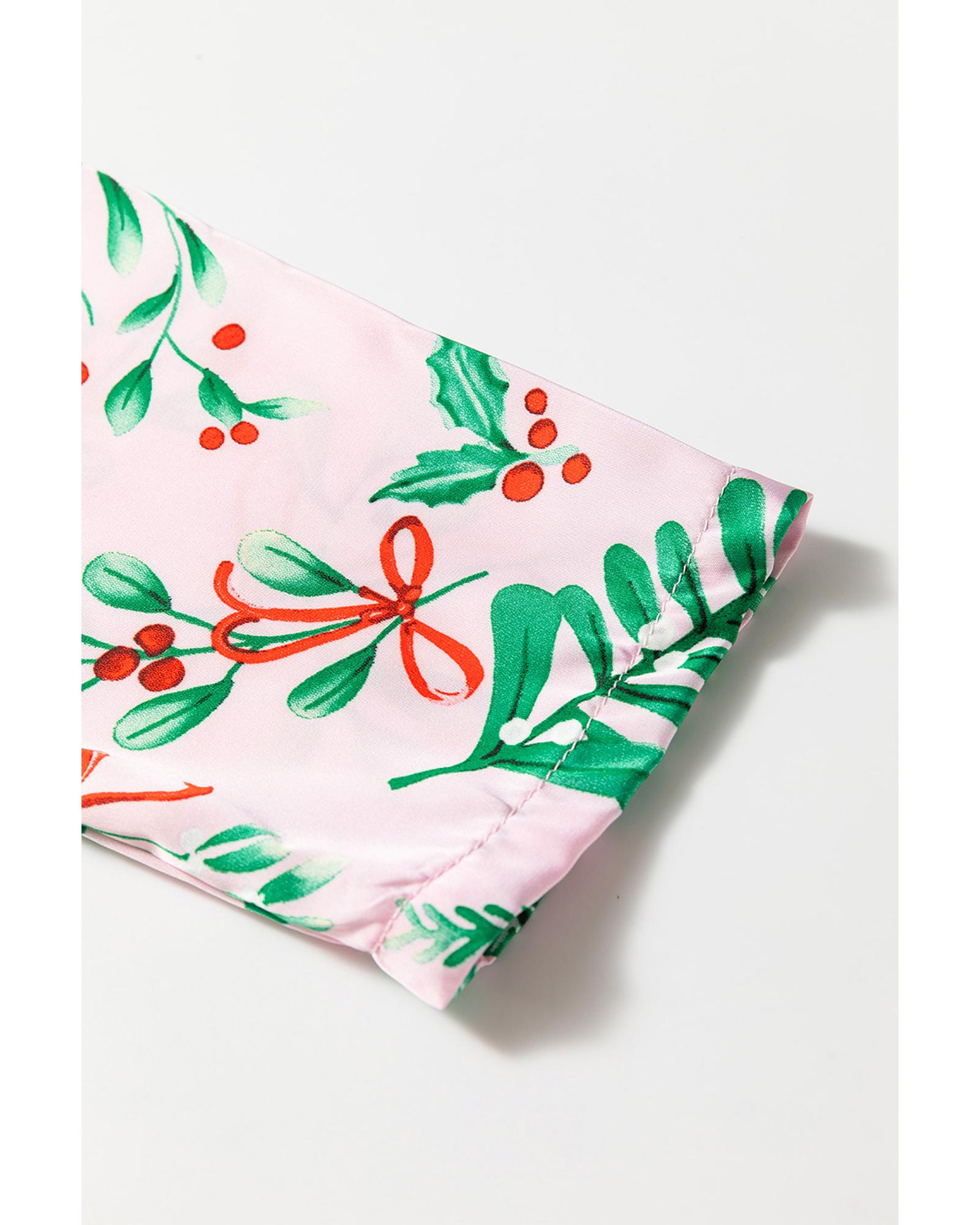 Pink Christmas Berries Plant Print Satin Long Sleeve Pajama Set – M