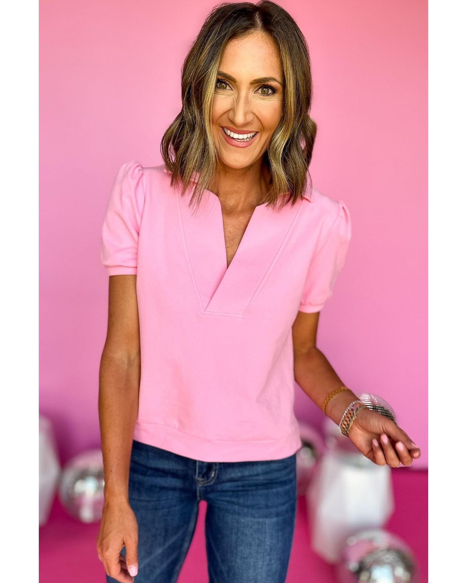 Pink Collared V Neck Puff Sleeve T-shirt – L