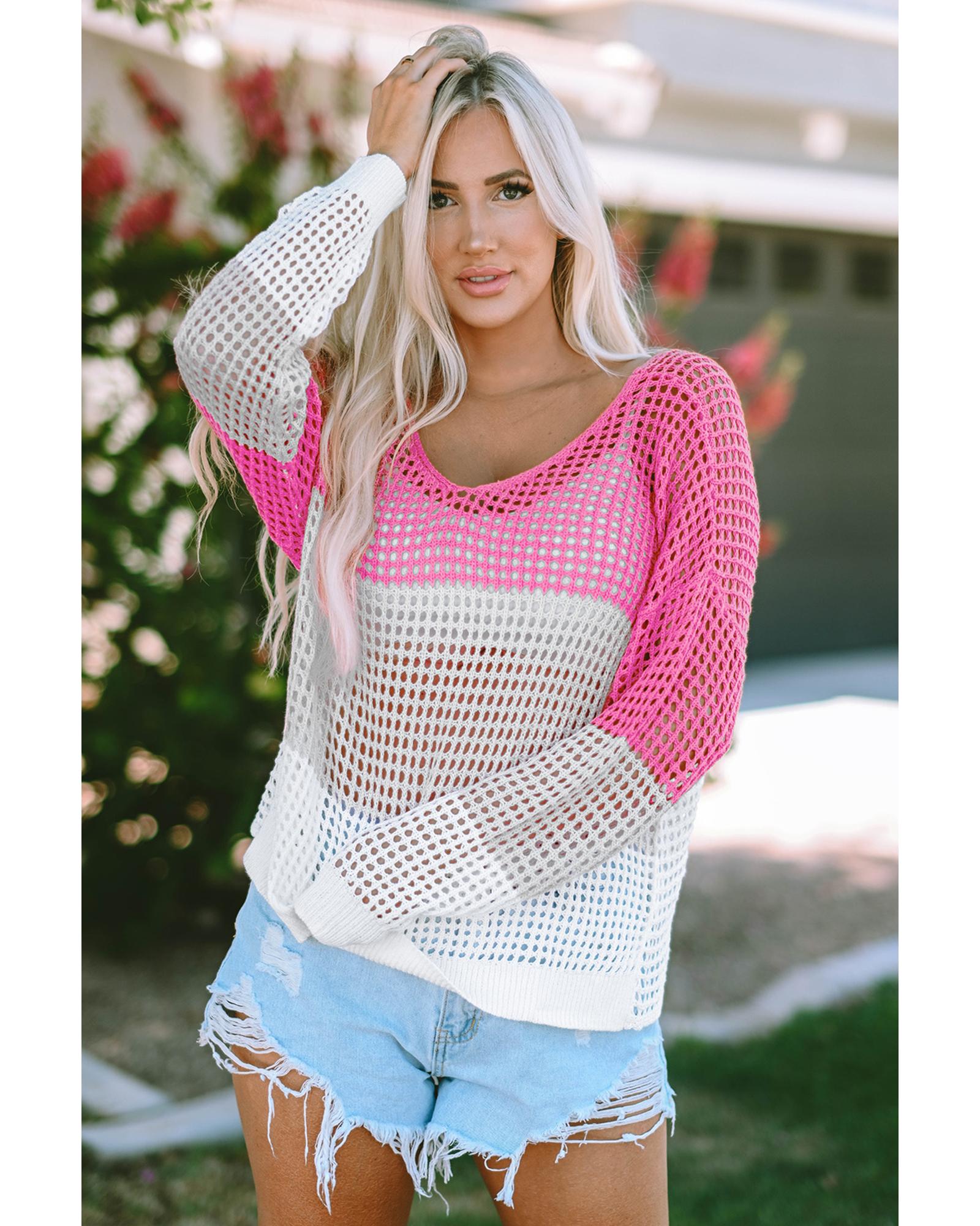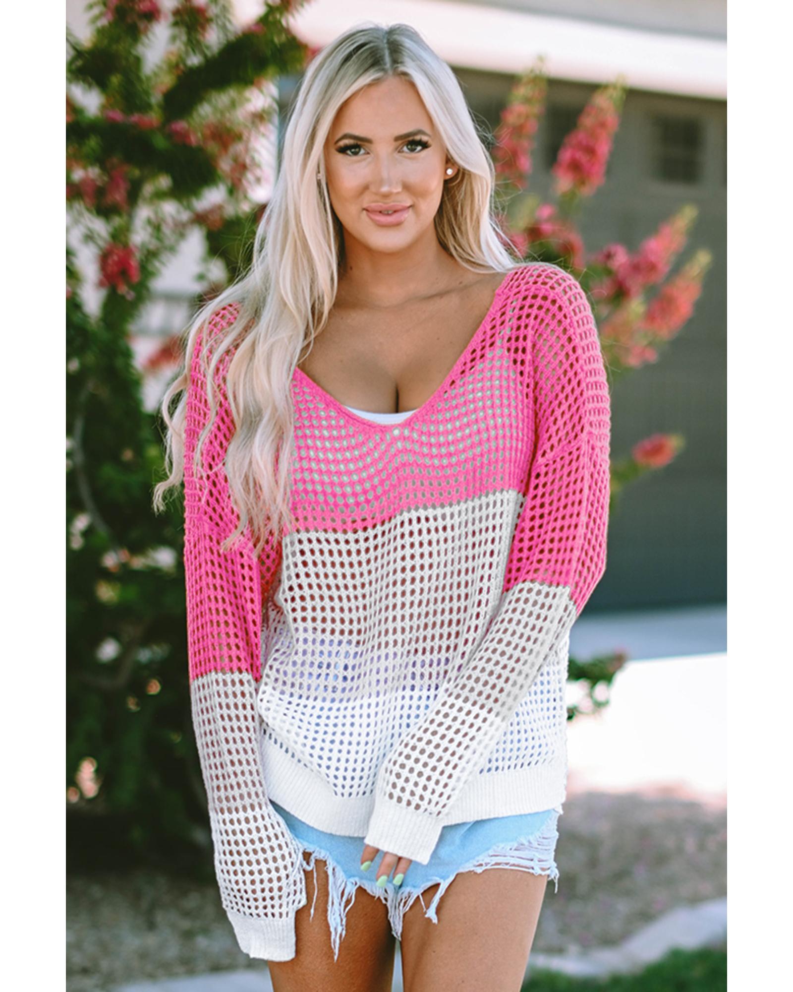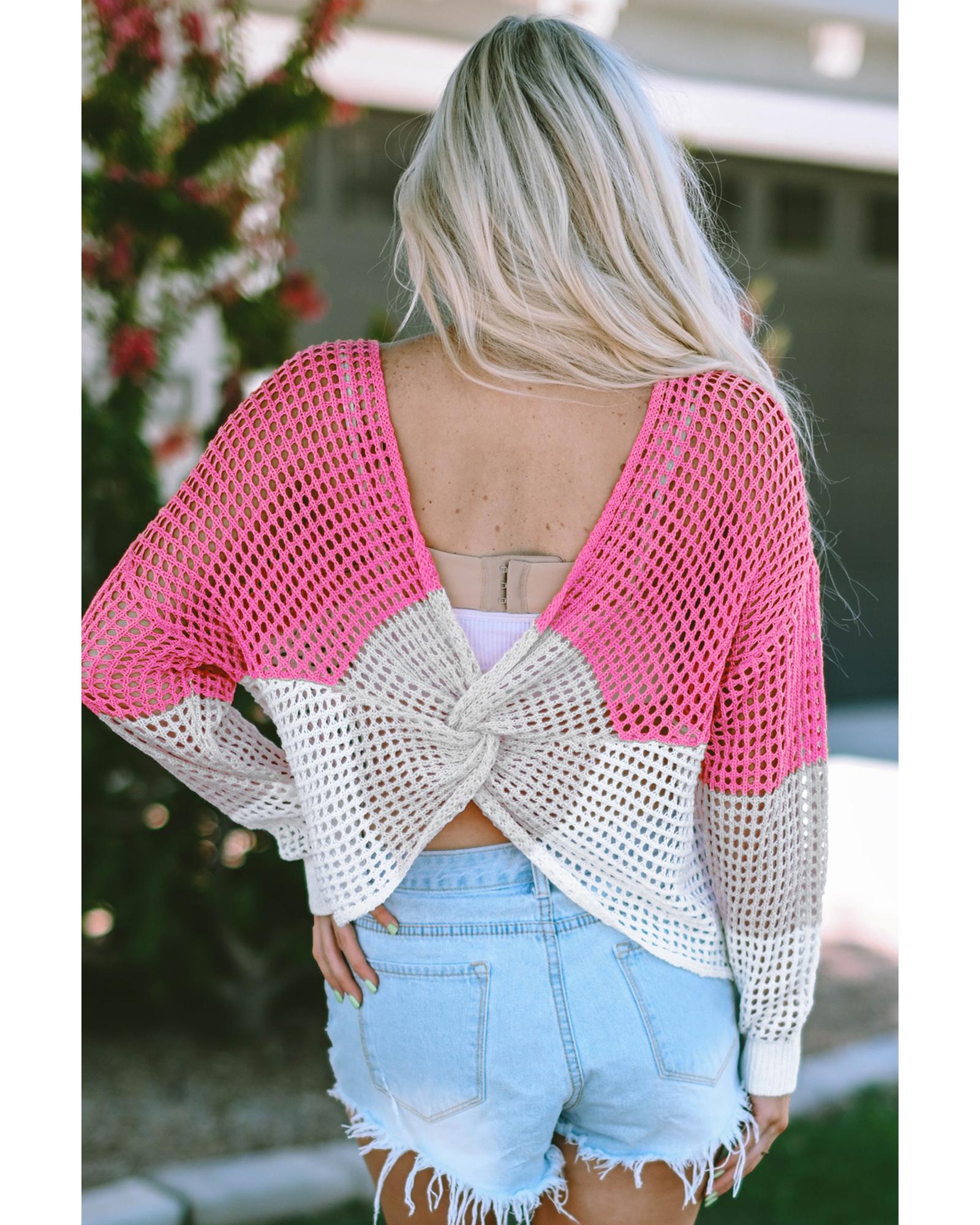 Pink Color Block Eyelet Long Sleeve Twisted Back Knit Top – M
