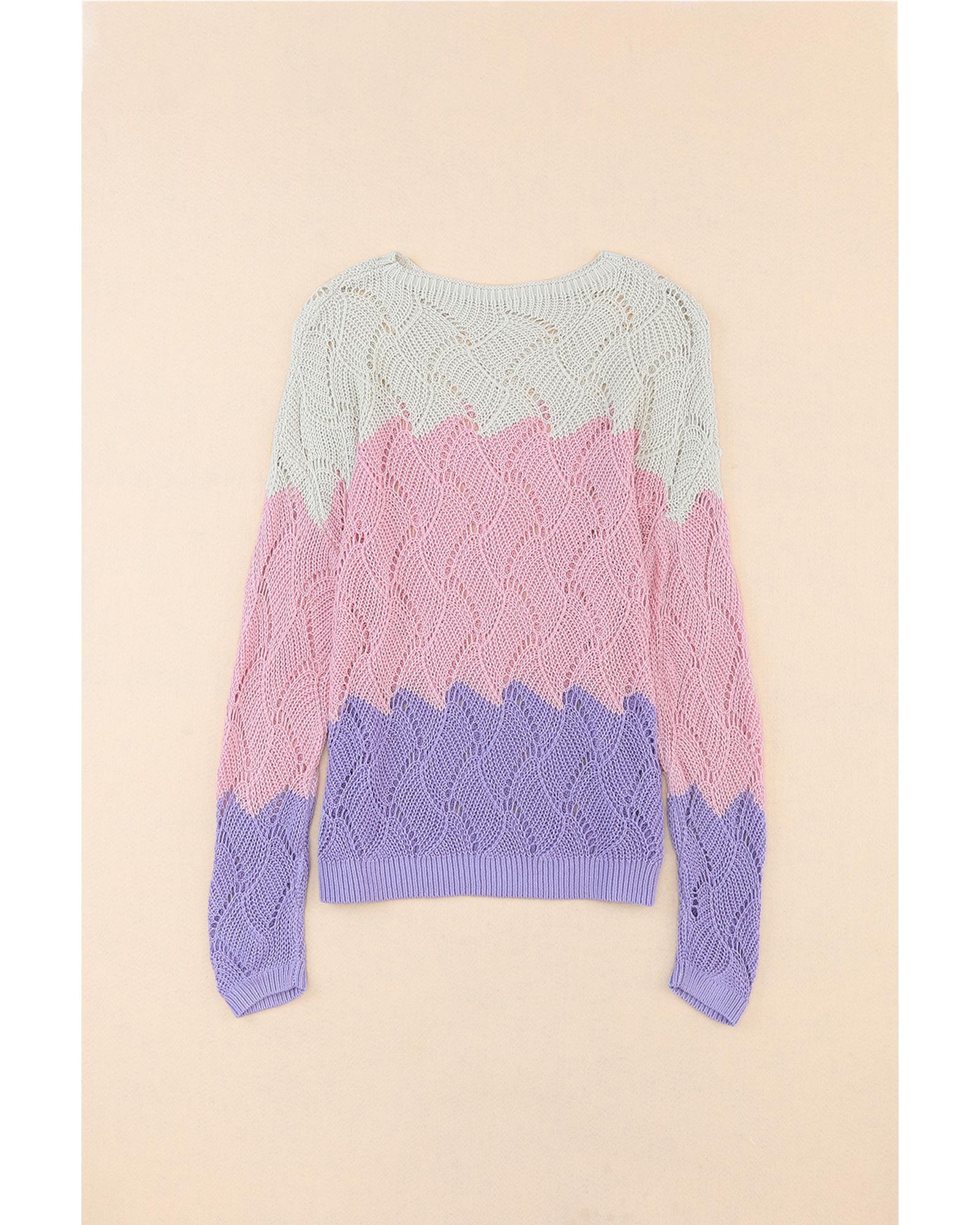 Pink Color Block Hollow Knitted Loose Sweater – S