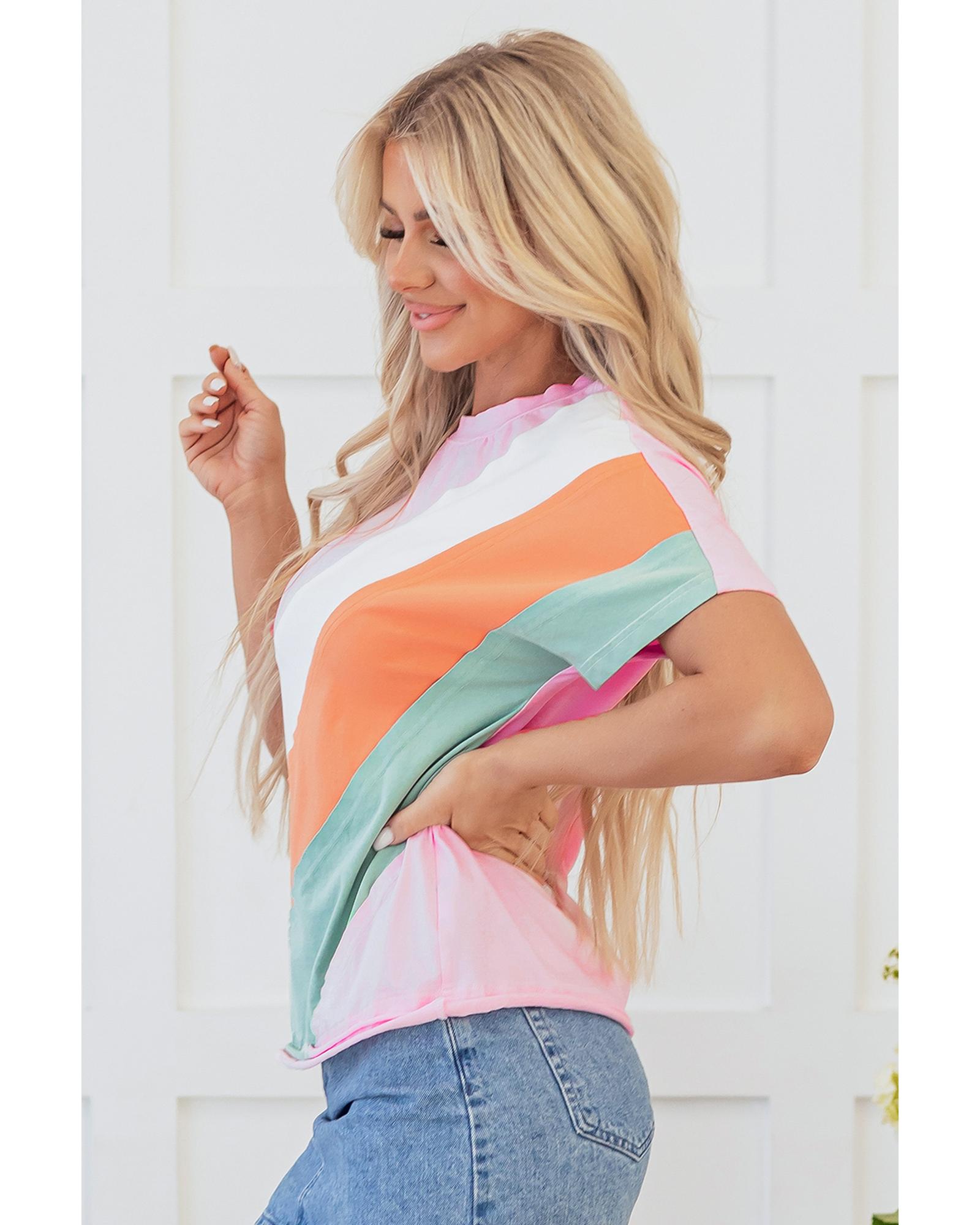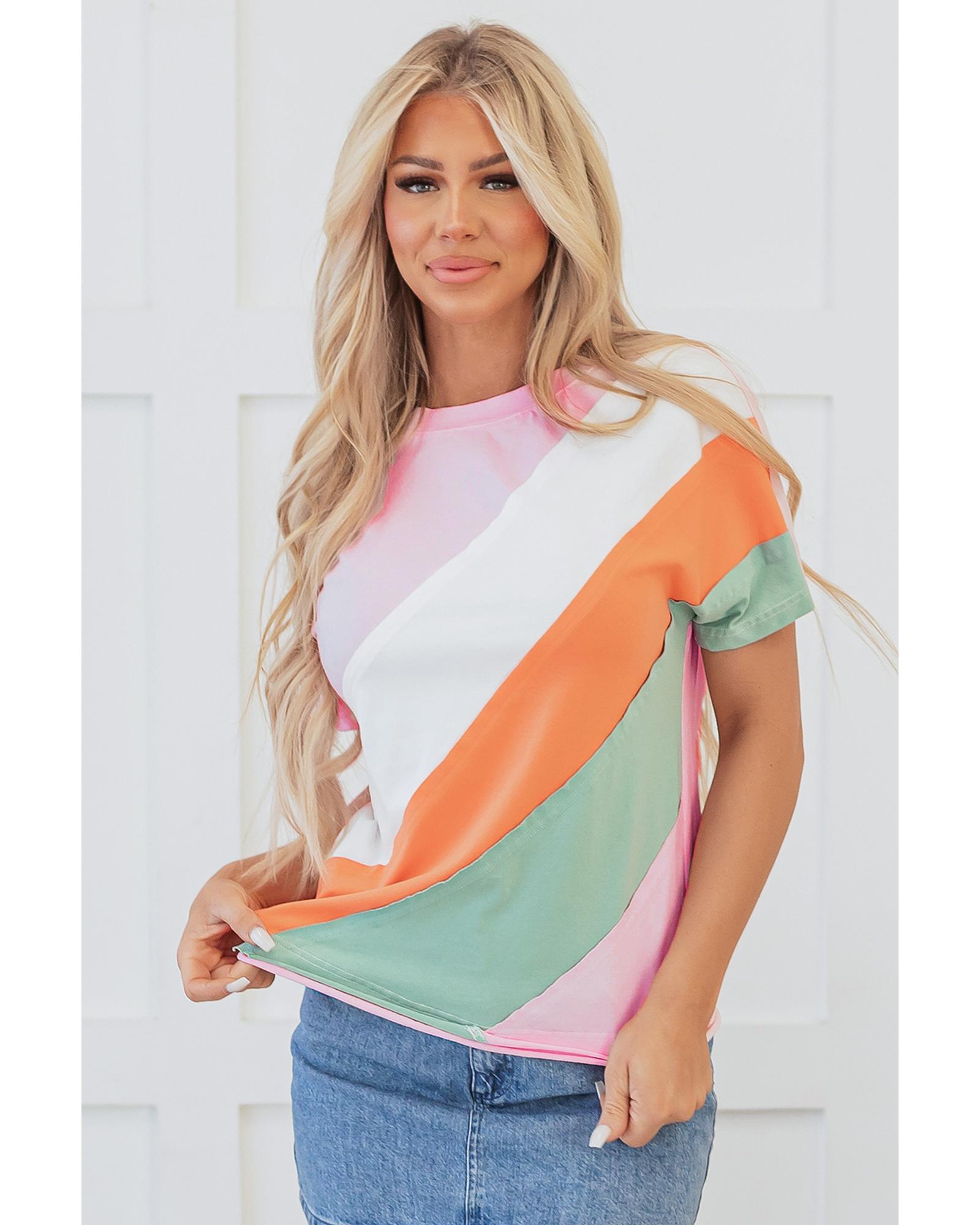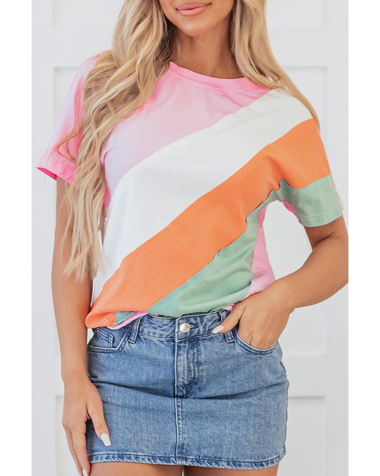 Pink Color Block Patchwork Seamed Crewneck T Shirt – L