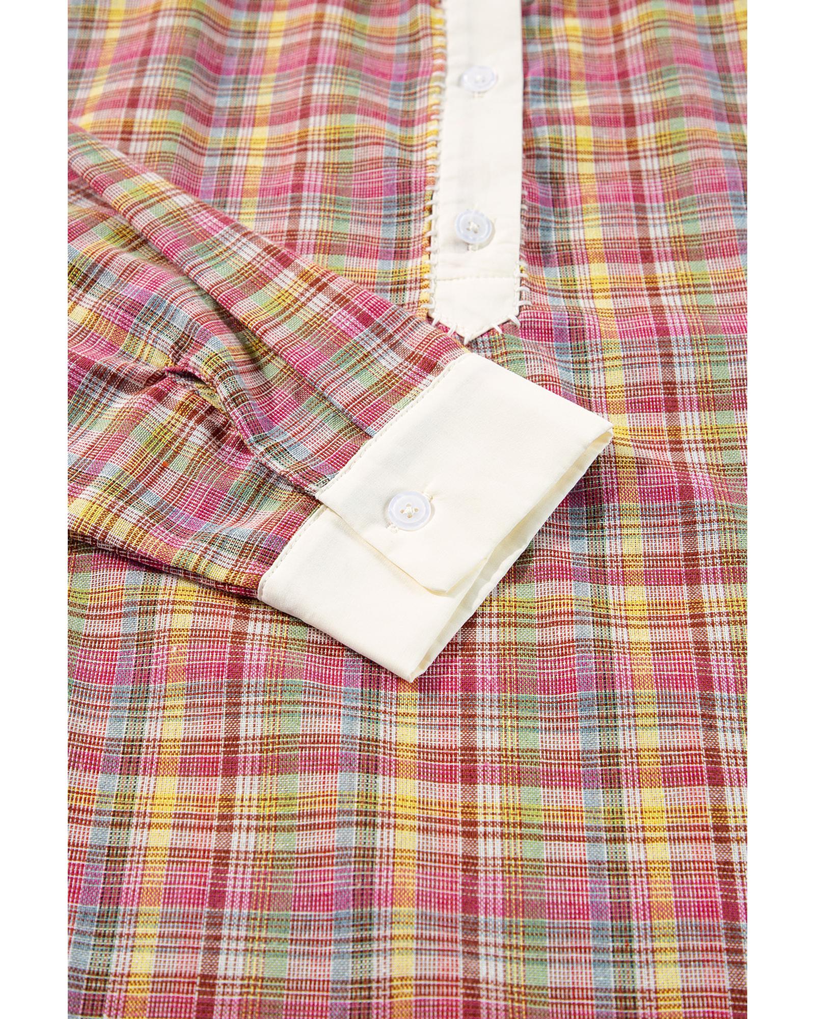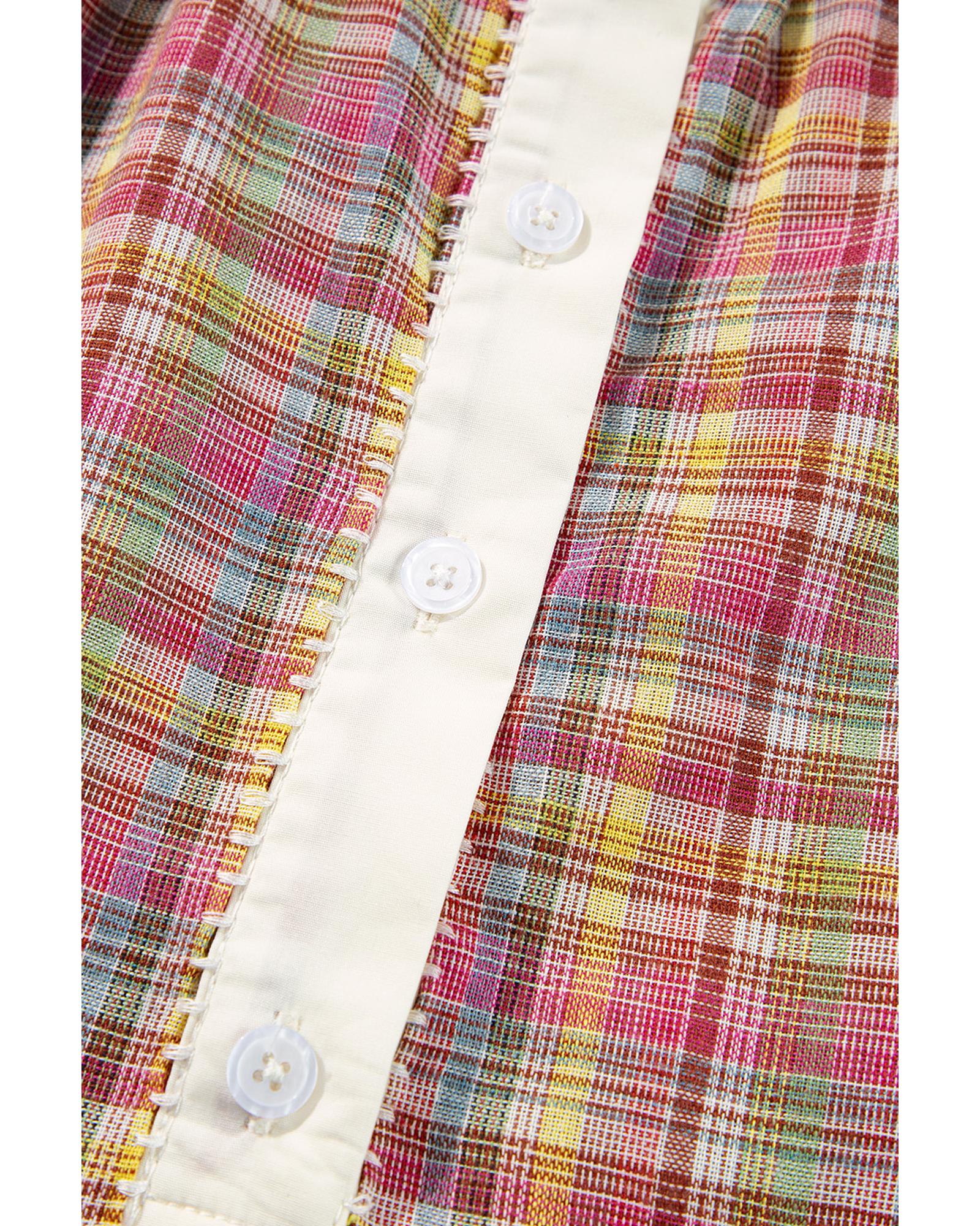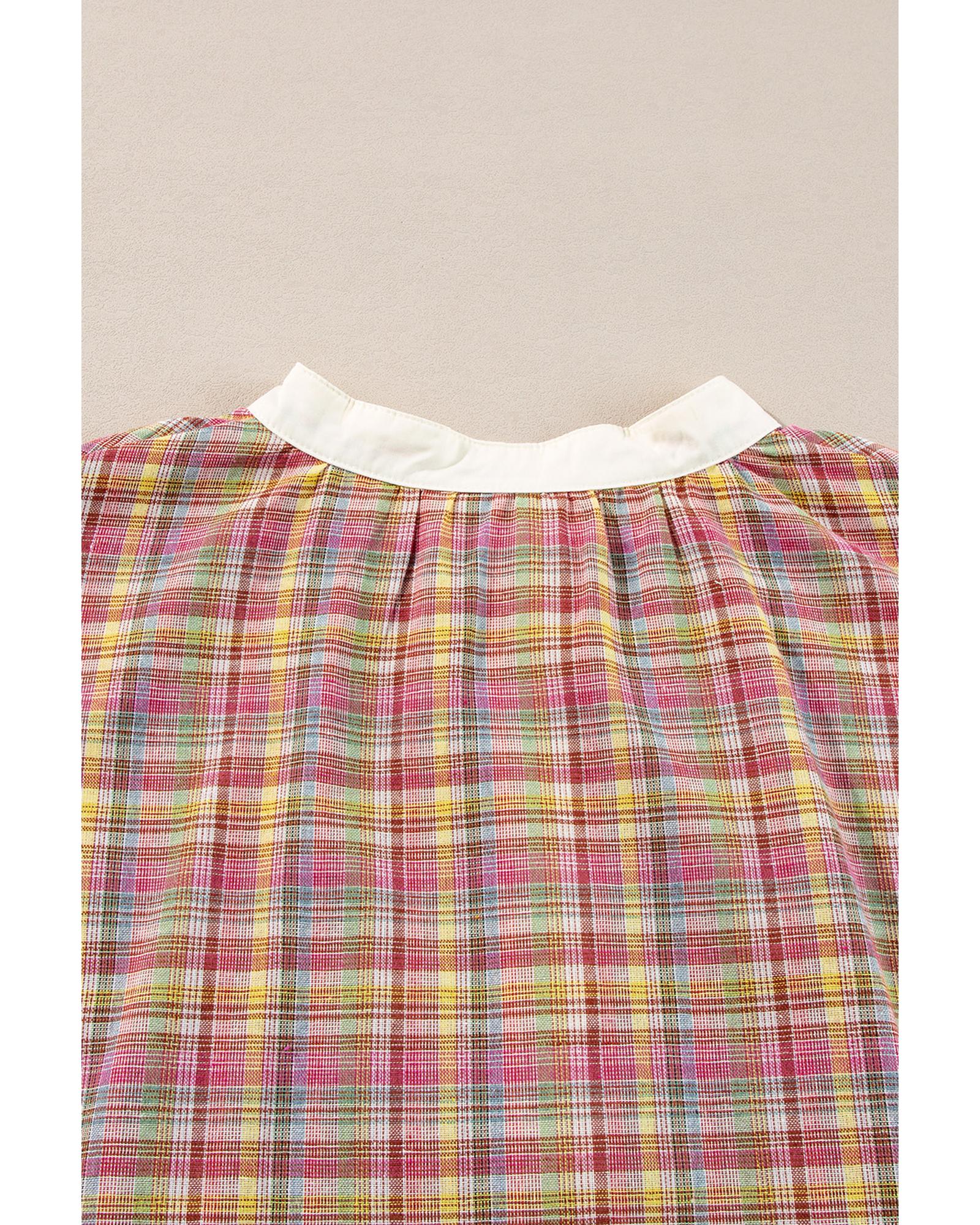 Pink Colorblock Plaid Patchwork Henley Blouse – M