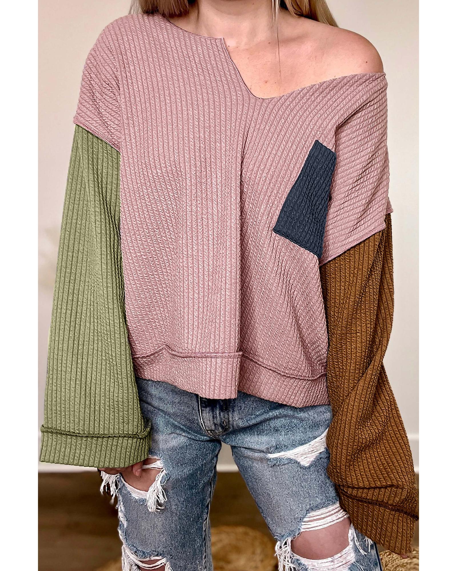 Pink Colorblock Rib Textured Loose Long Sleeve Top – L