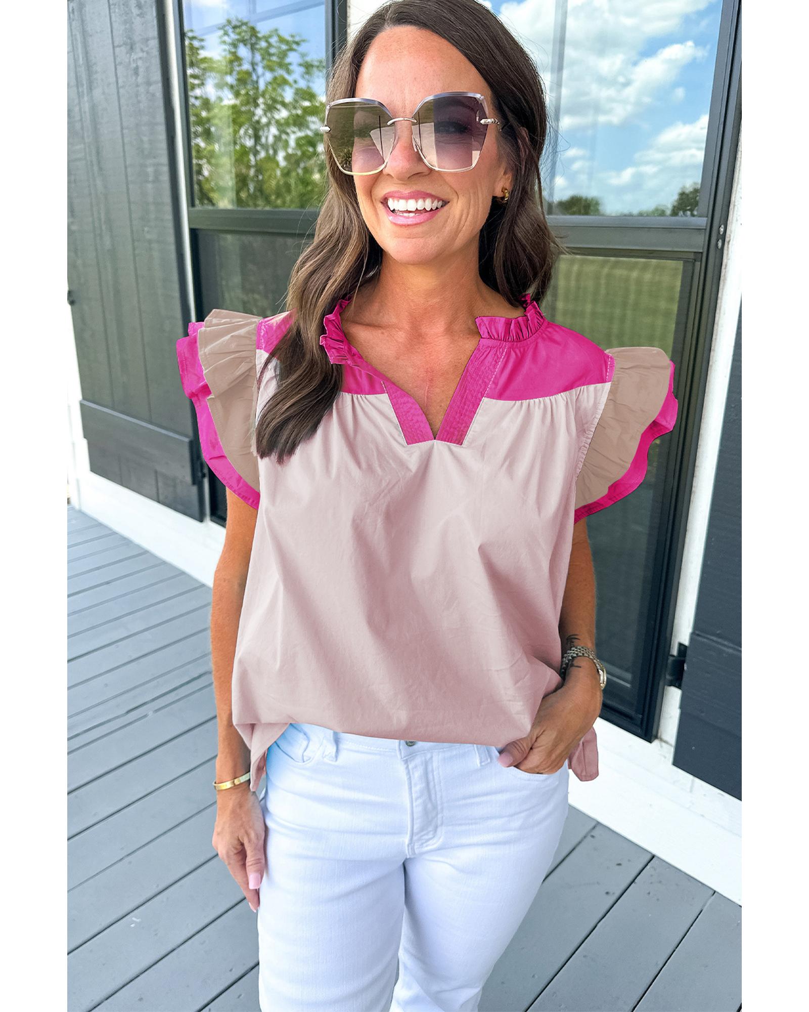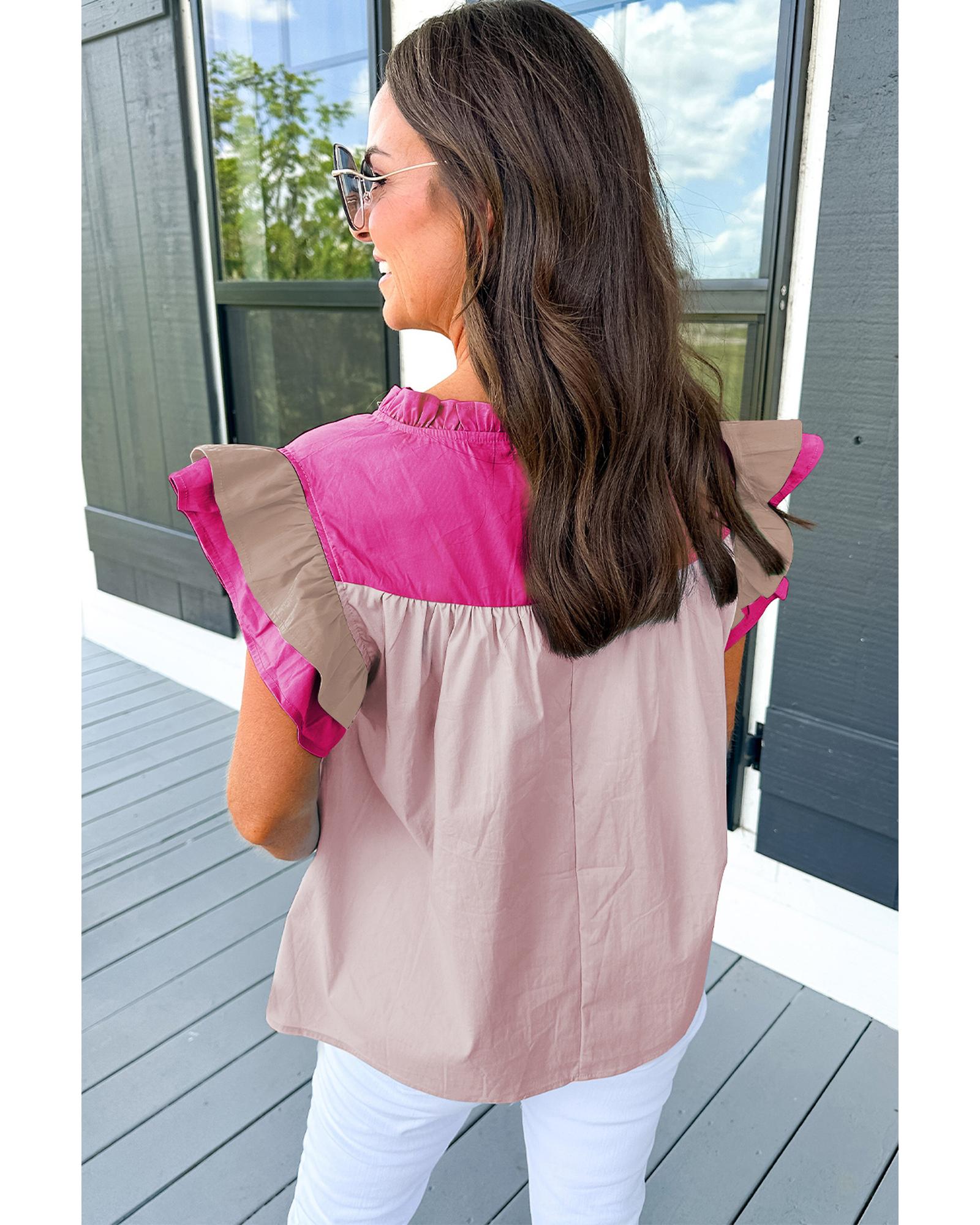 - Pink Colorblock Ruffled Sleeve Frill V Neck Blouse