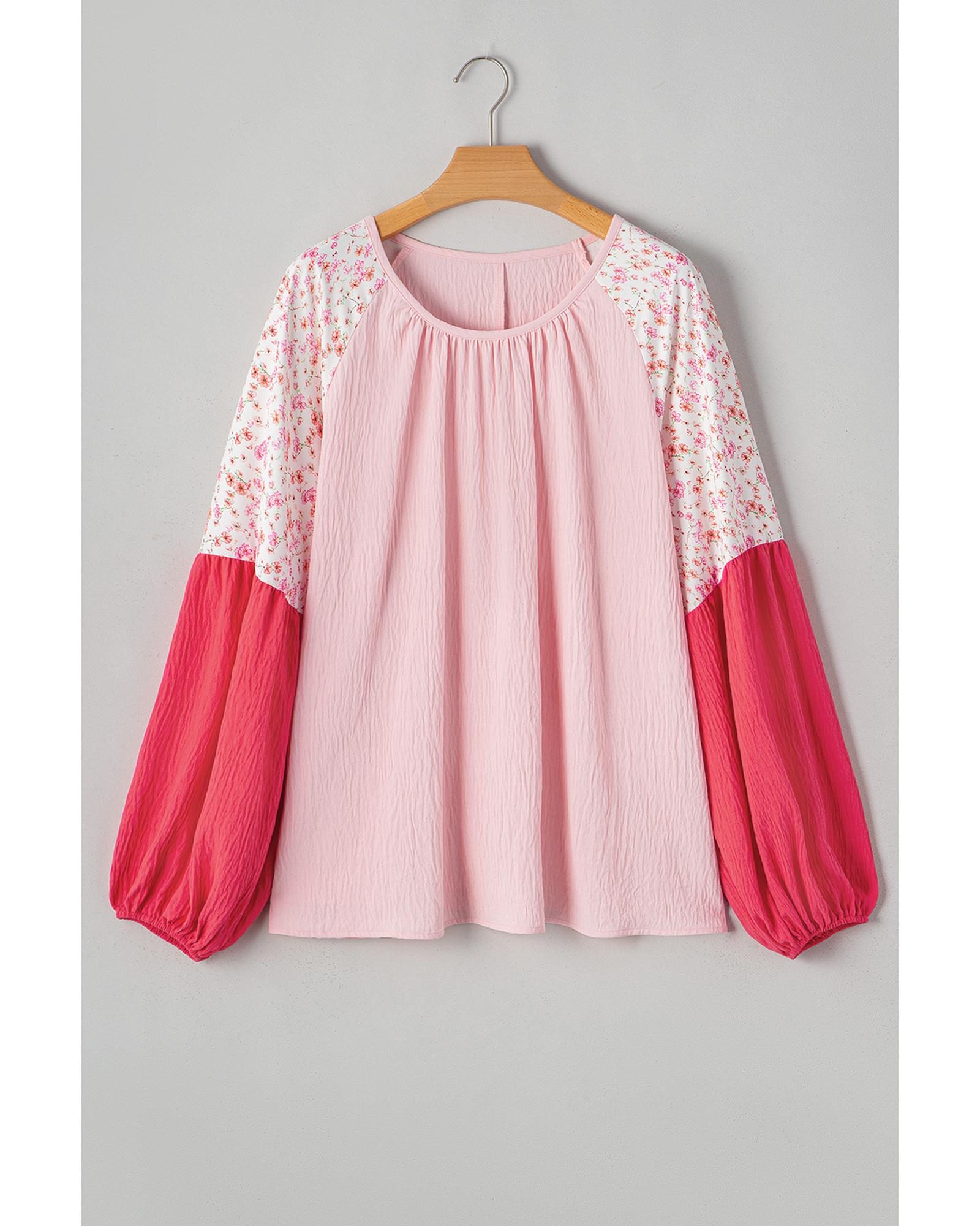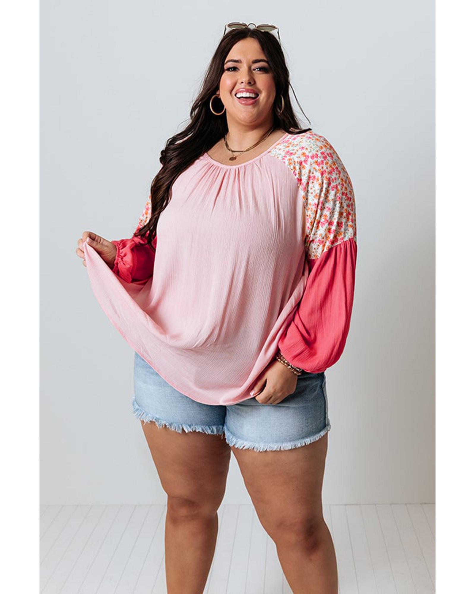 Pink Contrast Floral Patchwork Long Sleeve Plus Size Blouse – 3X