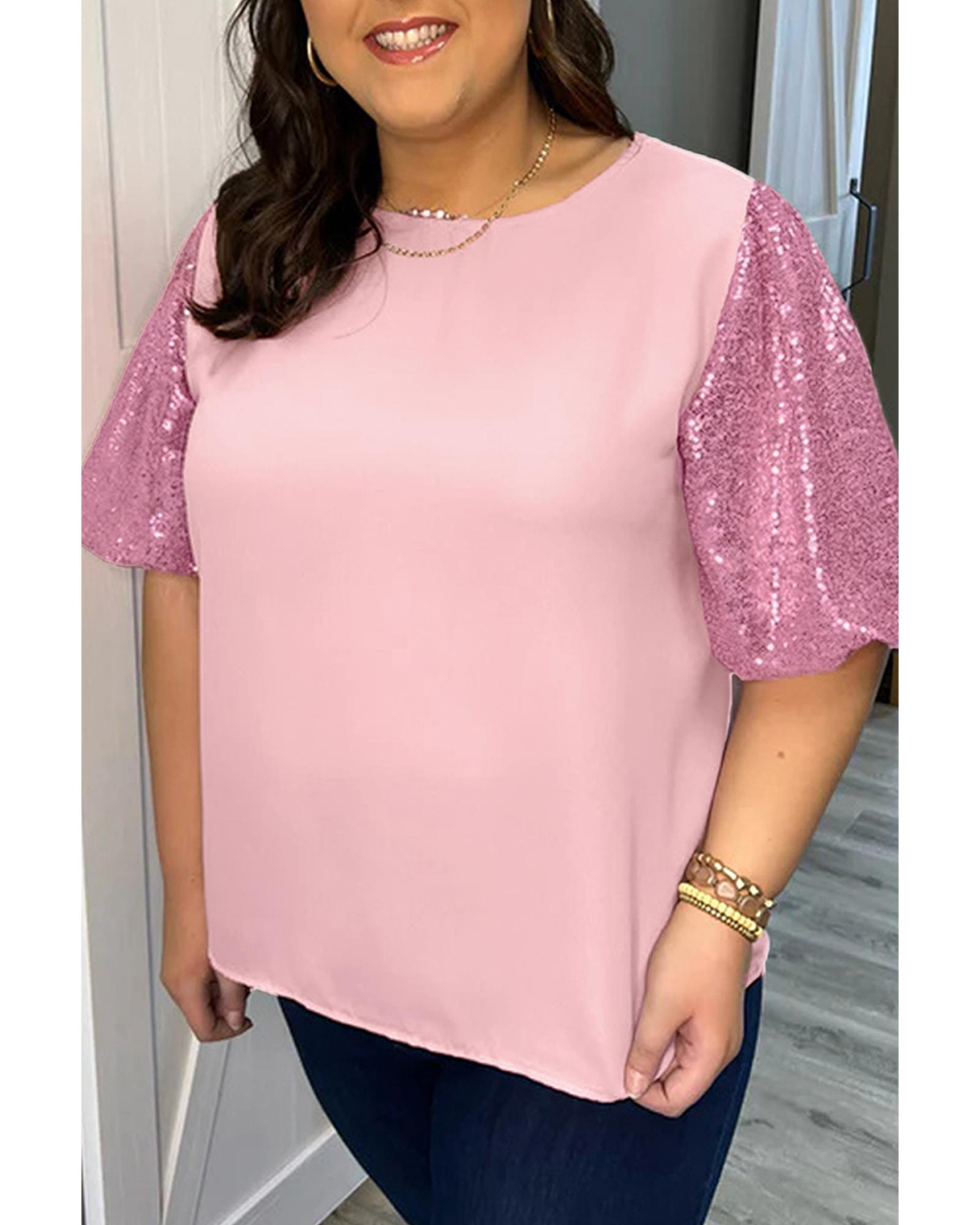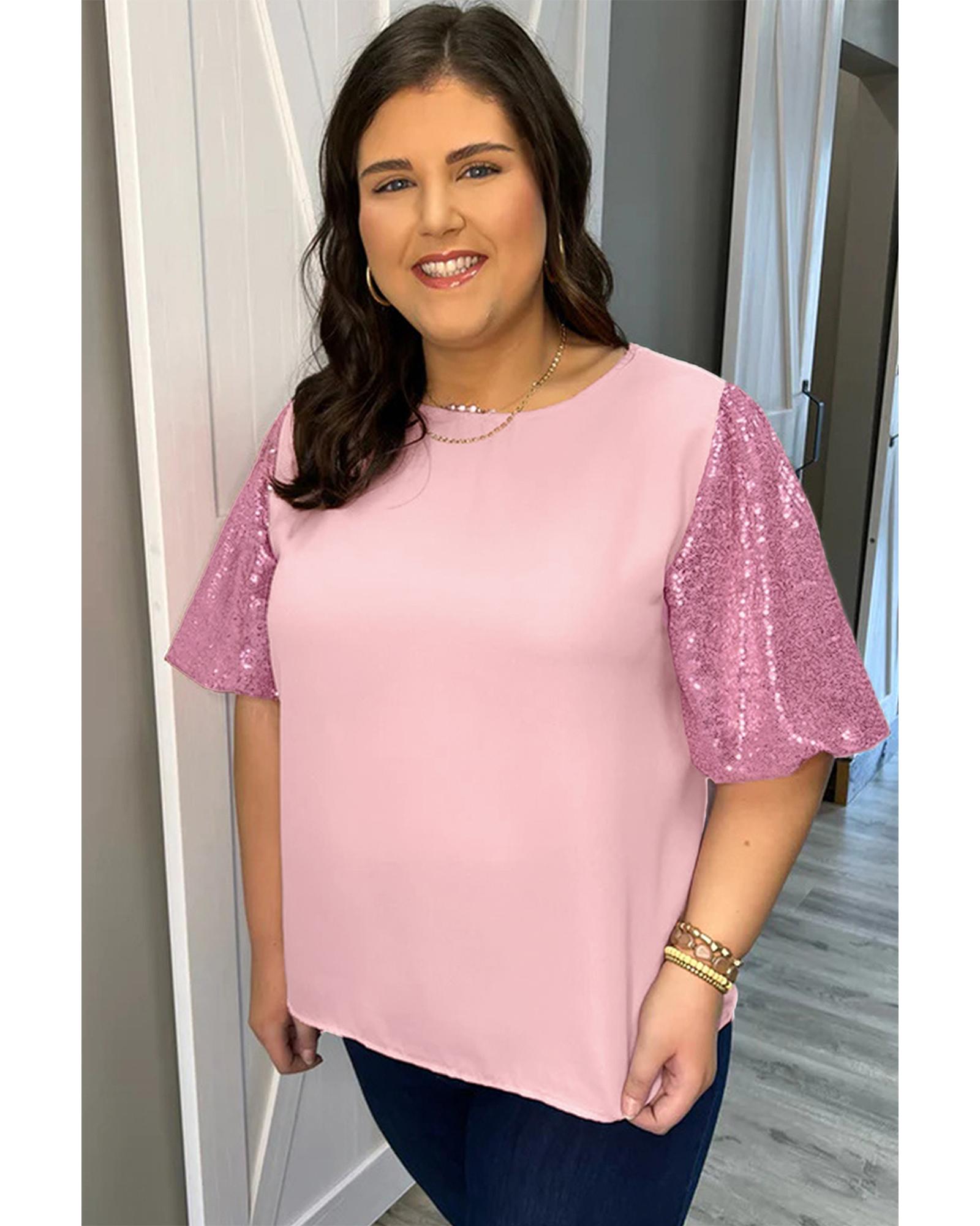 - Pink Contrast Sequin Bubble Sleeve Plus Size T