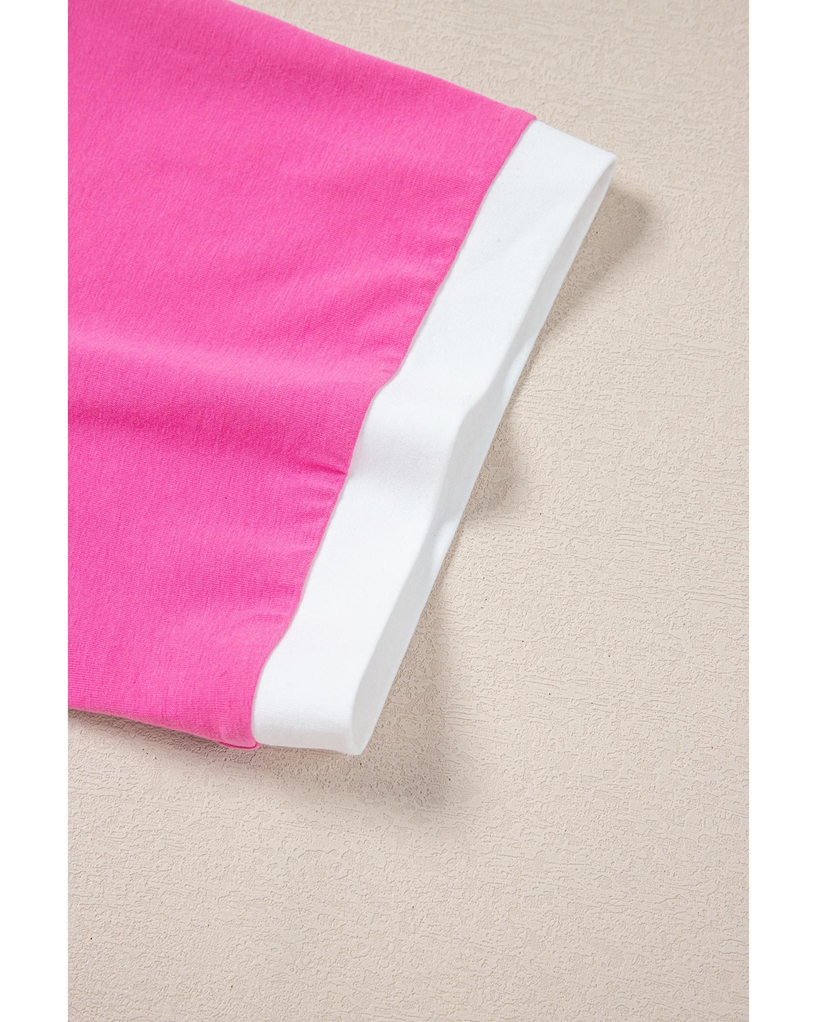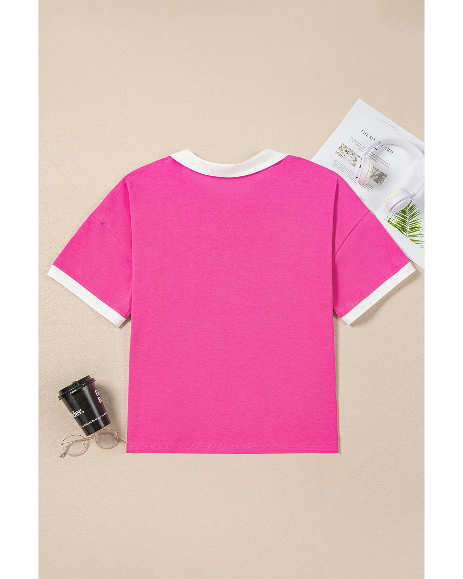 Pink Contrast Trim Collared Split Neck Short Sleeve Plus Size Top – 2X