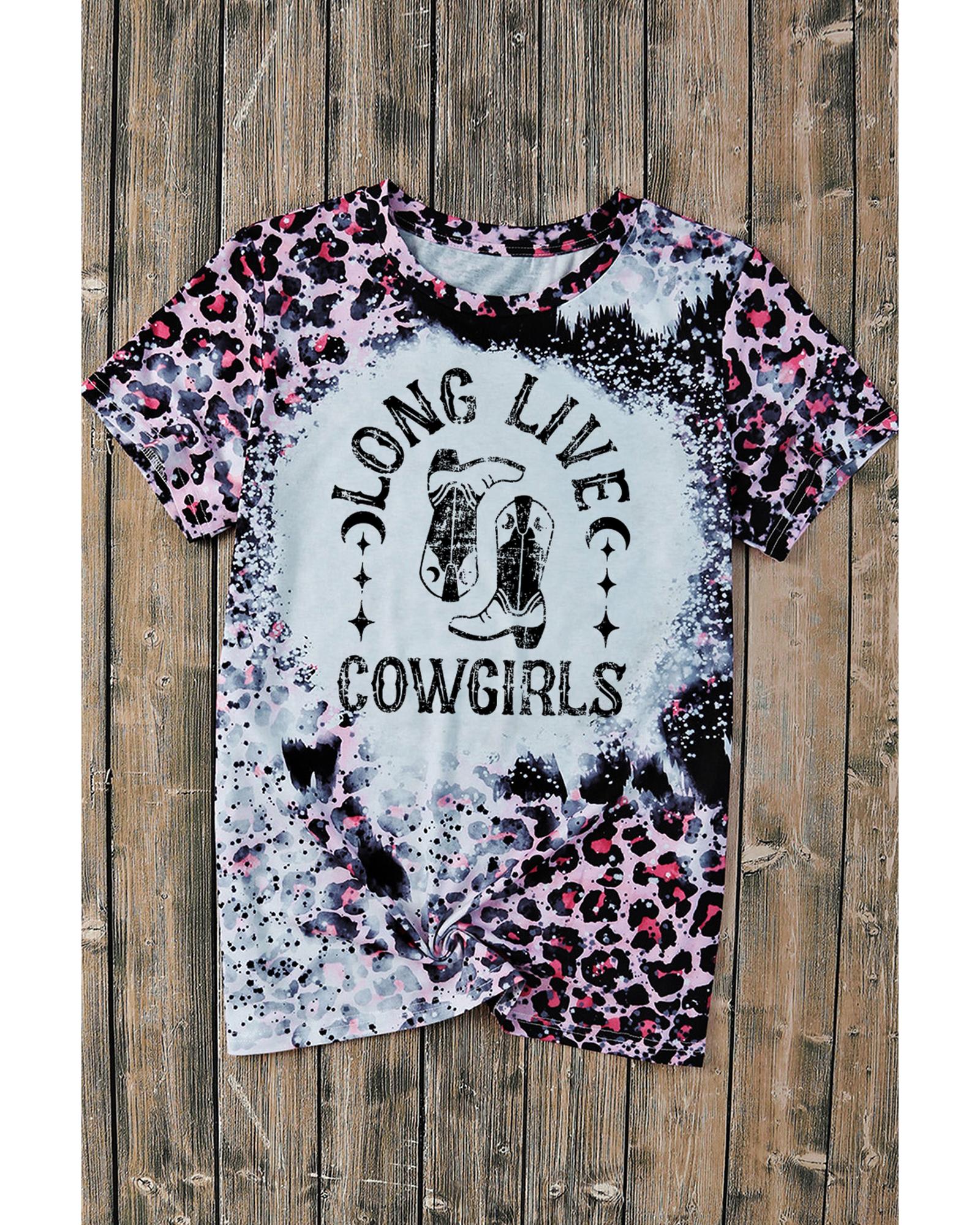 Pink Cowgirls Boots Leopard Bleached Crew Neck T Shirt – L