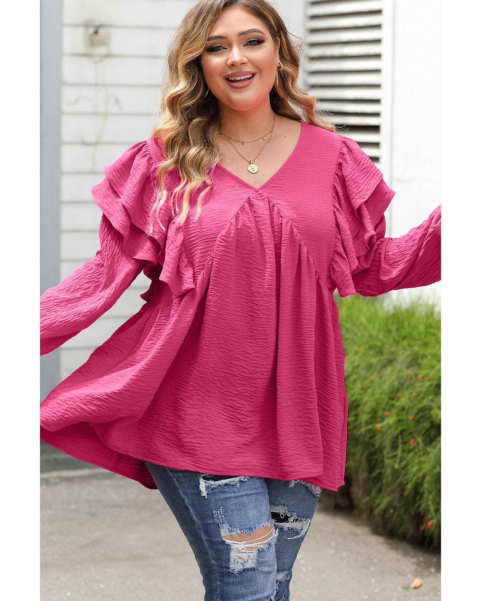 Pink Crinkle Ruffled V Neck Plus Size Blouse – 3X