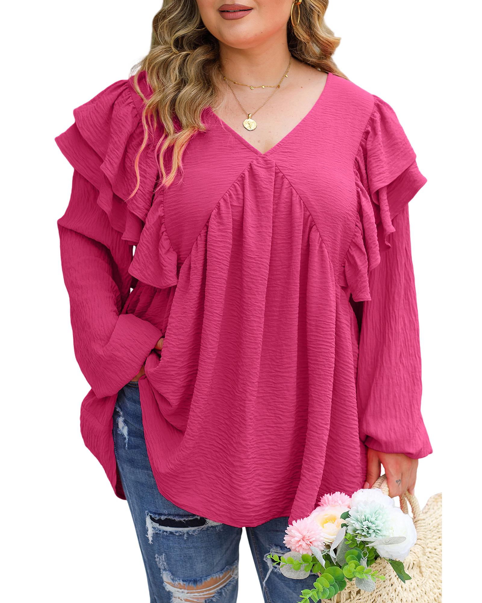 Pink Crinkle Ruffled V Neck Plus Size Blouse - 2X