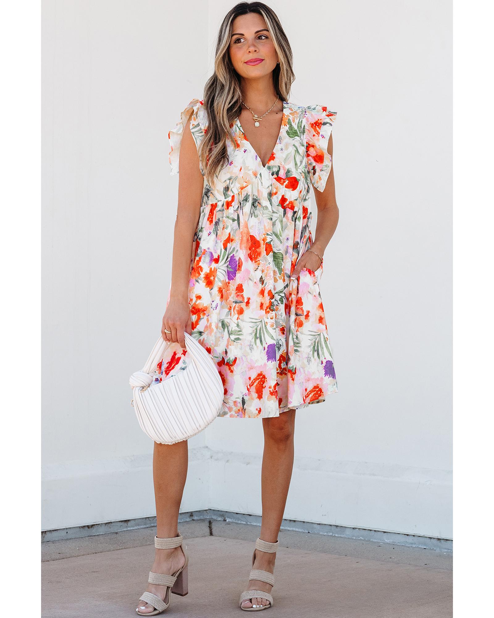 Pink Floral Double Ruffle Sleeve V Neck High Waist Mini Dress – L