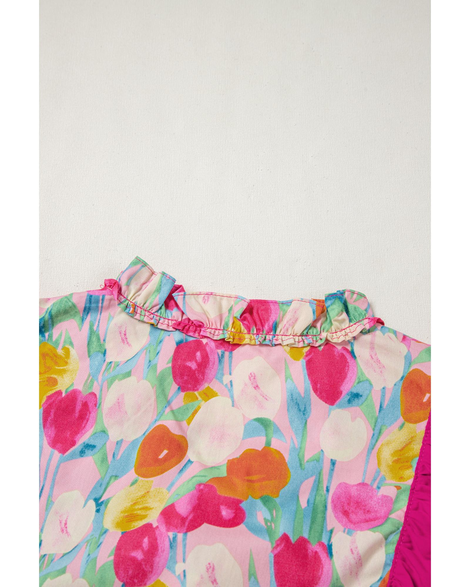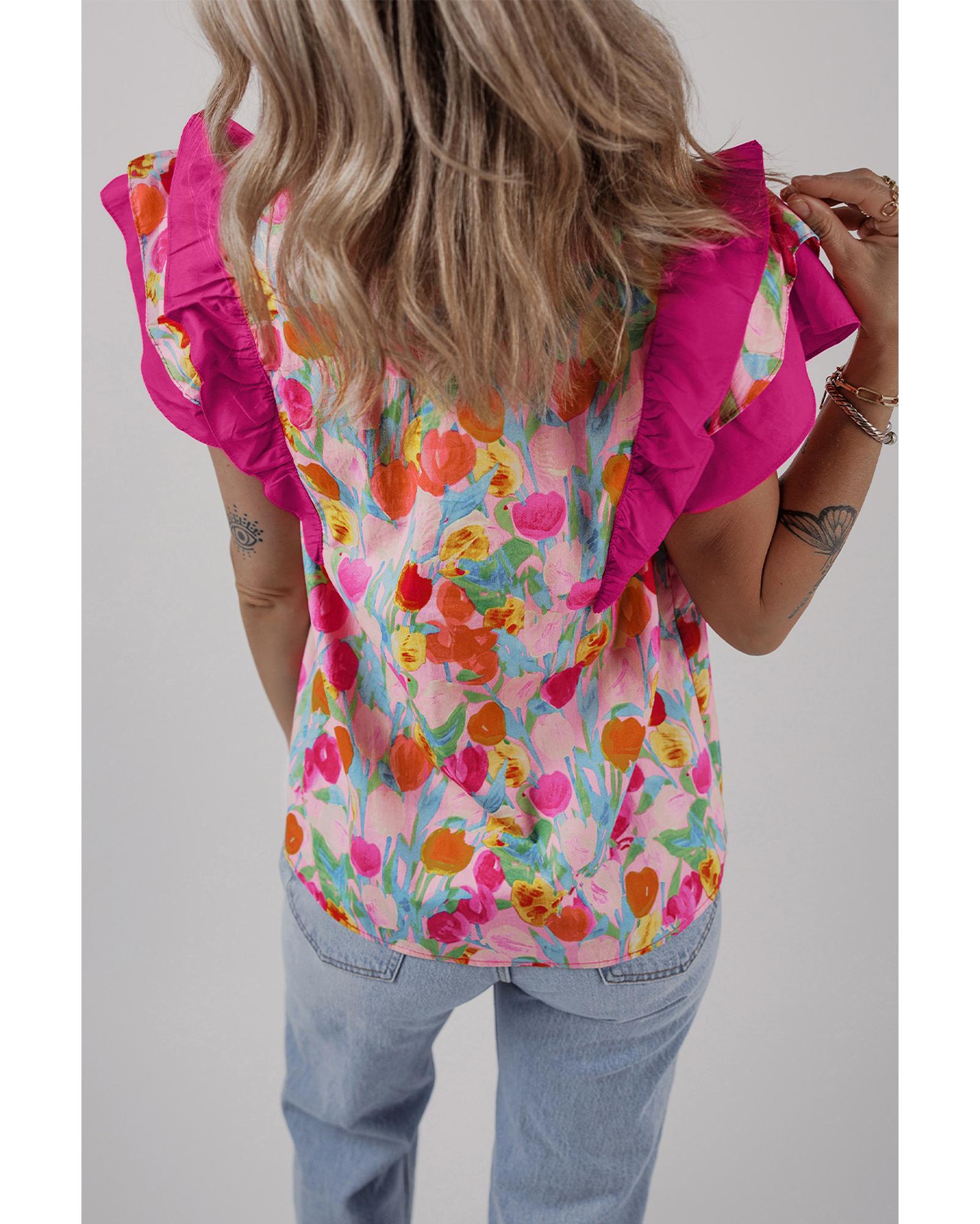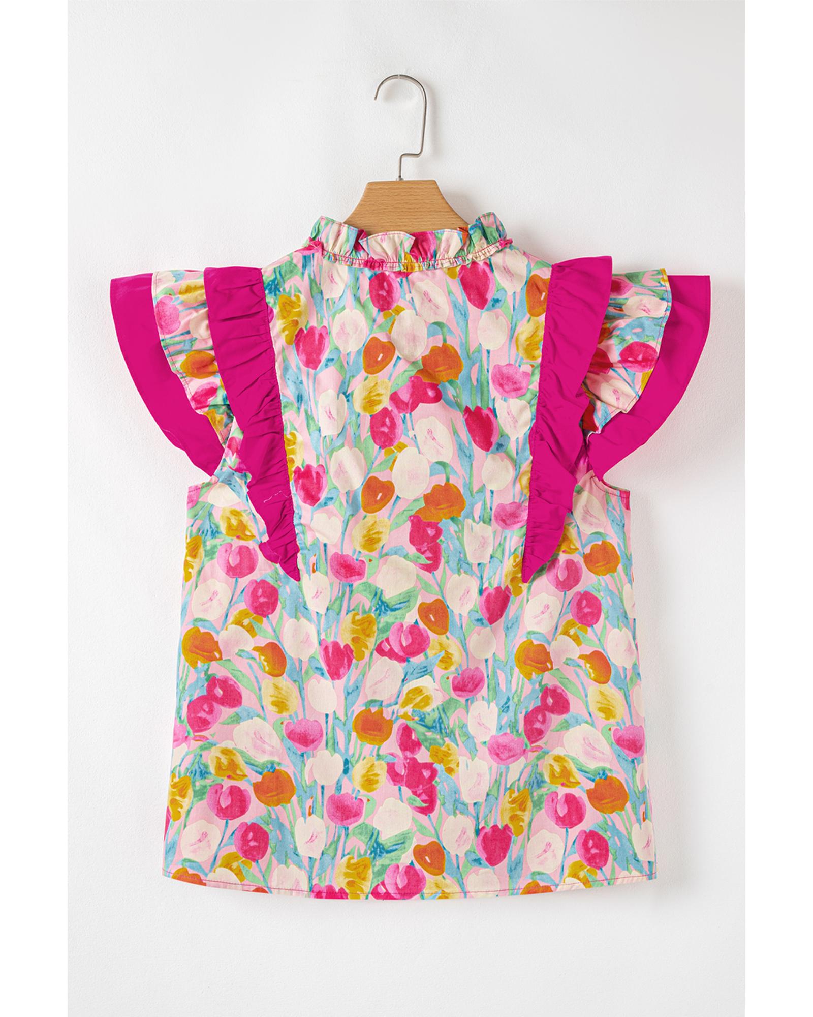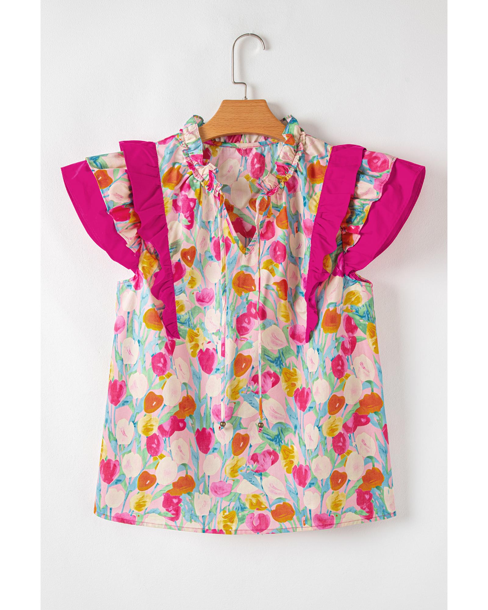 Pink Floral Layered Ruffle Flutter Sleeve Tie V Neck Blouse – M