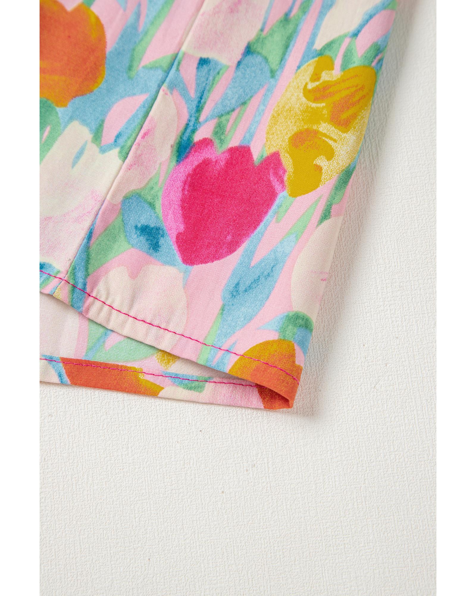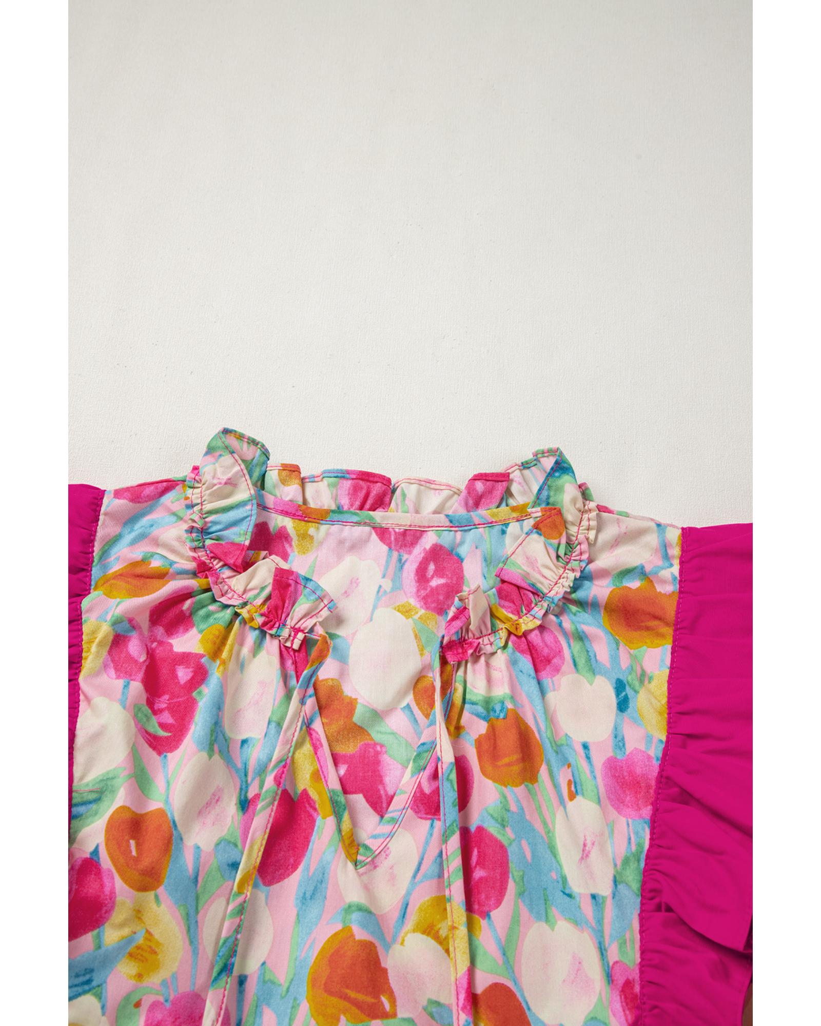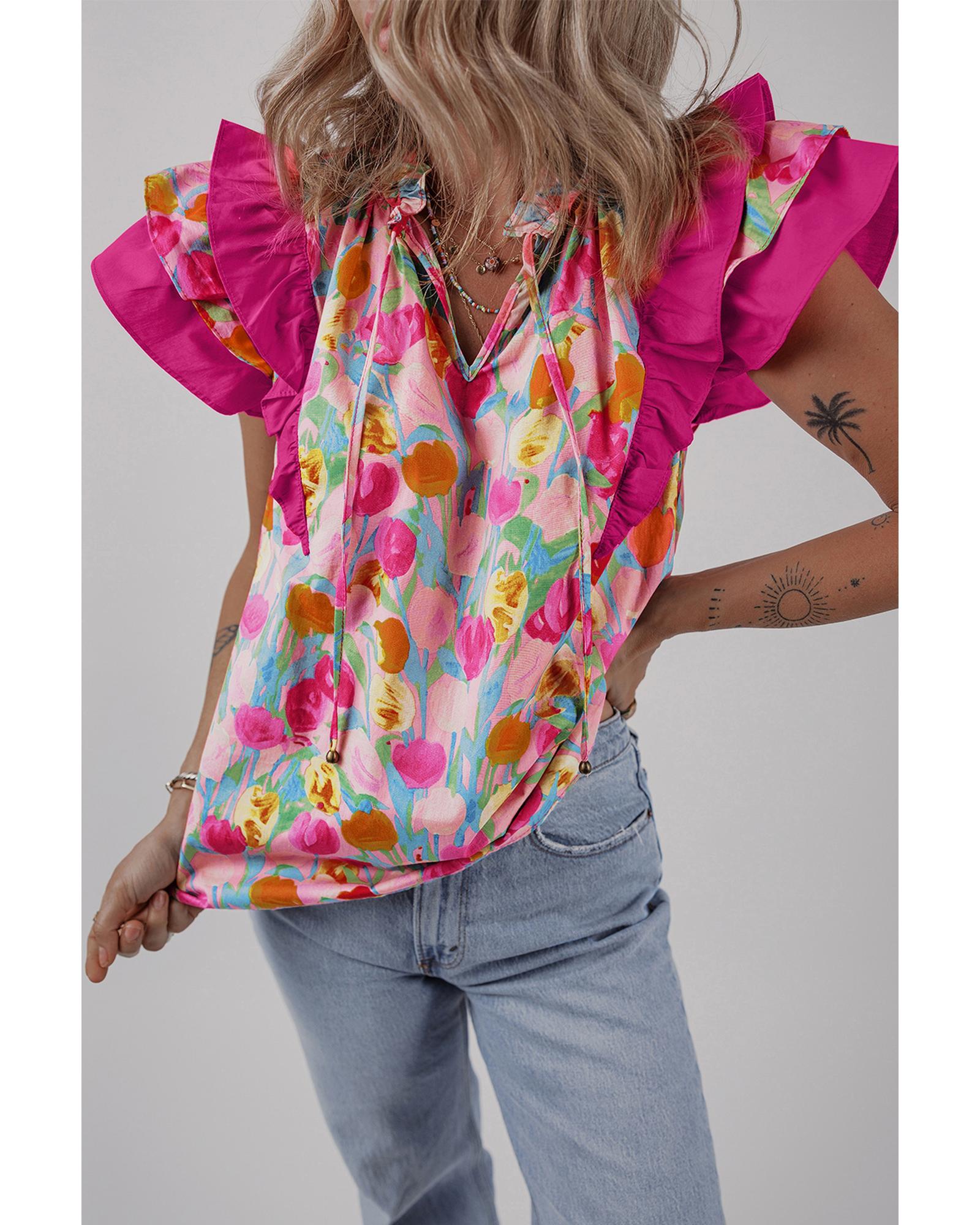 Pink Floral Layered Ruffle Flutter Sleeve Tie V Neck Blouse – XL