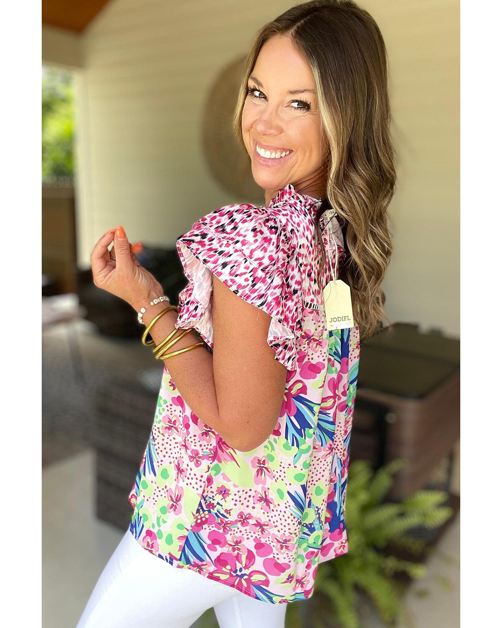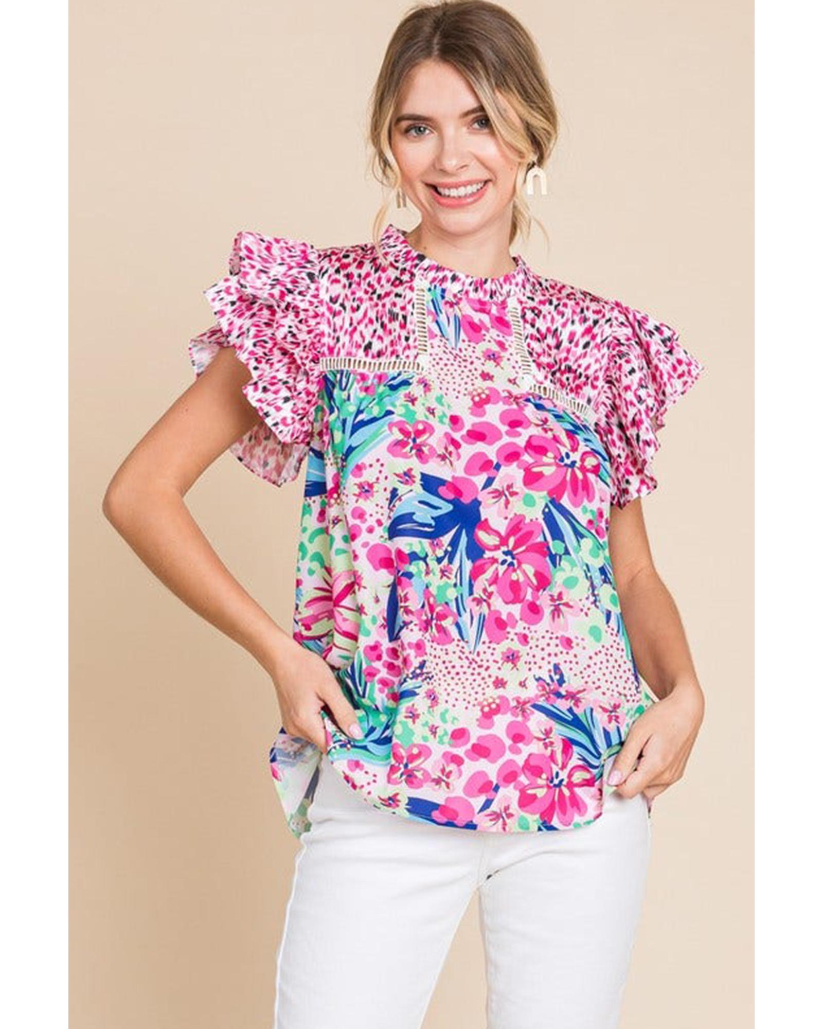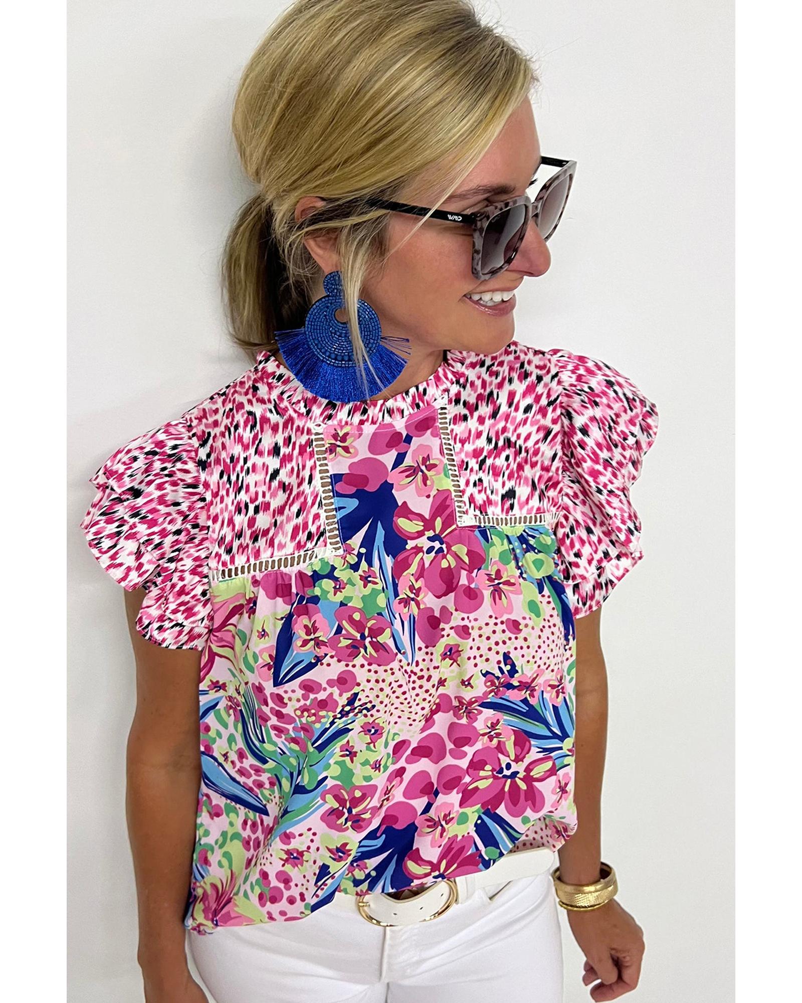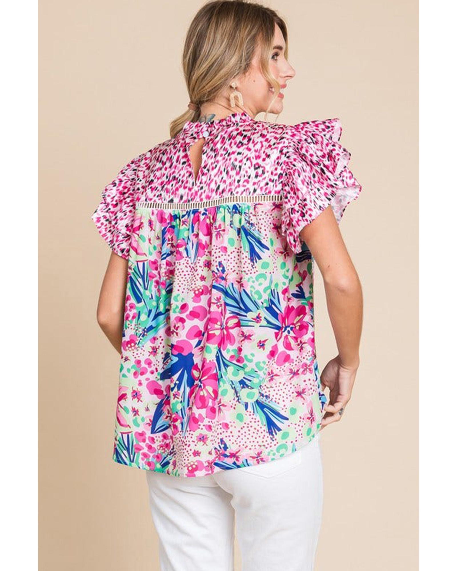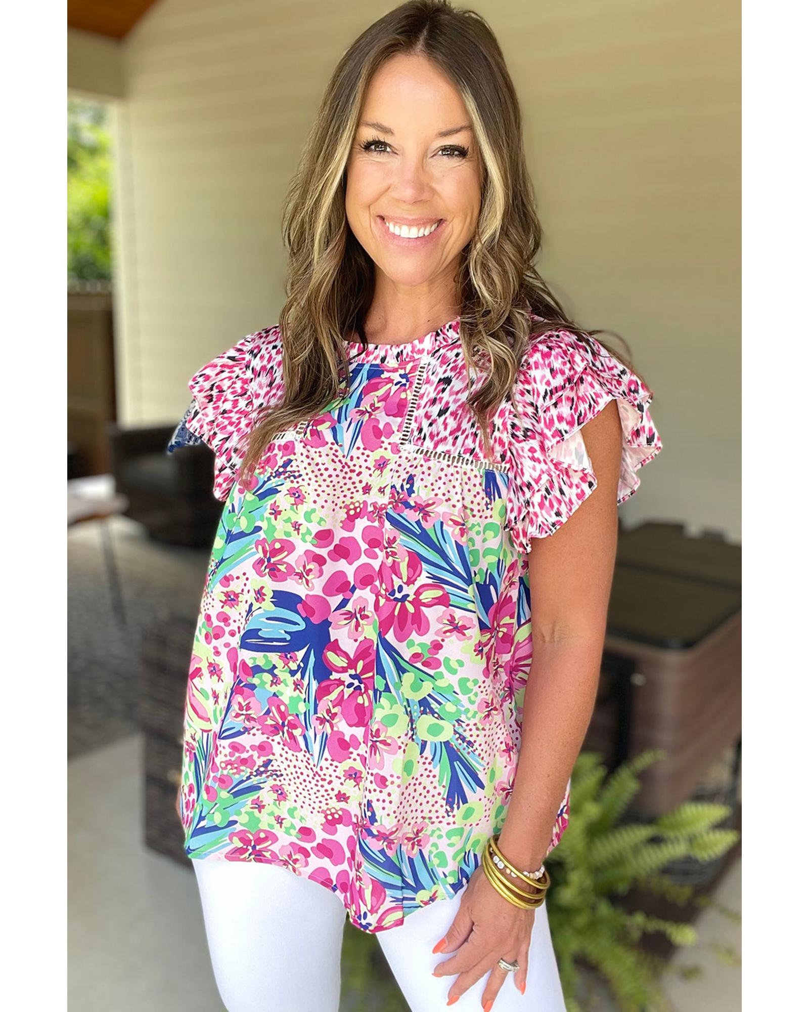 Pink Floral Mixed Print Ruffle Cap Sleeve Blouse – L