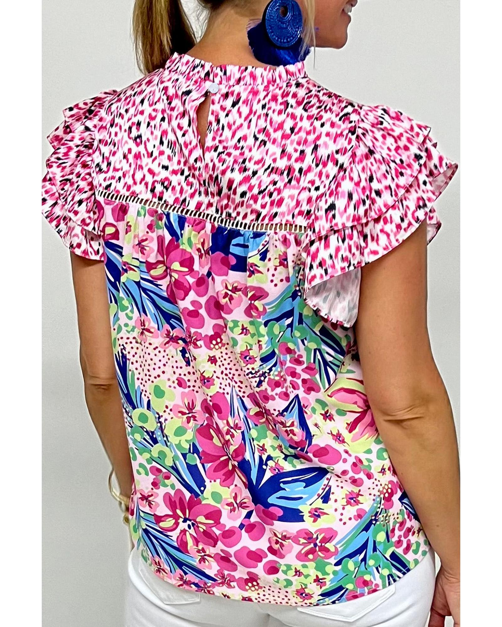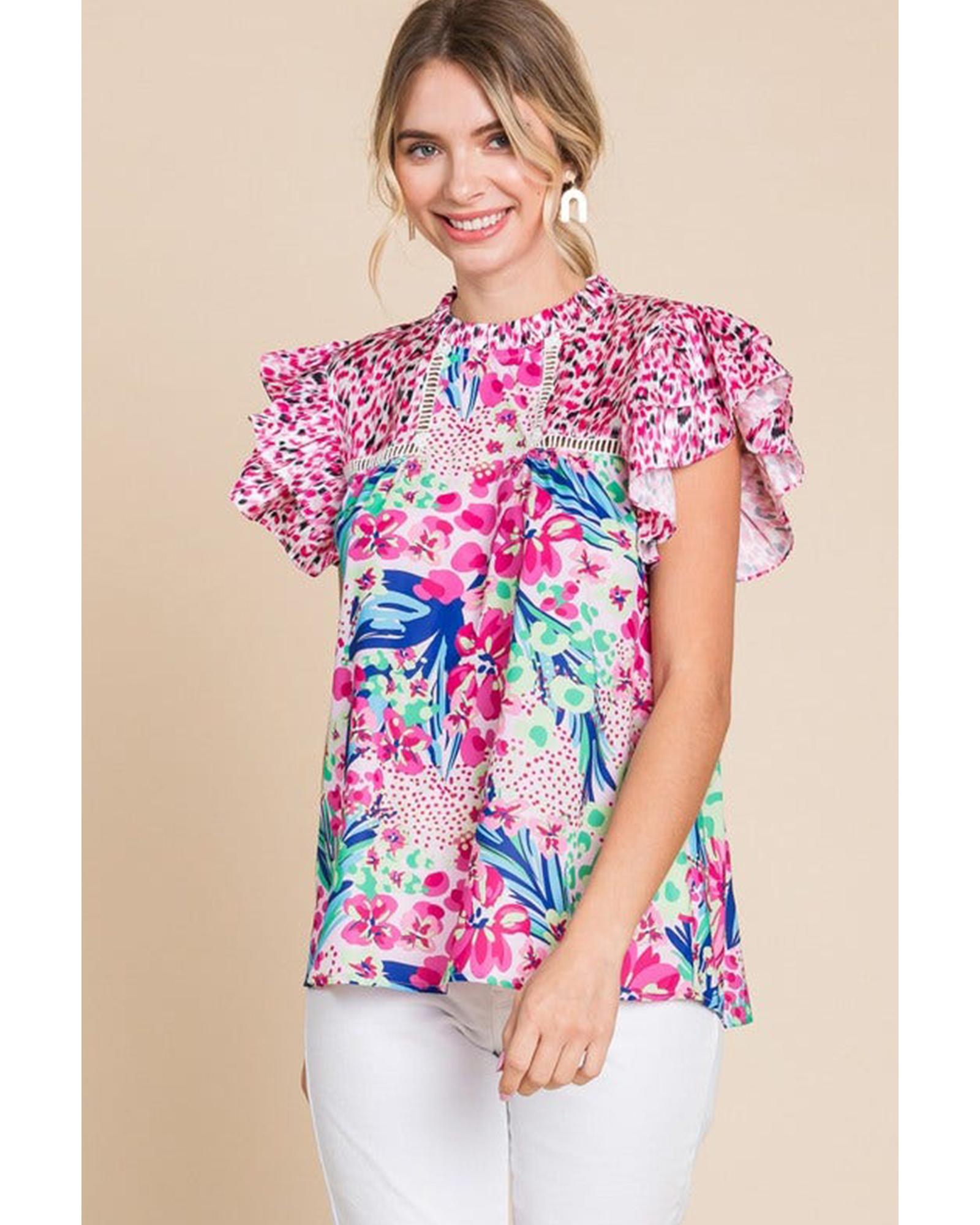 Pink Floral Mixed Print Ruffle Cap Sleeve Blouse – S
