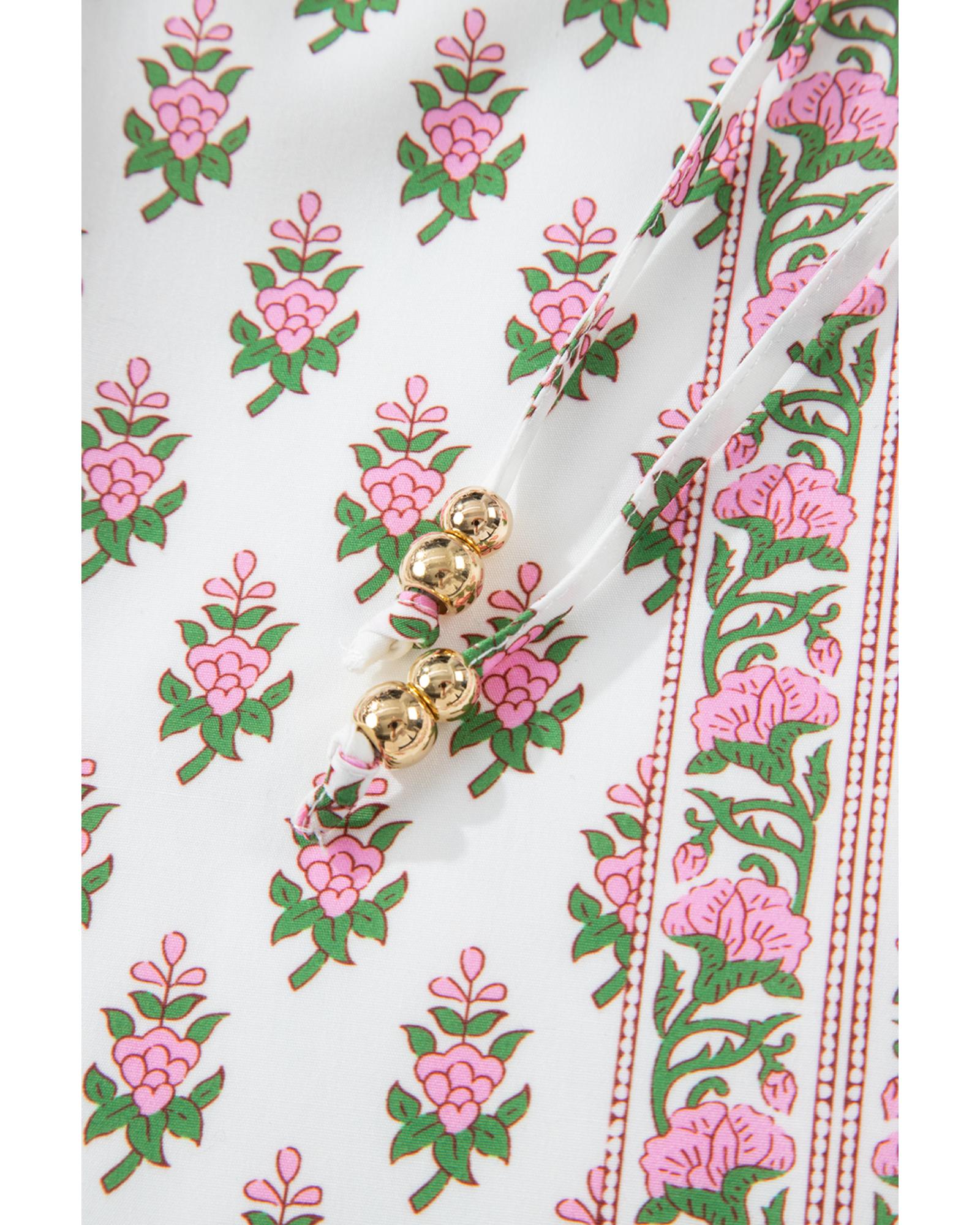 Pink Floral Print Bubble Sleeve Neck Tie Ruffled Dress – S