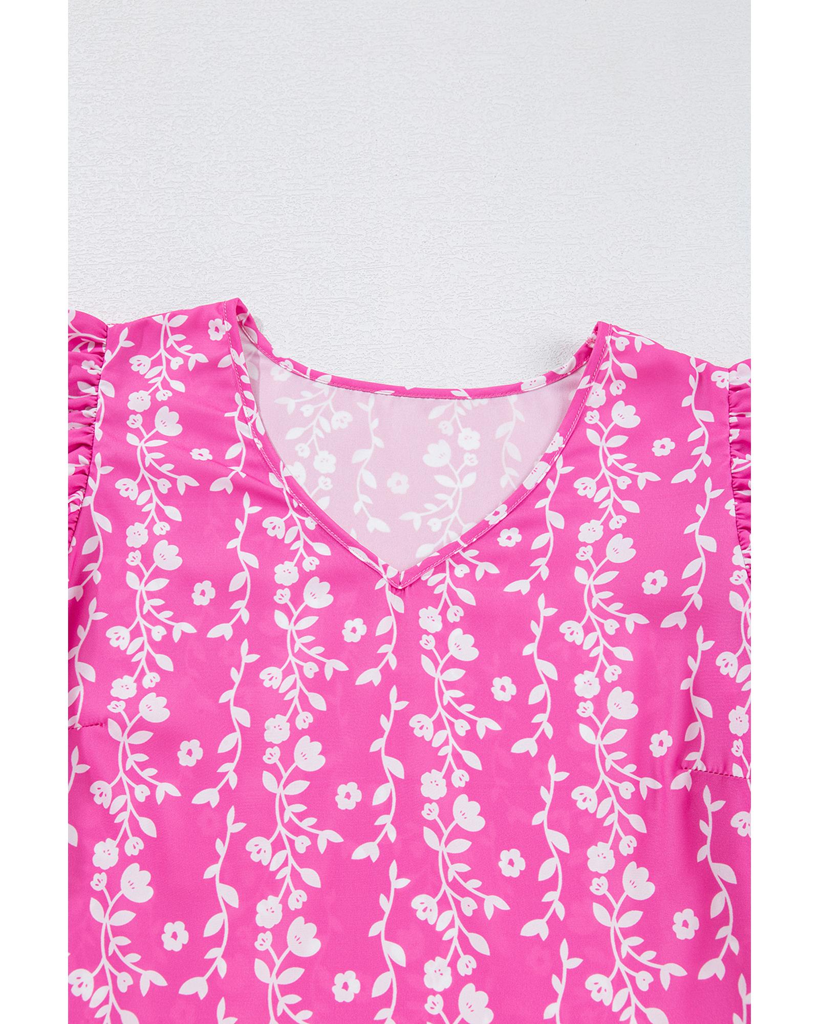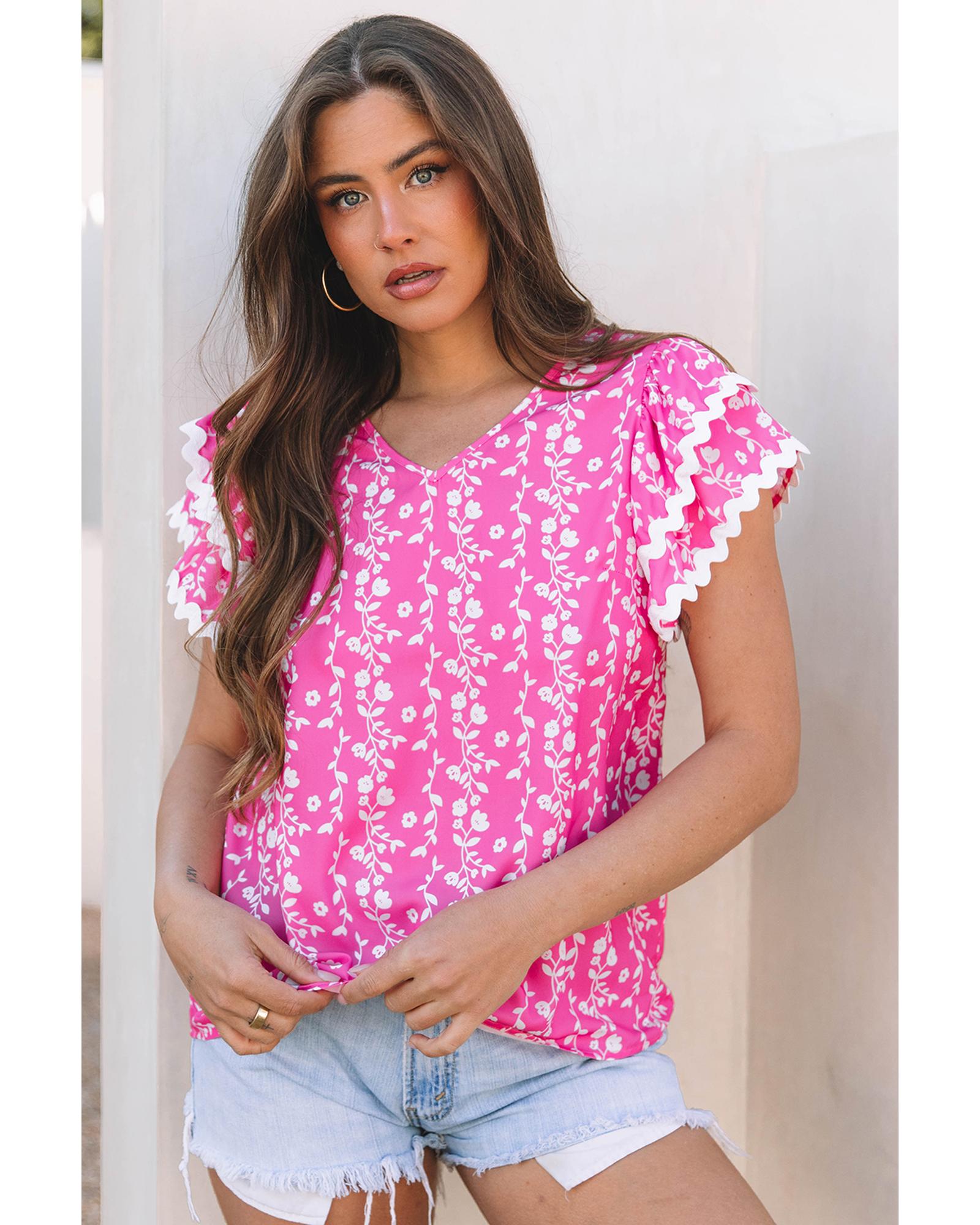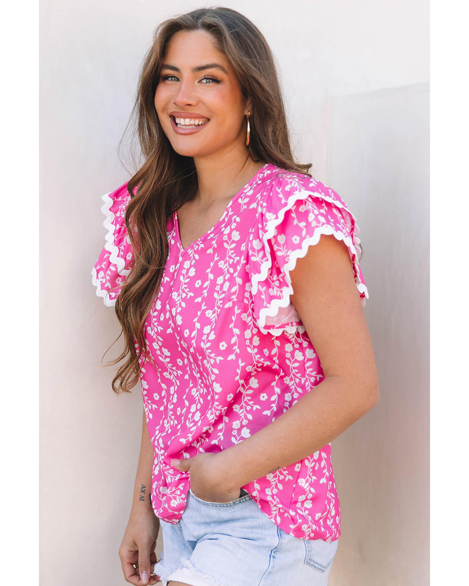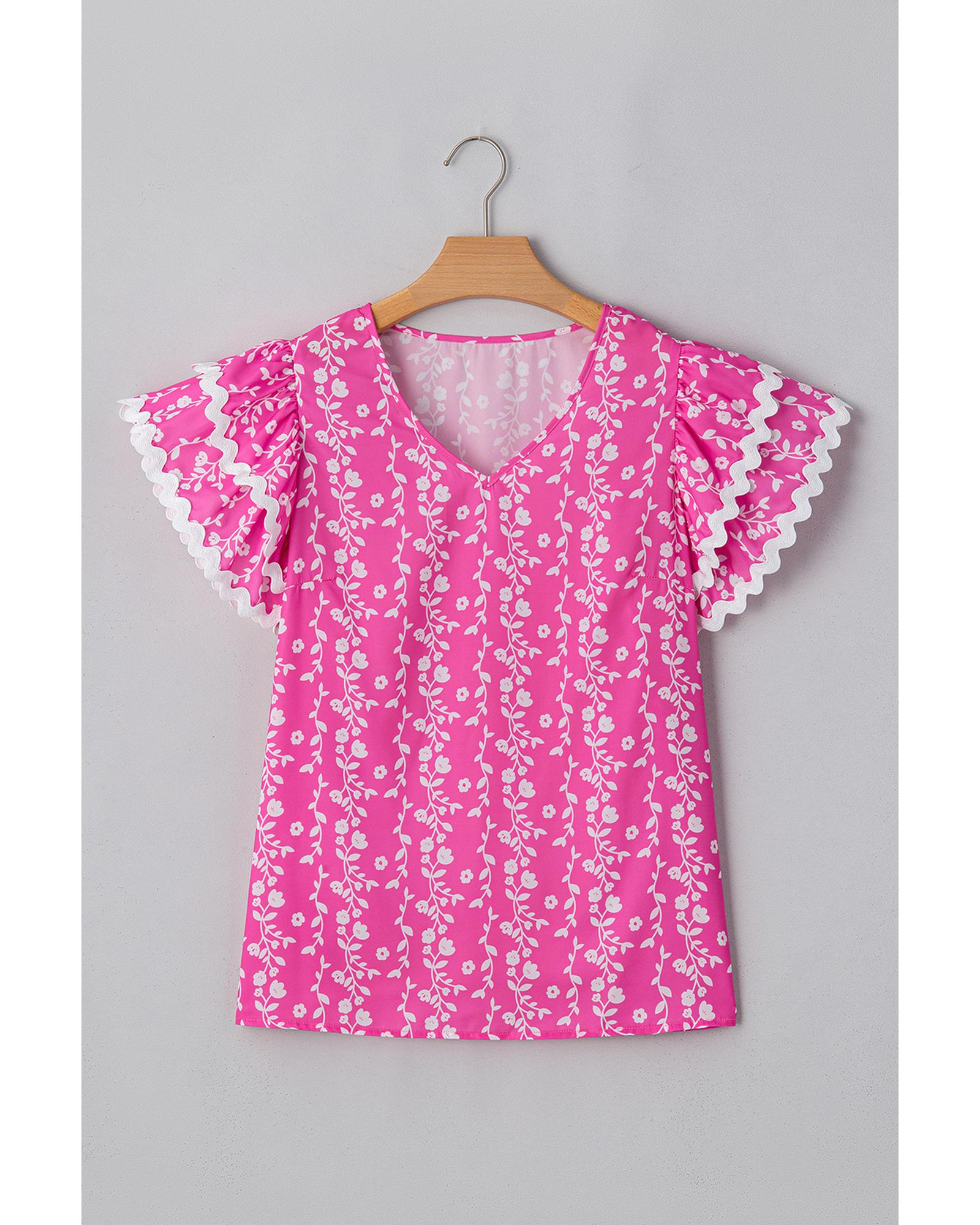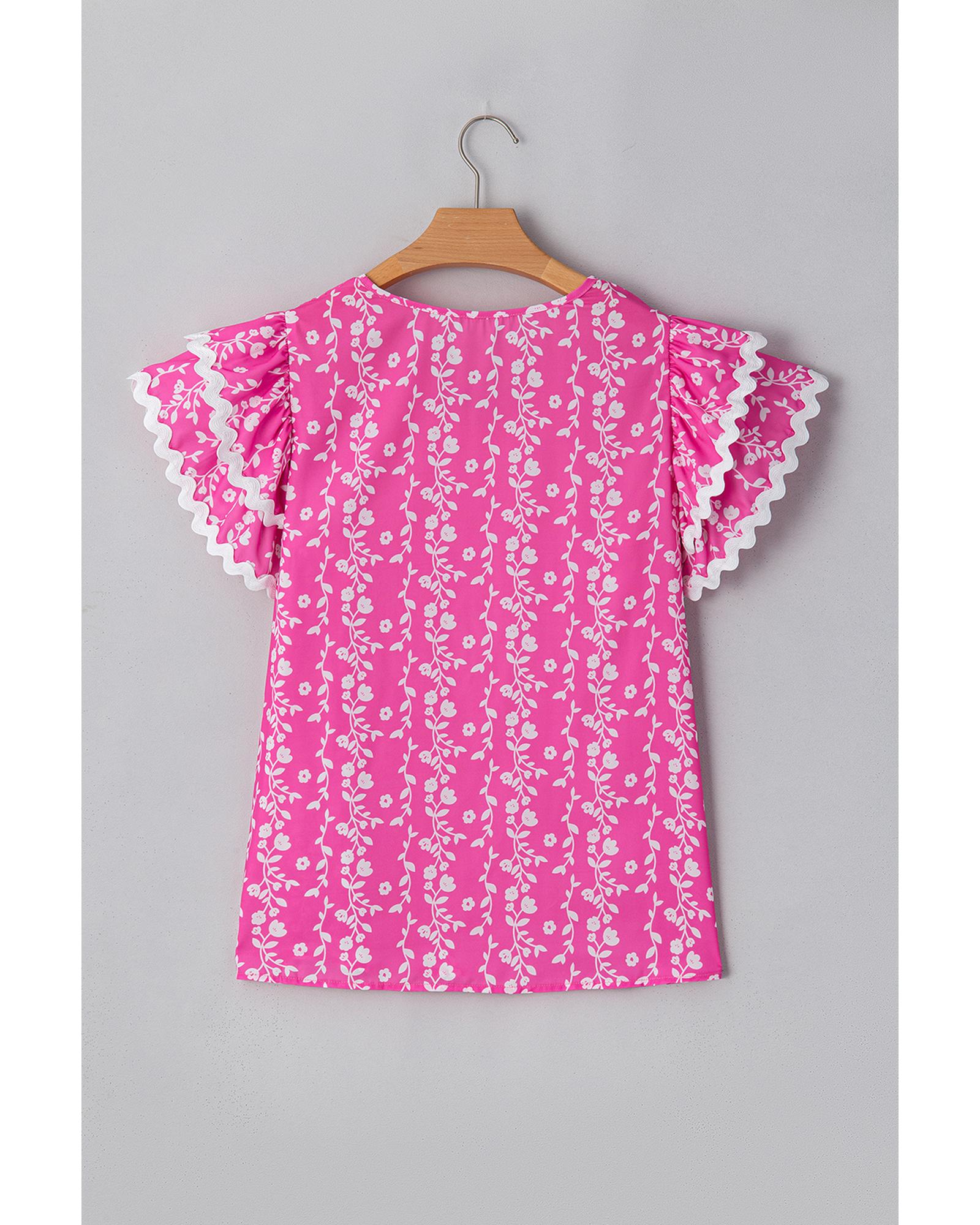 Pink Floral Print Ric-rac Tiered Ruffled V Neck Blouse – S