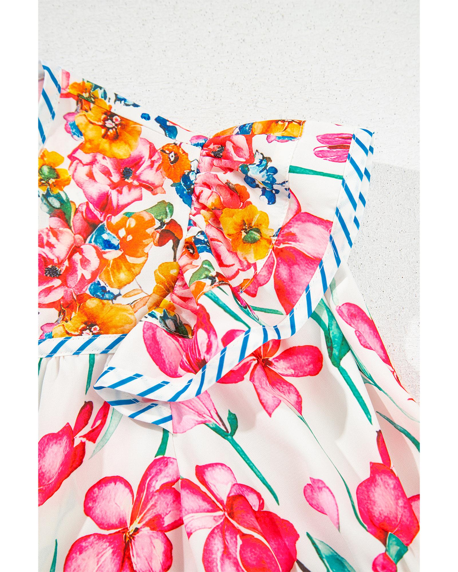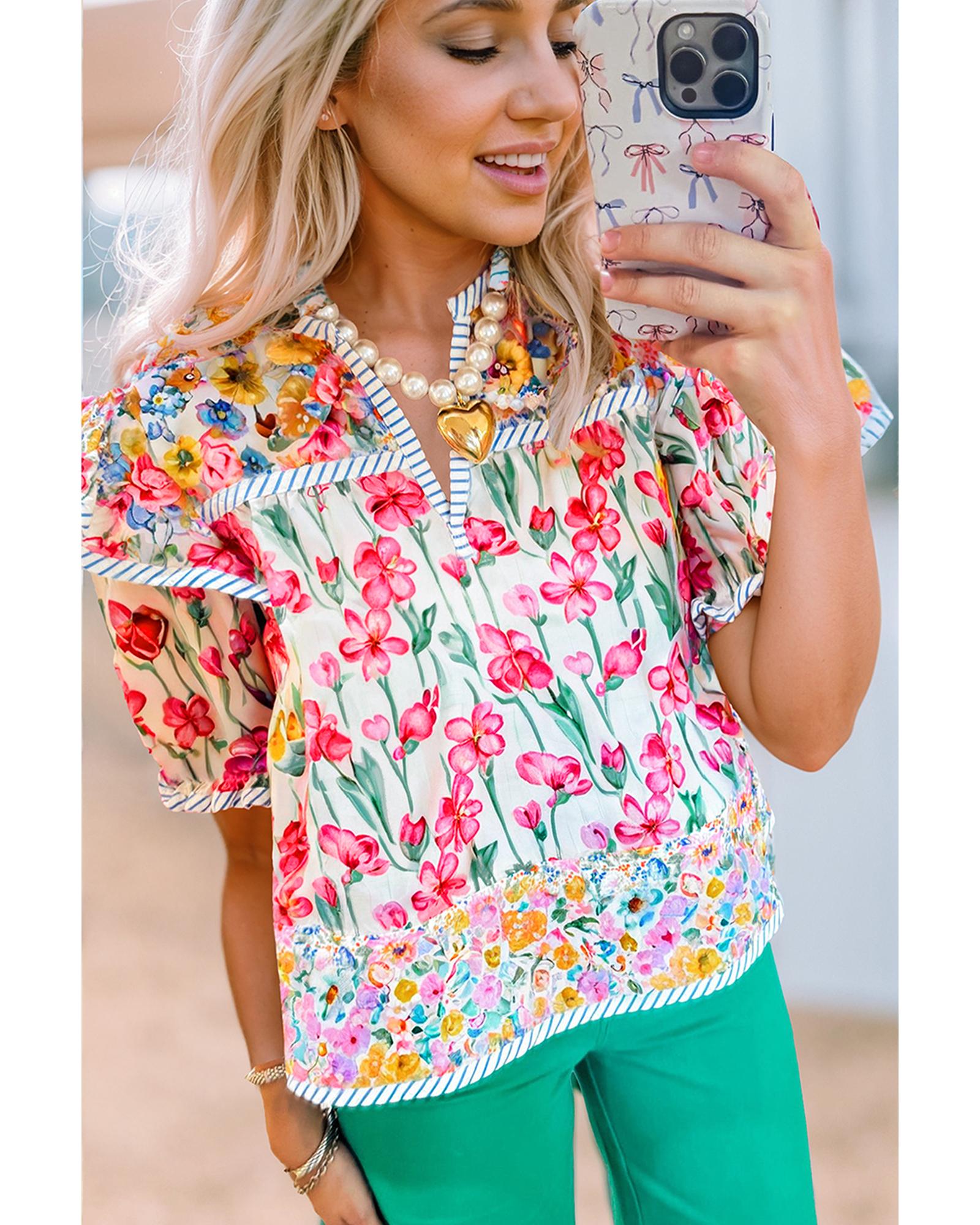 Pink Floral Print Striped Detail Split Neck Short Sleeve Blouse – XL