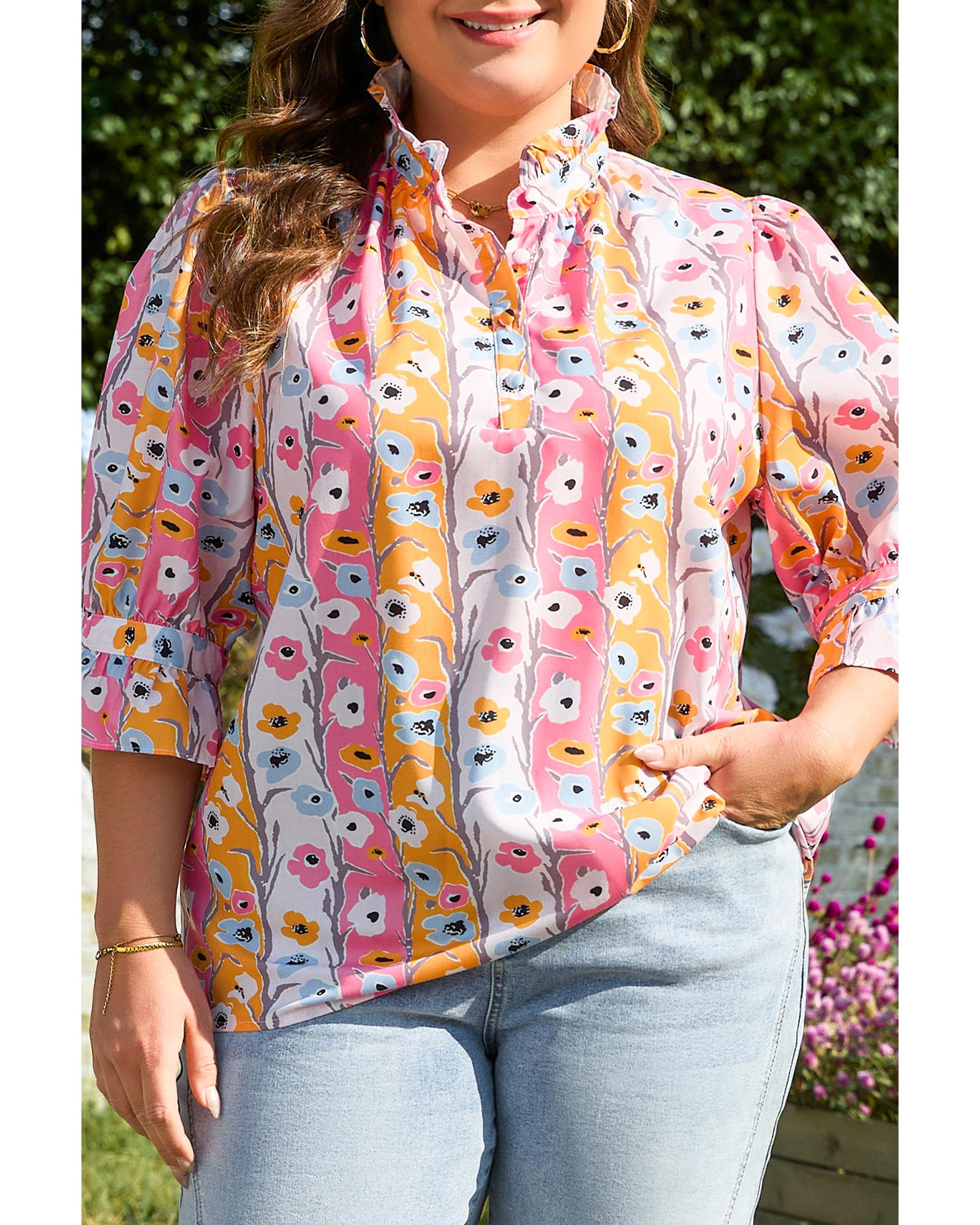 Pink Floral Ruffled Collar Bracelet Sleeve Plus Size Blouse Top – 2X