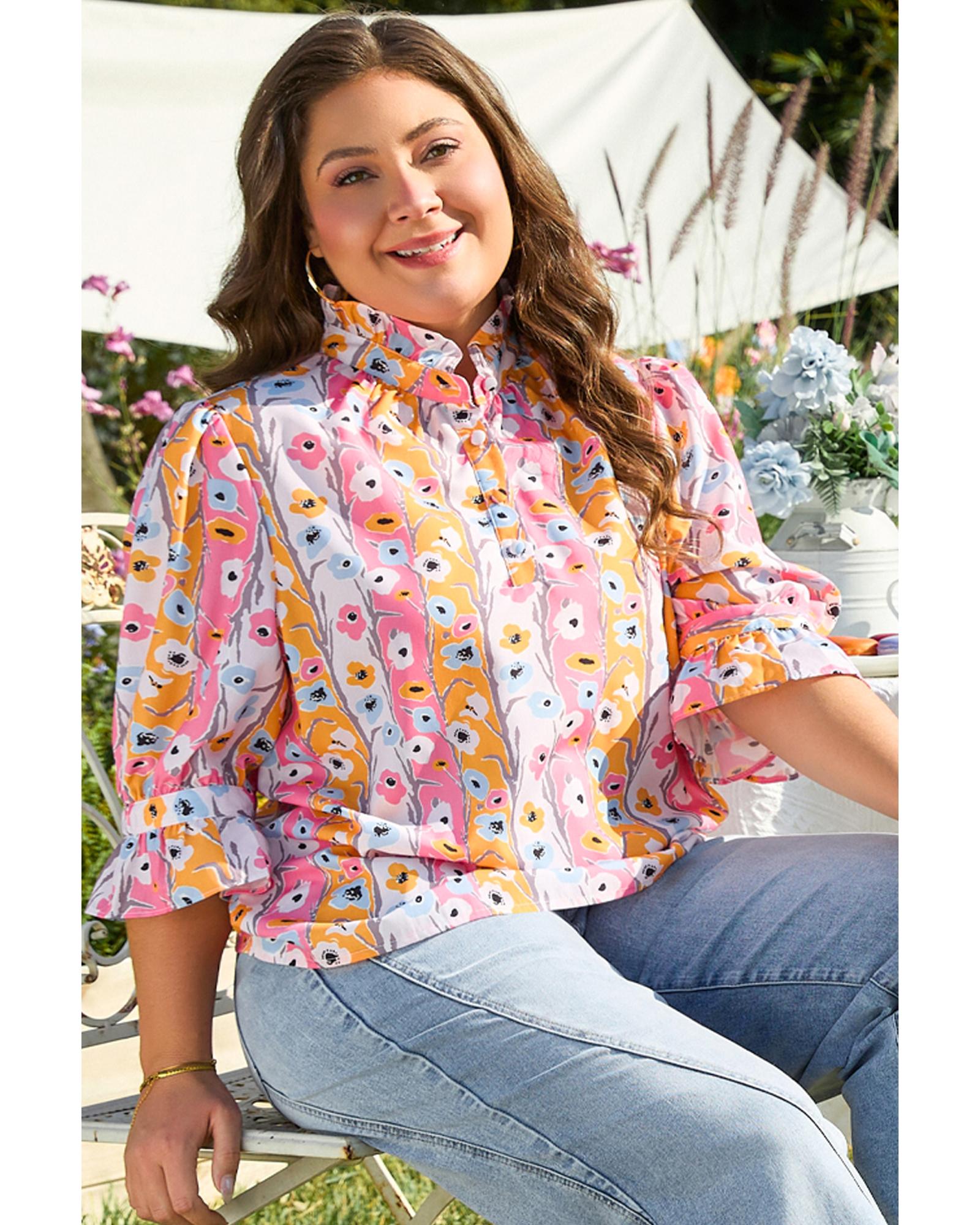 Pink Floral Ruffled Collar Bracelet Sleeve Plus Size Blouse Top – 3X