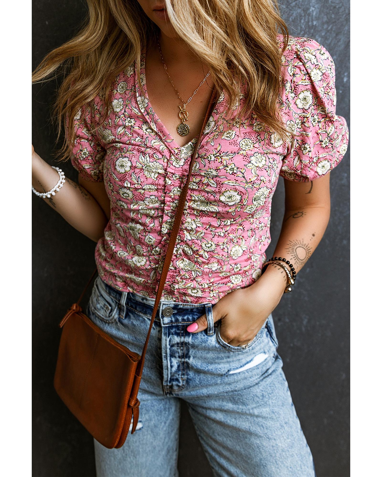 • Pink Floral Short Puff Sleeve V Neck Ruched Blouse