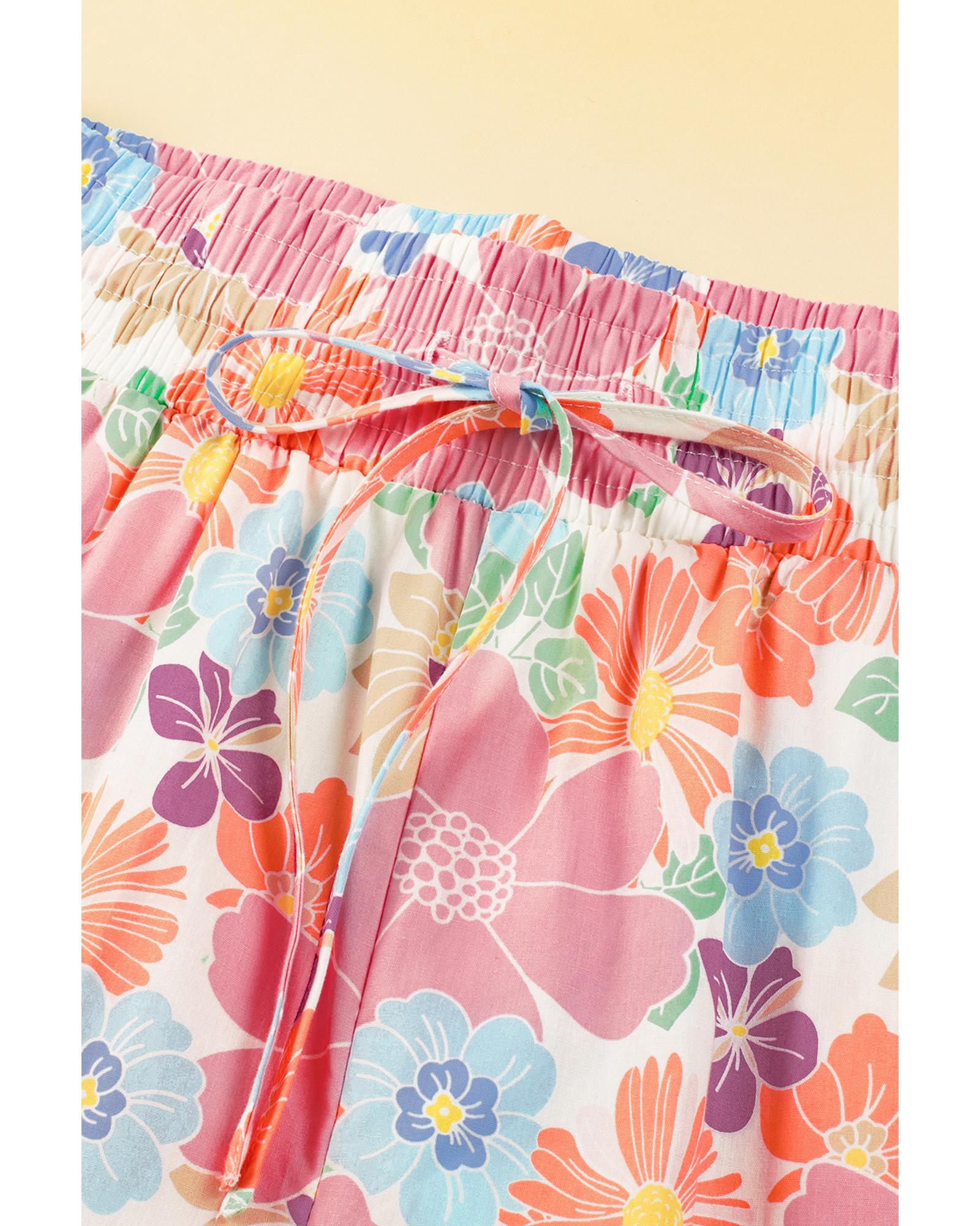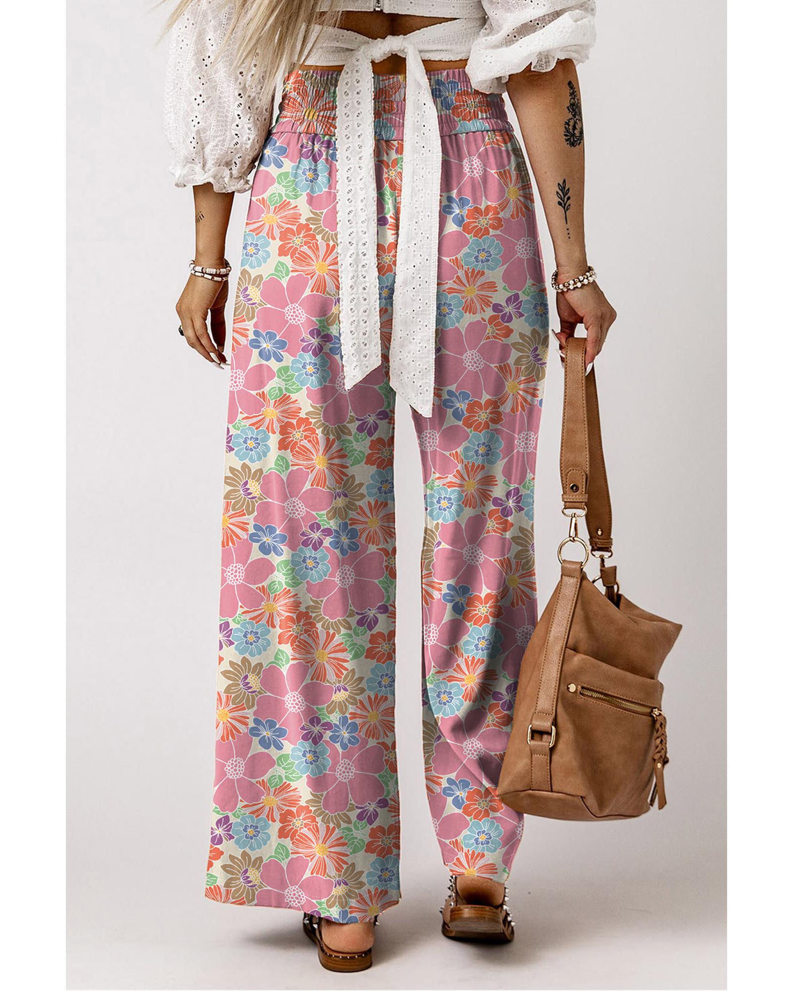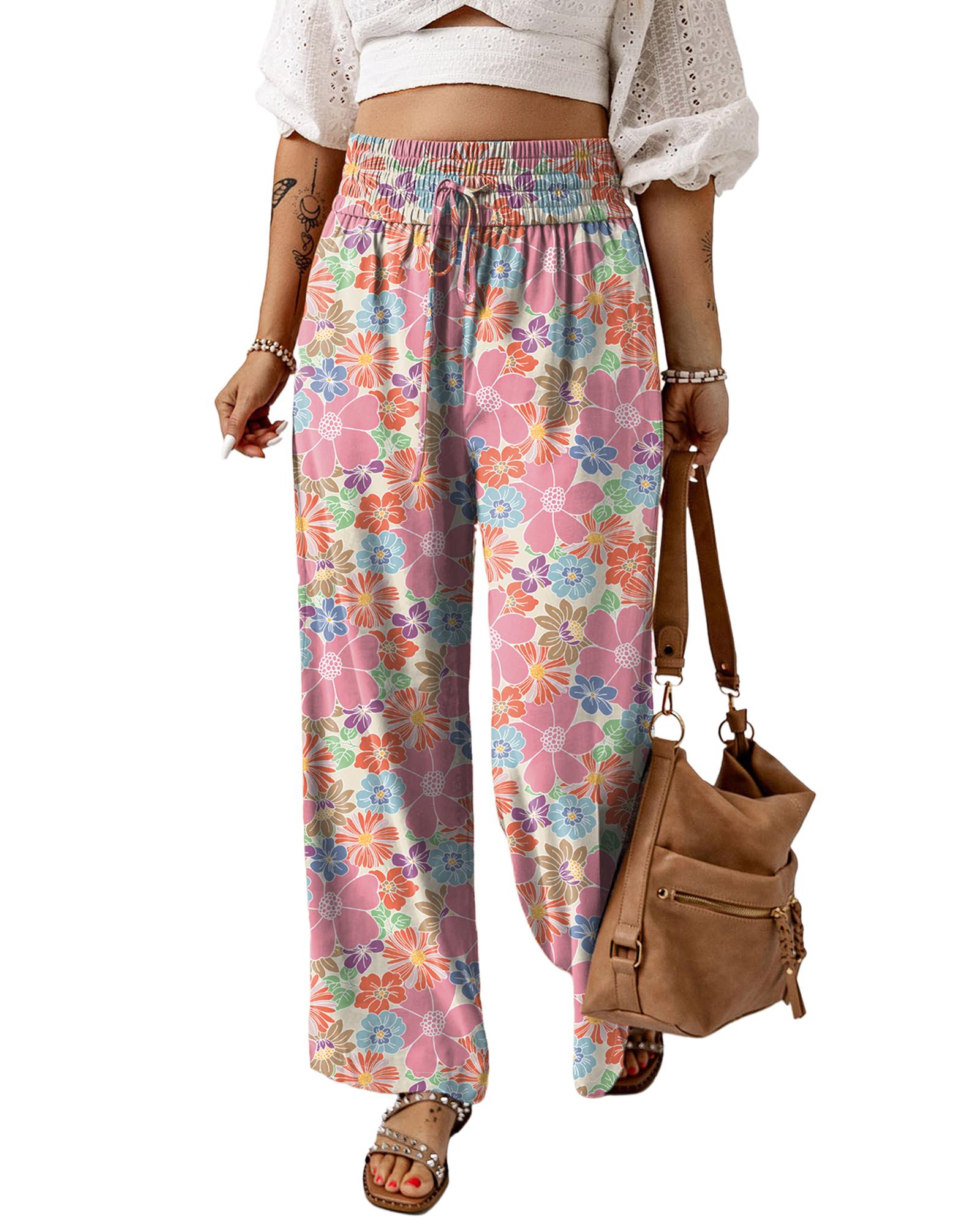 Pink Floral Smocked Waist Loose Pants – M