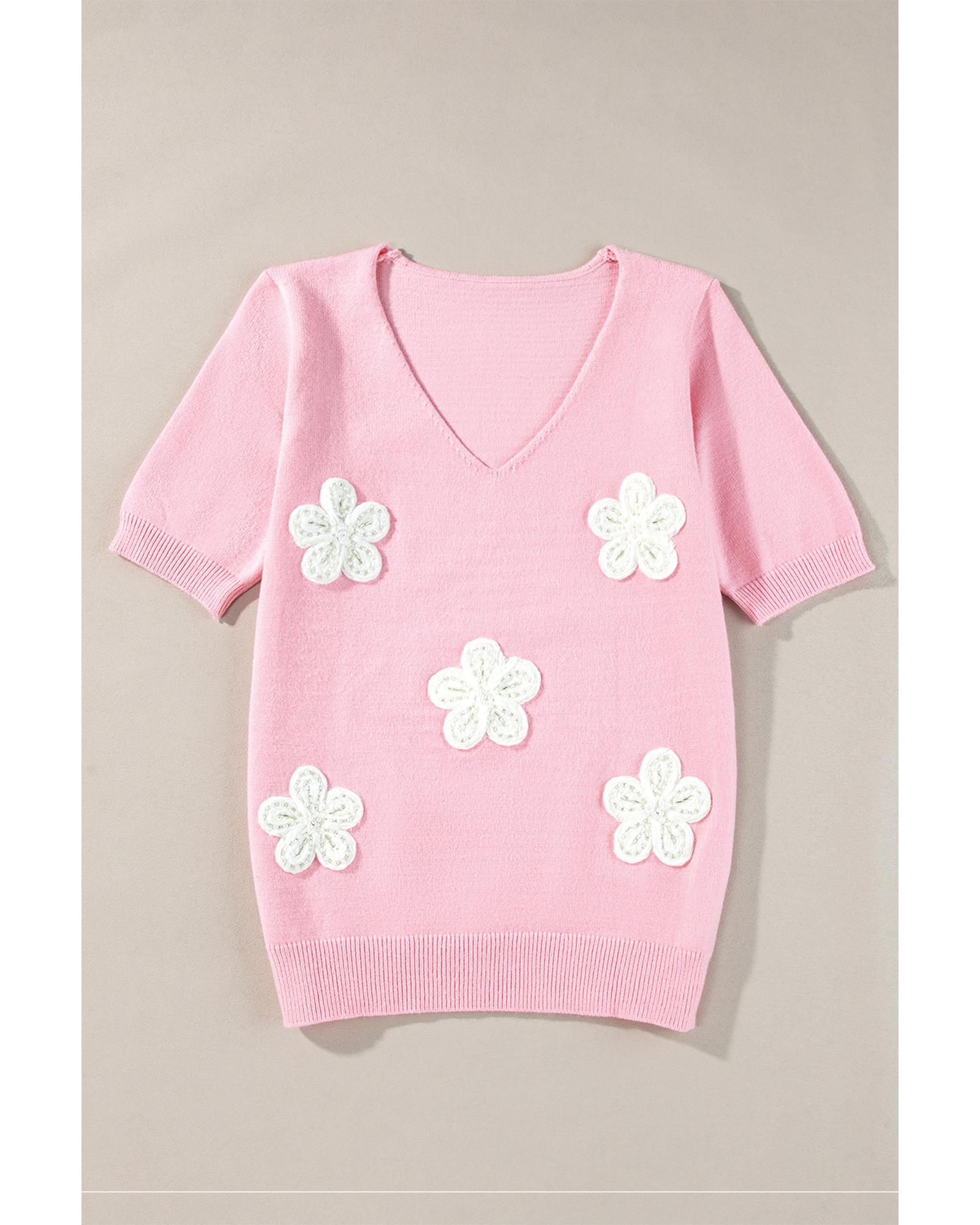 - Pink Flower Crochet V Neck Short Sleeve Sweater
