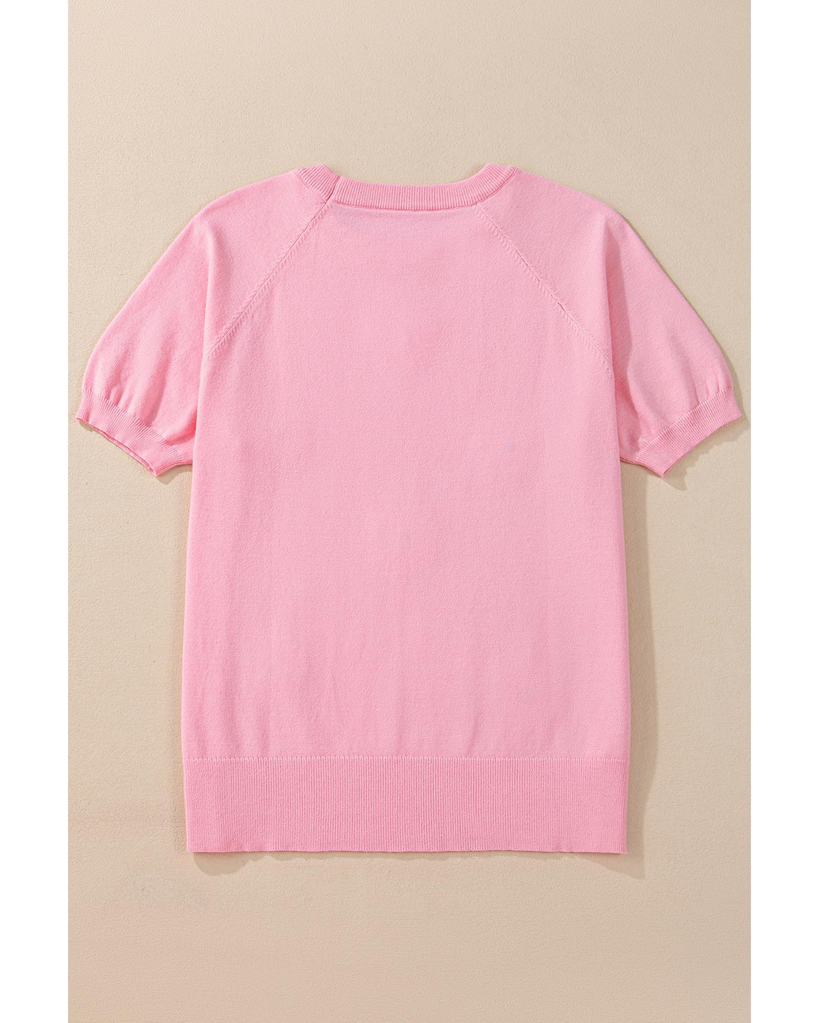 Pink Flower Pattern Short Sleeve Knitted Top – L