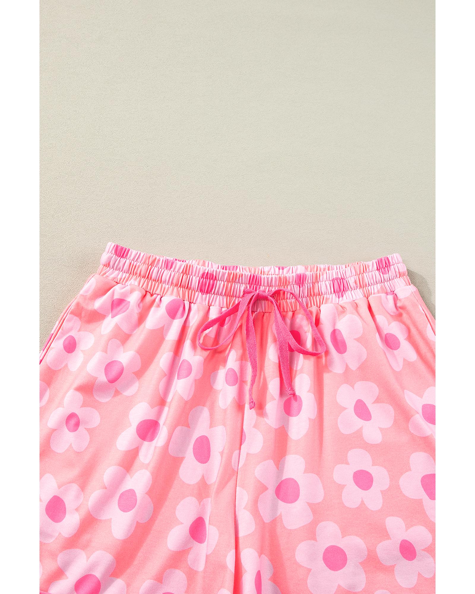 - Sweet and stylish Pink Flower Print Short Sleeve Shirt Pajamas Set