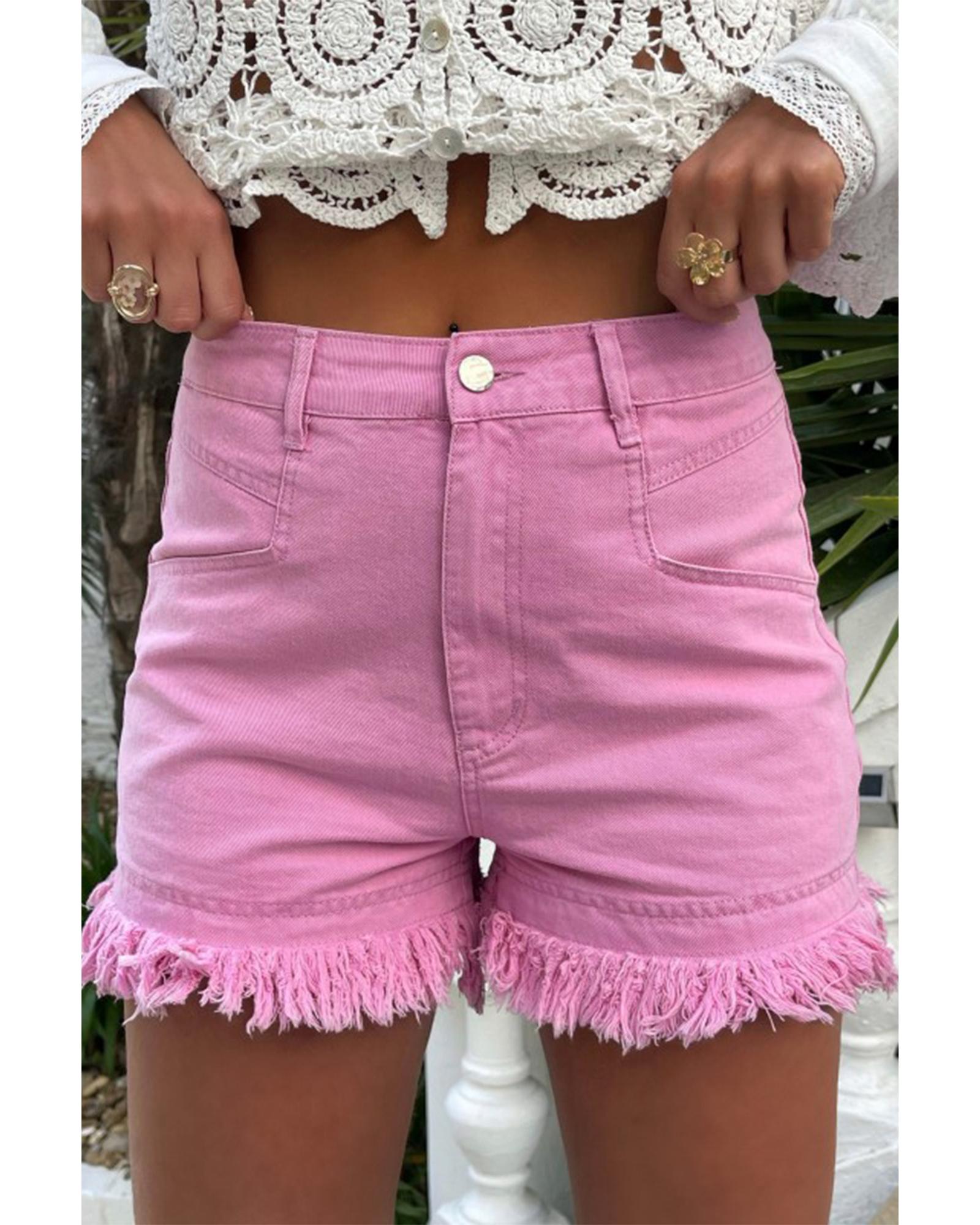 - Pink Frayed Edge Mid Rise Denim Shorts