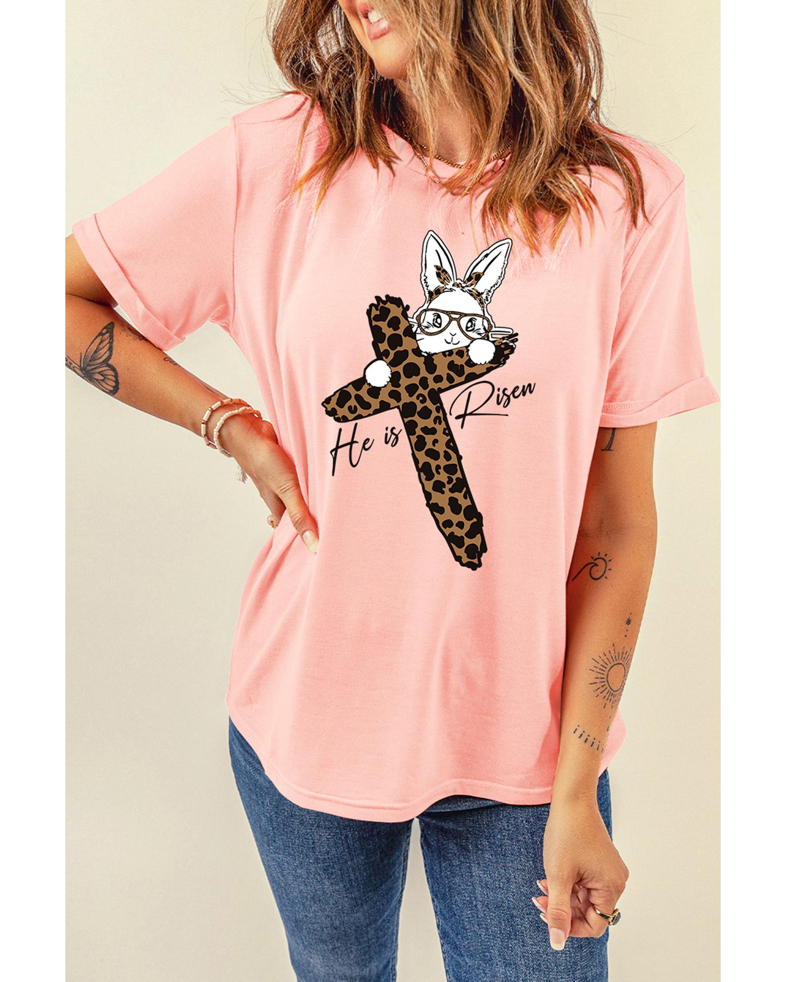 - Womens Pink He is Risen Easter Bunny Leopard Cross Graphic Tee