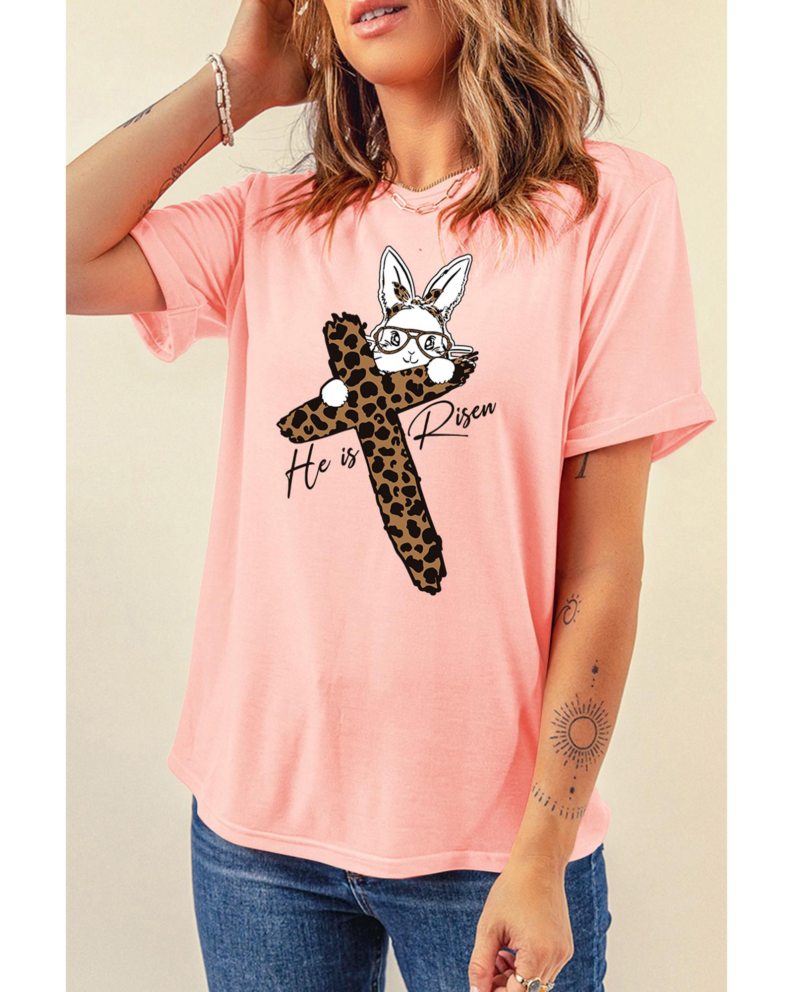 Pink He is Risen Easter Bunny Leopard Cross Graphic Tee – XL