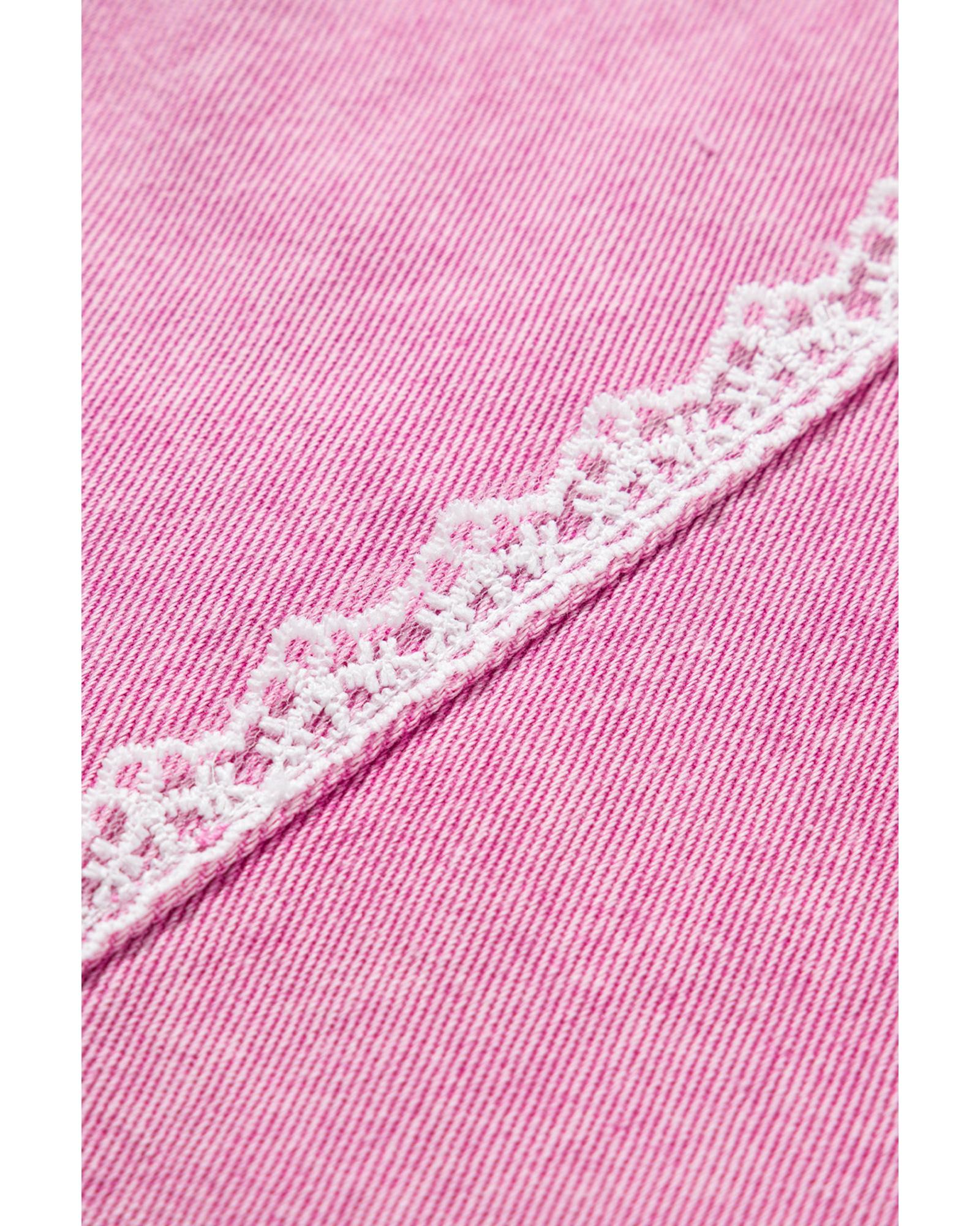 • Pink Lace Patchwork Distressed Buttoned Denim Jacket