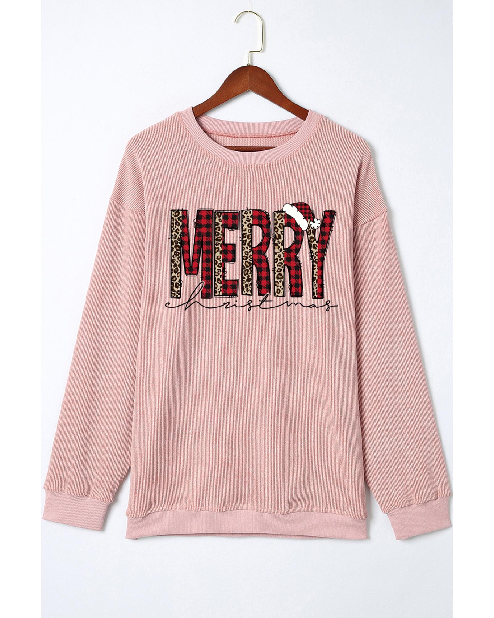 Pink MERRY Christmas Plaid Leopard Print Corded Sweatshirt – L