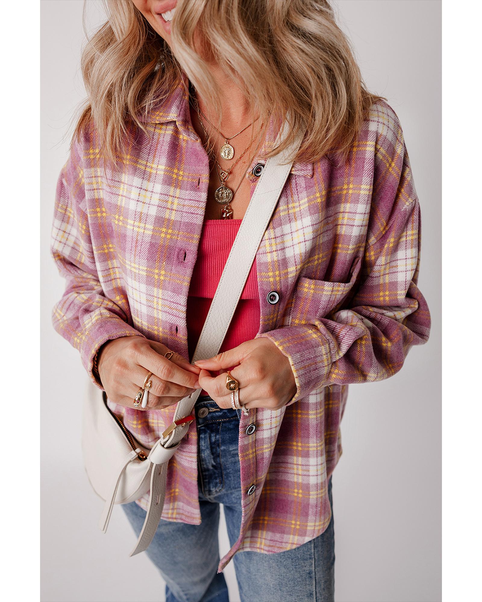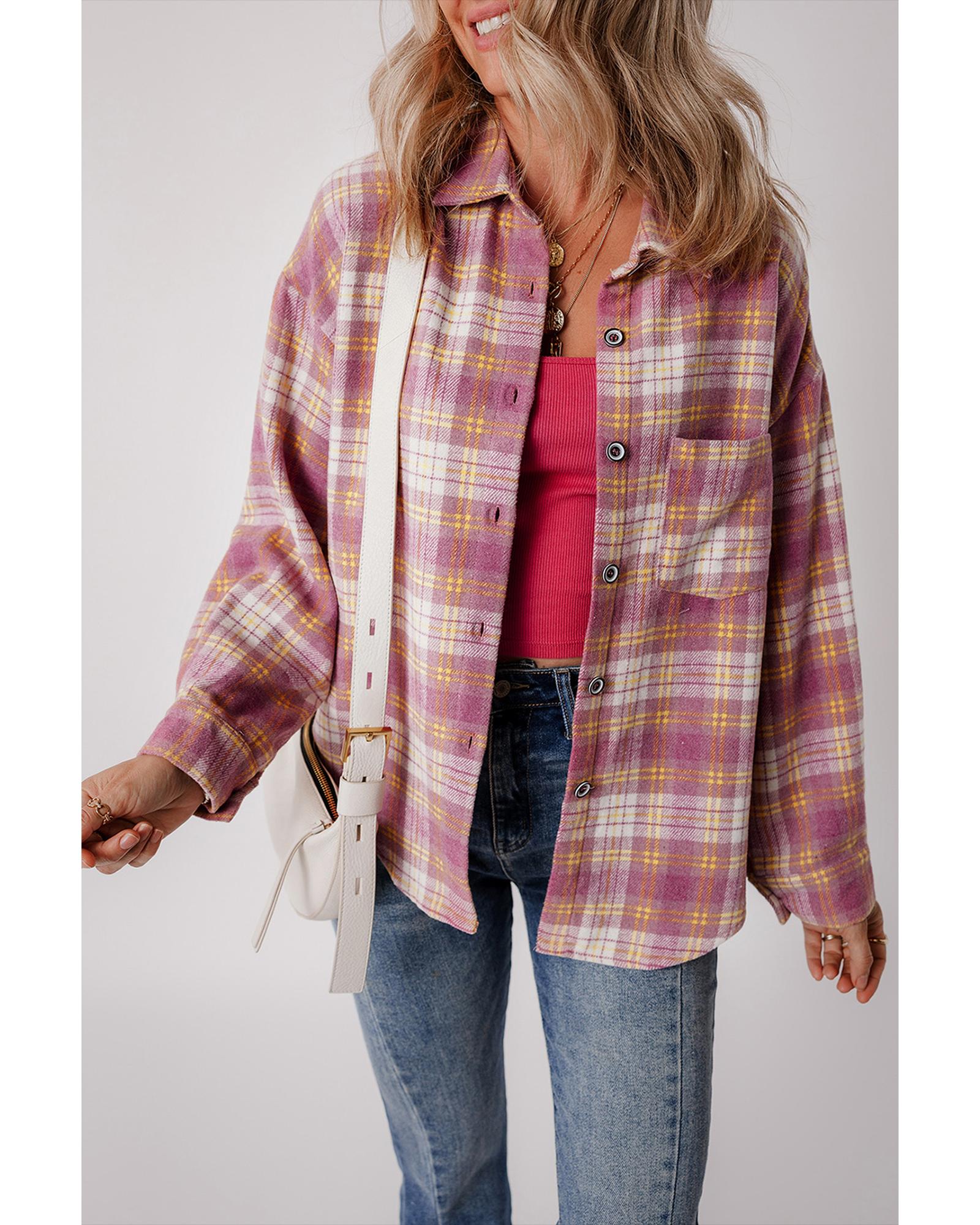 Pink Plaid Print Chest Pocket Long Sleeve Shacket – L