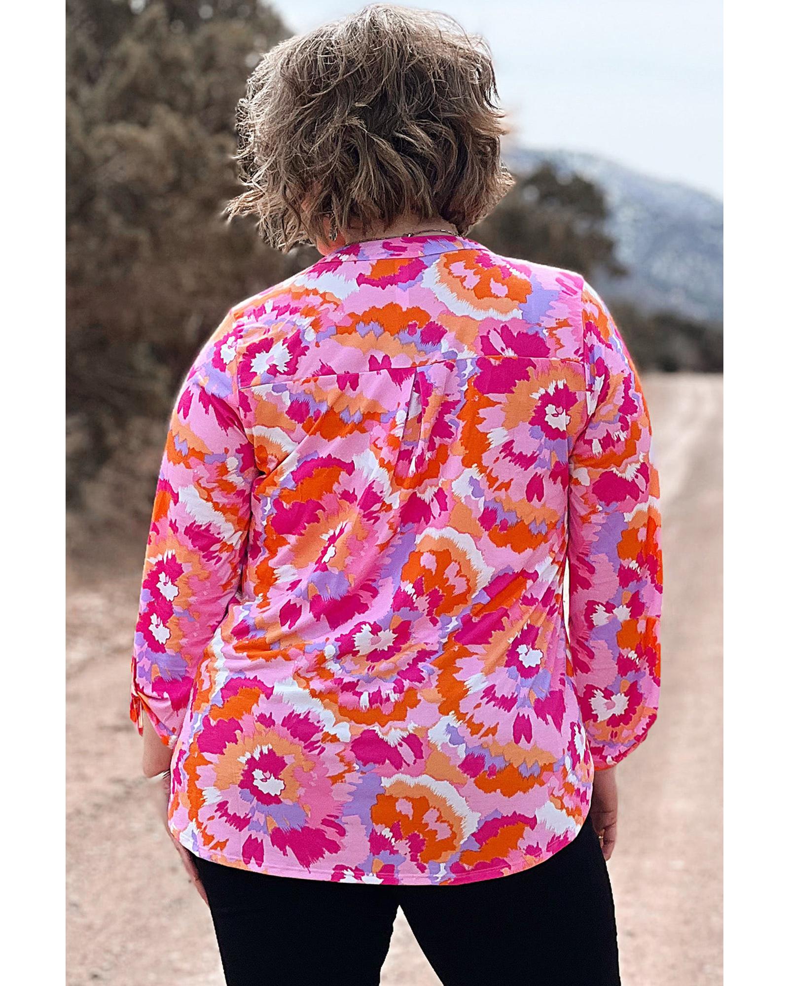 Pink Plus Size Abstract Floral Print V Neck Blouse – 2X