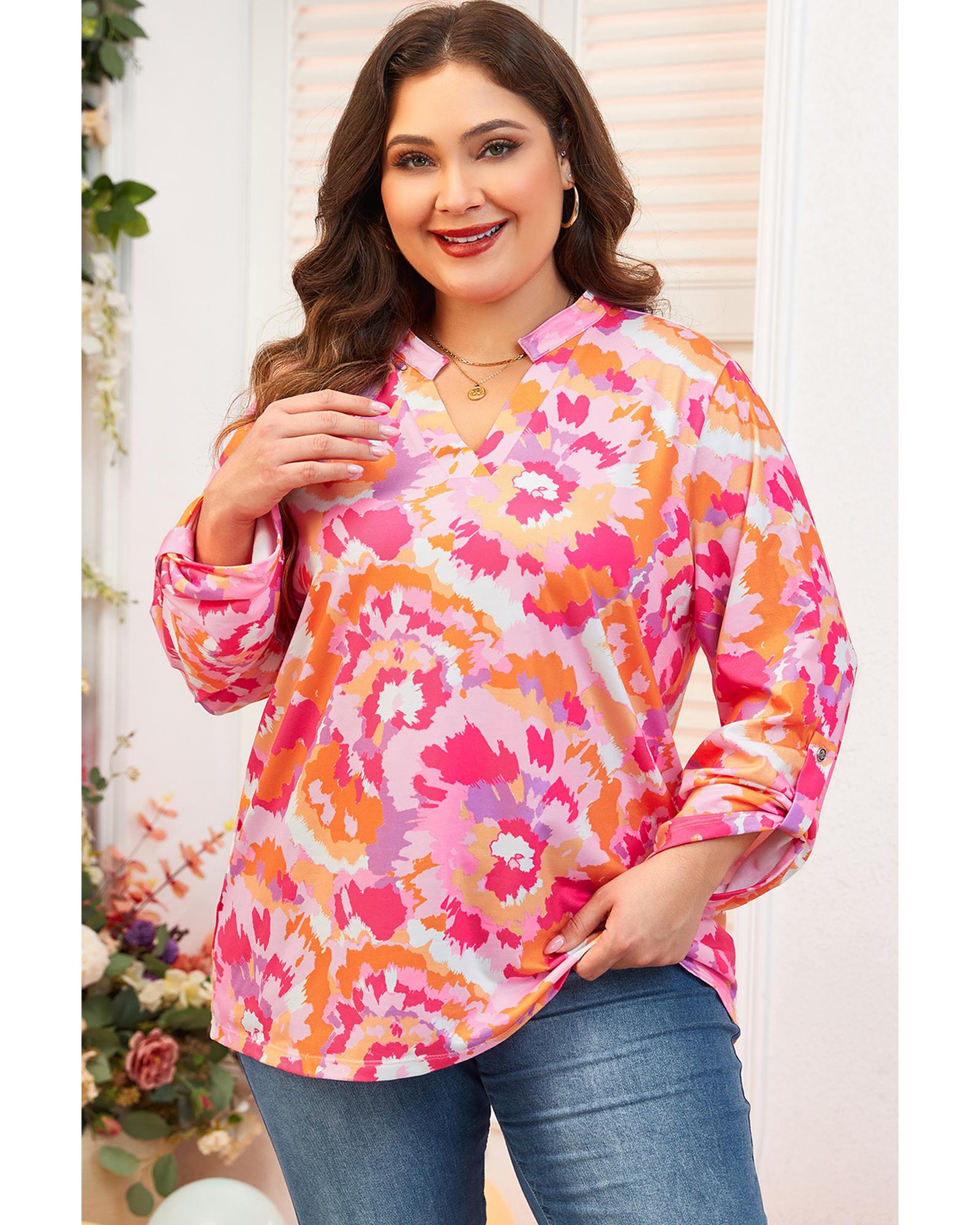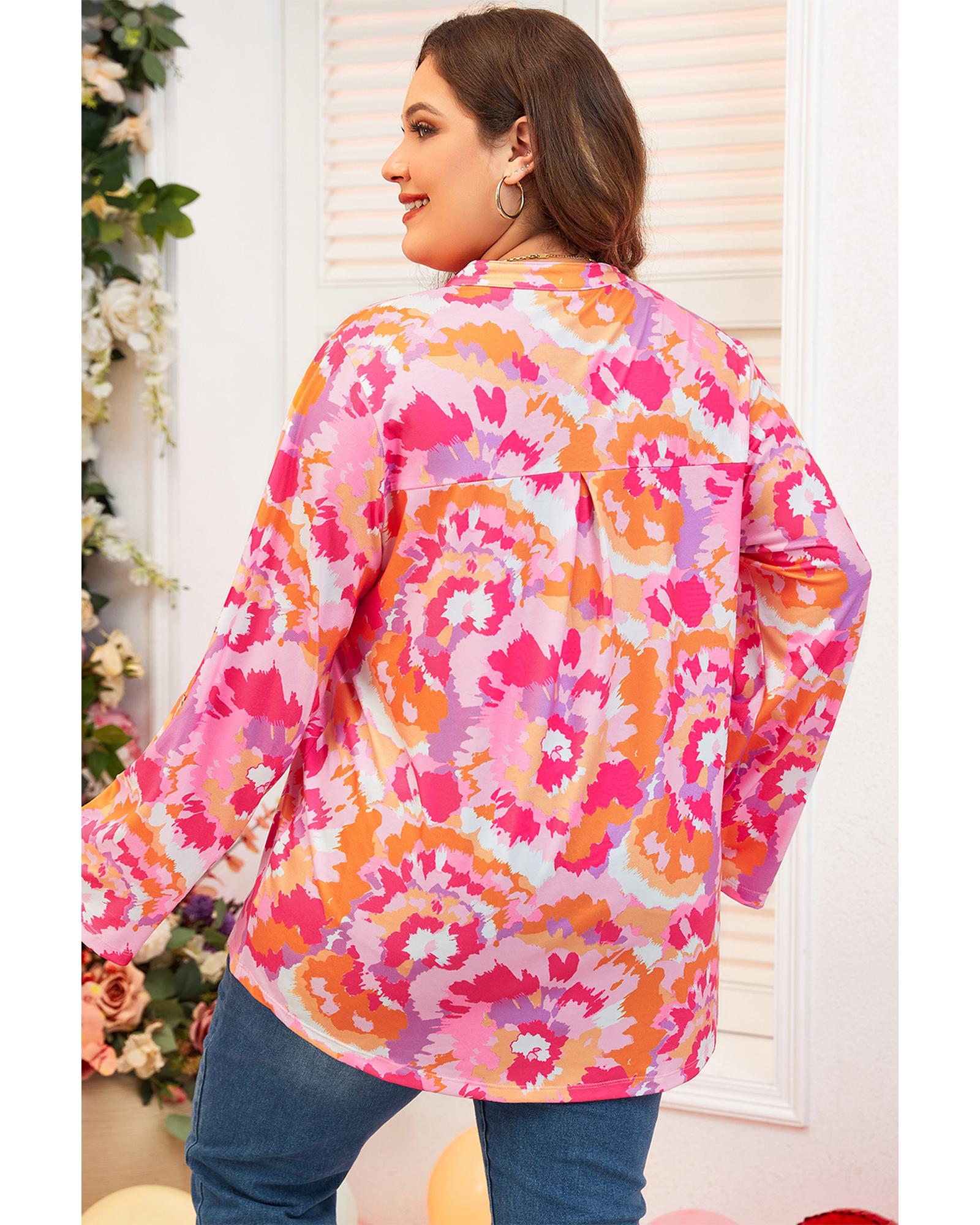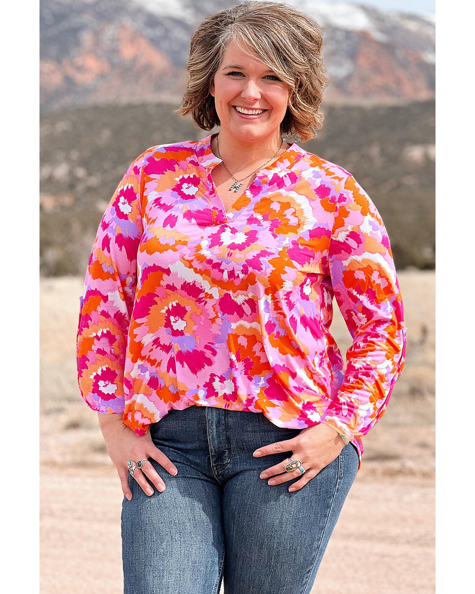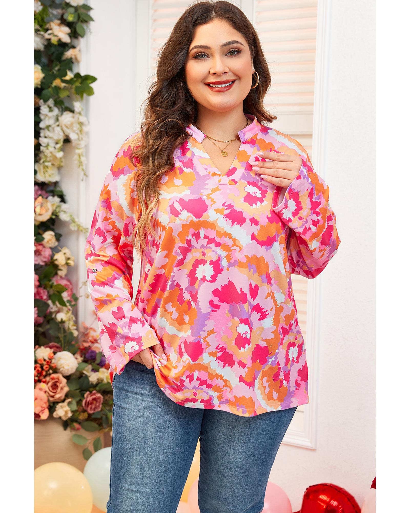 Pink Plus Size Abstract Floral Print V Neck Blouse – 3X