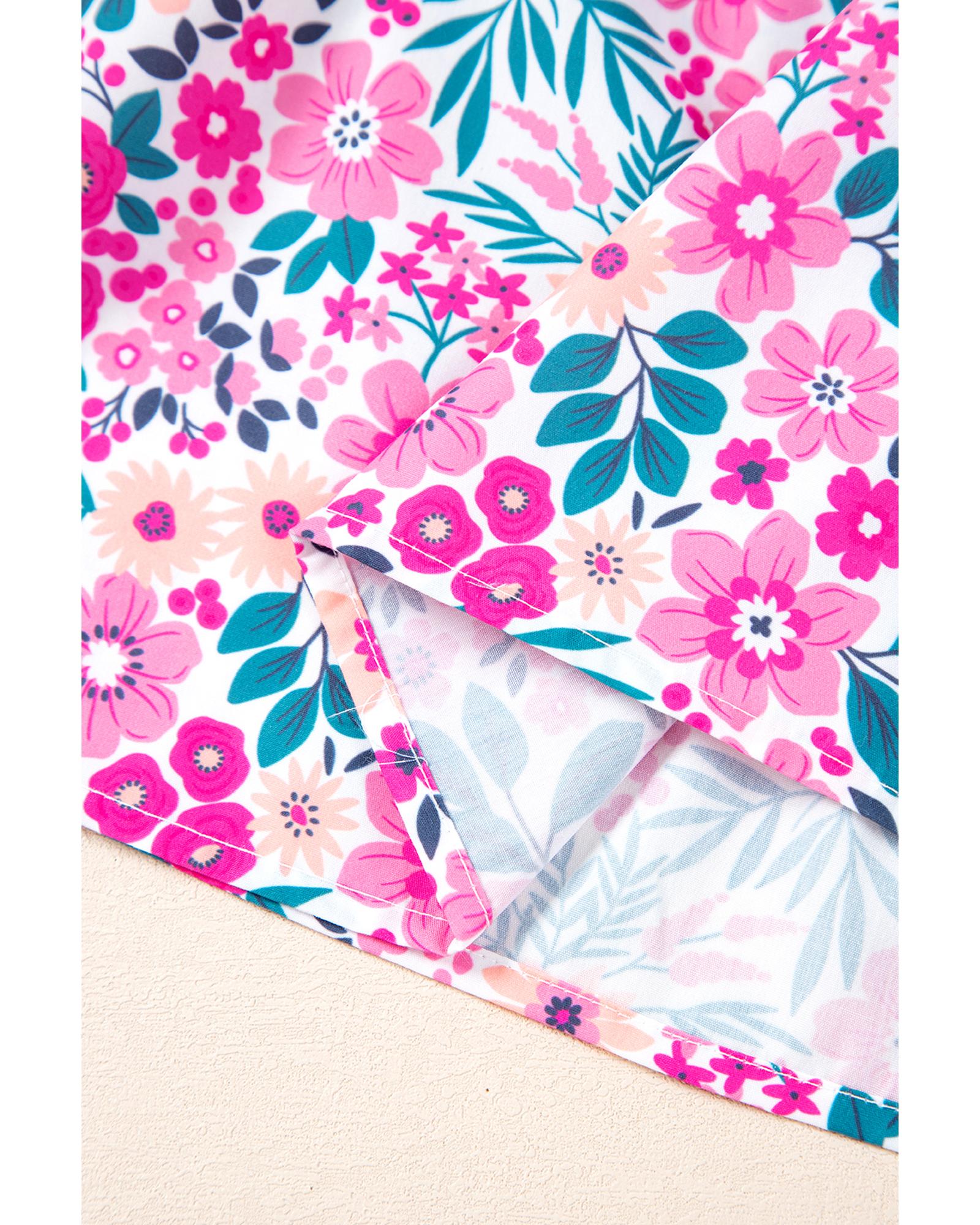 - Pink Plus Size Floral Half Button Short Puff Sleeve A