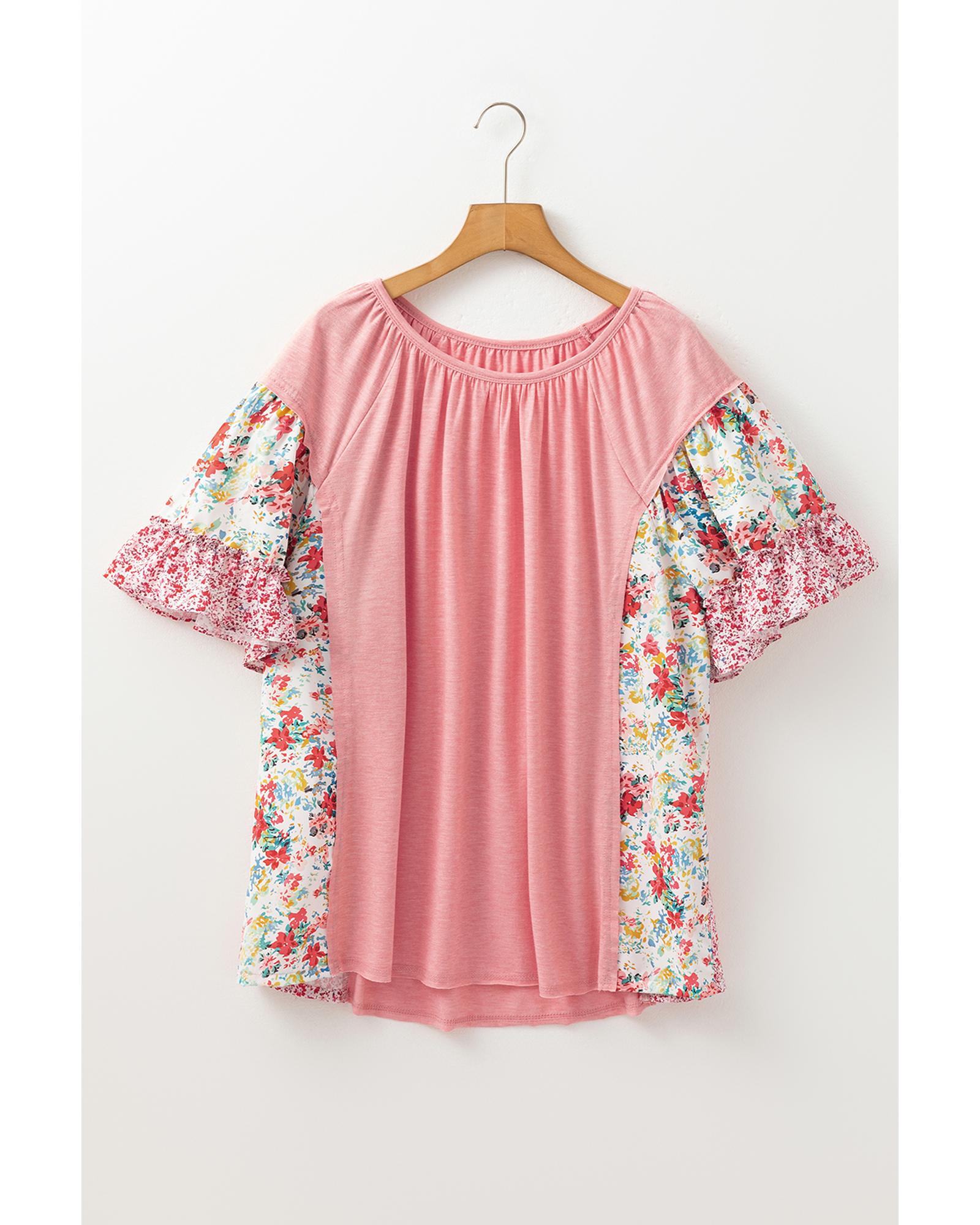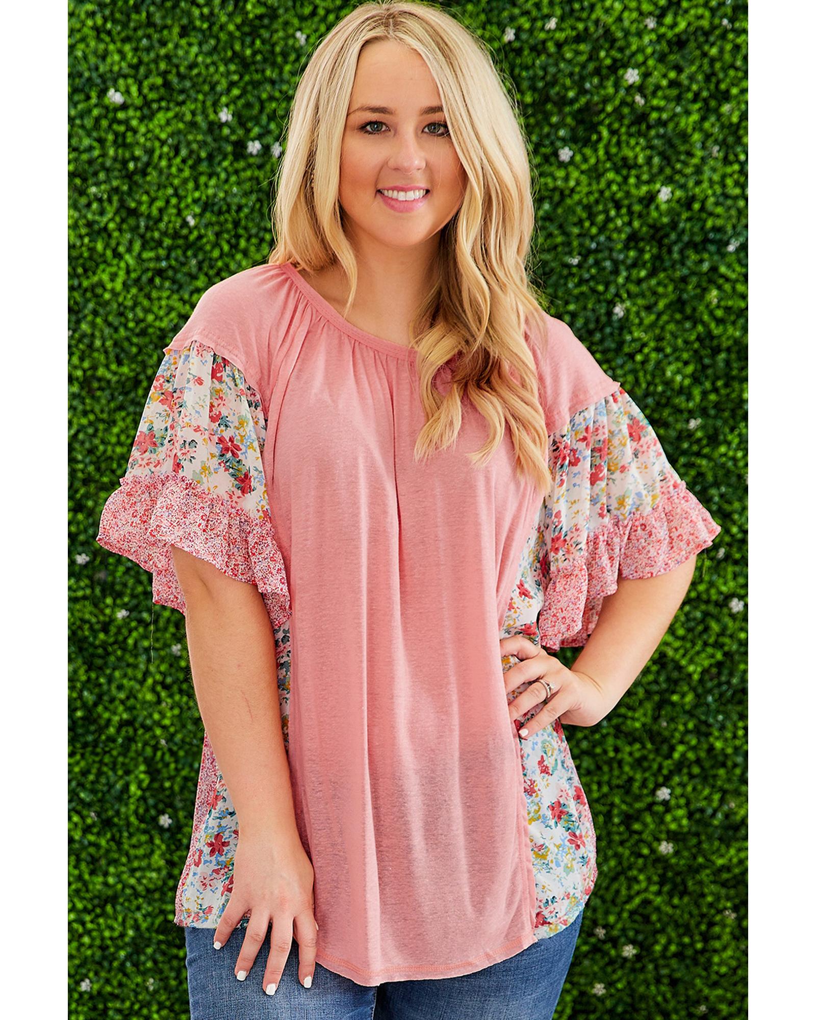 Pink Plus Size Floral Patchwork Ruffled Short Sleeve Blouse – 2X